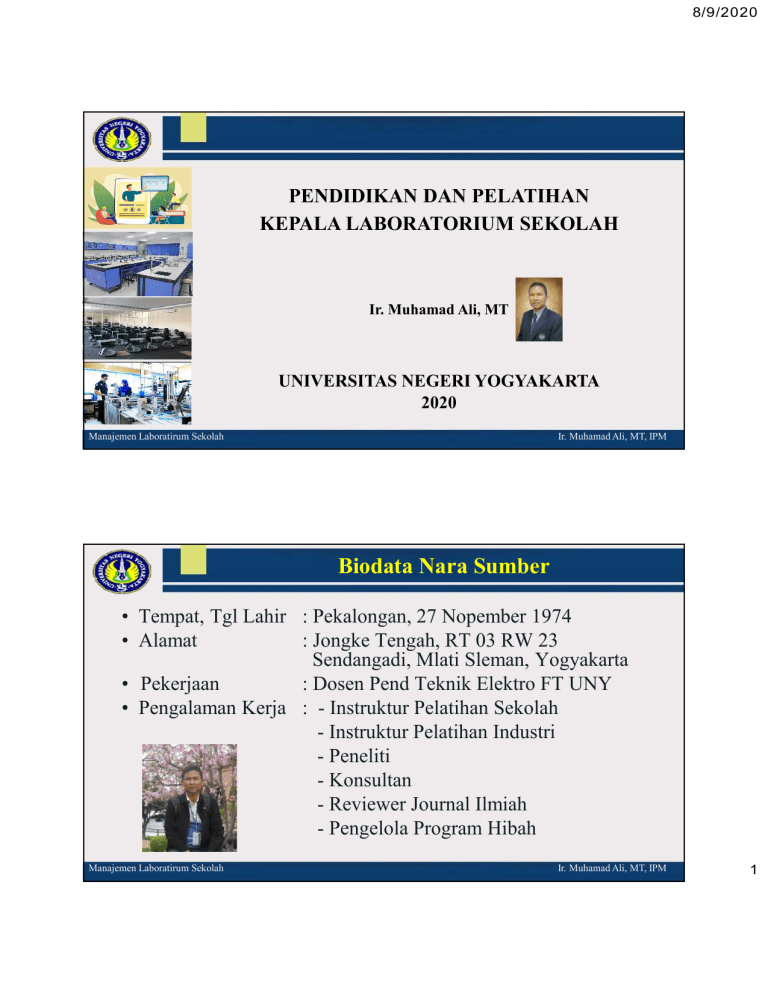 8/9/2020 PENDIDIKAN DAN PELATIHAN KEPALA LABORATORIUM SEKOLAH Ir. Muhamad Ali, MT UNIVERSITAS NEGERI YOGYAKARTA 2020 Manajemen Laboratirum Sekolah Ir. Muhamad Ali, MT, IPM Biodata Nara Sumber • Tempat, Tgl Lahir : Pekalongan, 27 Nopember 1974 • Alamat : Jongke Tengah, RT 03 RW 23 Sendangadi, Mlati Sleman, Yogyakarta • Pekerjaan : Dosen Pend Teknik Elektro FT UNY • Pengalaman Kerja : - Instruktur Pelatihan Sekolah - Instruktur Pelatihan Industri - Peneliti - Konsultan - Reviewer Journal Ilmiah - Pengelola Program Hibah Manajemen Laboratirum Sekolah Ir. Muhamad Ali, MT, IPM 1 8/9/2020 Harapan Workshop SEBELUM SESUDAH PRESENTASI Manajemen Laboratirum Sekolah Ir. Muhamad Ali, MT, IPM Pengantar • Perkembangan ICT • Globalisasi • Revolusi Industri 4.0 • Pergeseran paradigma pendidikan Manajemen Laboratirum Sekolah Ir. Muhamad Ali, MT, IPM 2 8/9/2020 Revolusi Industri Mekanisasi Manajemen Laboratirum Sekolah Elektrifikasi Otomatisasi Otonomi Ir. Muhamad Ali, MT, IPM Tantangan Revolusi Industri 4.0 3 8/9/2020 Revolusi Industri 4.0 • • • • • • • • • • • Everything Online (Dunia Maya) Digital Economy Internet of Things Artificial Intelligence (AI) Big Data Robotic Print 3D Disruptive Technology Otonomous Machine Machine Learning Dll Manajemen Laboratirum Sekolah Ir. Muhamad Ali, MT, IPM Arah Perkembangan Manajemen Laboratirum Sekolah Ir. Muhamad Ali, MT, IPM 4 8/9/2020 Perubahan Skill Tenaga Kerja 2015 2020 2022 • • • • • • • • • • • • • • • • • • • • • Complex Problem-solving Coordination with Others People Management Critical Thinking Negotiation Quality Control Service Orientation Judgment and Decision Making Active Learning Creativity Manajemen Laboratirum Sekolah Complex Problem-solving Critical Thinking Creativity People Management Coordination with Others Emotional Intelligence Judgment and Decision Service Orientation Negotiation Cognitive Flexibility • • • • • • • • • Analytical thinking and innovation Active learning and learning strategies Creativity, originality, and initiative Technology design and programming Critical thinking and analysis Complex problem-solving Leadership and social influence Emotional intelligence Reasoning, problem-solving Systems analysis and evaluation Ir. Muhamad Ali, MT, IPM Kebutuhan Skill Abad 21 Manajemen Laboratirum Sekolah Ir. Muhamad Ali, MT, IPM 5 8/9/2020 Pandemic Covid19 • • • • • • • • • • • • COVID19 adalah penyakit menular Penularannya sangat mudah dan cepat Belum ditemukan Vaksin Belum ditemukan Obat Jumlah pasien terus bertambah Himbauan WHO untuk menerapkan Protokol kesehatan Cuci tangan, pakai masker, stay di rumah Kebijakan pemerintah social distancing dan penutupan fasilitas umum Sekolah dan PT ditutup Pembelajaran dianjurkan dilakukan jarak jauh secara daring Bagaimana kegiatan pembelajaran di sekolah??? Bagaimana pengelolaan Laboratorium/Bengkel Sekolah? Manajemen Laboratirum Sekolah Ir. Muhamad Ali, MT, IPM Perubahan Paradigma Pendidikan Pandangan Lama Isi (Materi) Guru/Dosen INDIKATOR Fokus Pemilik Pandangan Baru Proses Siswa/Mahasiswa Apa Ekspektasi Siapa dan Bagaimana Ahli Peran Guru Fasilitator Pasif Mahasiswa Generator Menakutkan Kesalahan Sarana Belajar Terprogram Kondisi Kelas Teori Manajemen Laboratirum Sekolah Titik Berat Fleksibel Melakukan Sesuatu Ir. Muhamad Ali, MT, IPM 6 8/9/2020 Tantangan Pembelajaran Revolusi Industri 4.0 • BUKAN BAGAIMANA GURU MENGAJAR DENGAN BAIK (TEACHER CENTER) TRANSFER OF KNOWLEDGE • MELAINKAN BAGAIMANA SISWA BISA BELAJAR DENGAN BAIK DAN BERKELANJUTAN • (STUDENT CENTERED LEARNING) METHOD OF INQUIRY AND DISCOVERY Belajar berarti mencari dan mengkonstruksi pengetahuan lewat berbagai strategi Dunia kerja membutuhkan softskills & hardskills Tidak semua hal perlu diajarkan, tapi semua hal bisa dipelajari. Manajemen Laboratirum Sekolah Ir. Muhamad Ali, MT, IPM Paradigma Pembelajaran • Belajar bukan hanya menerima pengetahuan, bersifat pasif-reseptif • Belajar adalah mencari dan mengkonstruksi pengetahuan lewat berbagai strategi Teacher Centered Learning Belajar adalah berubah Manajemen Laboratirum Sekolah Ir. Muhamad Ali, MT, IPM 7 8/9/2020 Model Pembelajaran (UU Sisdiknas No. 20 tahun 2003 dan Permendikbud 103 Tahun 2014) Pendekatan saintifik dan Student Center Learning seperti: 1. Small Group Discussion 2. Role-Play & Simulation 3. Case Study 4. Discovery Learning (DL) 5. Self-Directed Learning (SDL) 6. Cooperative Learning (CL) 7. Collaborative Learning (CbL) 8. Contextual Instruction (CI) 9. Project Based Learning (PjBL) 10.Problem Based Learning and Inquiry (PBL) PENDIDIK INTERAKSI SUMBER BELAJAR PESERTA DIDIK Manajemen Laboratirum Sekolah Ir. Muhamad Ali, MT, IPM Pemilihan Model Pembelajaran METODE/ MODEL PEMBELAJARAN RUMUSAN KEMAMPUAN (Contoh) CERAMAH SEMINAR / DISKUSI PRAKTIKUM PROBLEM BASE LEARNING PROJECT BASE LEARNING COLLABORATIVE LEARNING SIMULASI …. Kemampuan komunikasi Menginstalasi Motor Listrik Menumbuhkan Jiwa Usaha Model- model pembelajaran 1. 2. 3. 4. 5. Manajemen Laboratirum Sekolah Small Group Discussion Role-Play & Simulation Case Study Discovery Learning (DL) Self-Directed Learning (SDL) 6. 7. 8. 9. 10. Cooperative Learning (CL) Collaborative Learning (CbL) Contextual Instruction (CI) Project Based Learning (PjBL) Problem Based Learning and Inquiry (PBL) Ir. Muhamad Ali, MT, IPM 8 8/9/2020 Sistem Pembelajaran Dokumen Kurikulum PENGEMBANGAN (ACT) PELAKSANAAN (DO) PERENCANAAN (PLAN) Guru Rencana Pembelajaran Sumber belajar Pengembangan Pembelajaran Siswa EVALUASI PROGRAM PEMBELAJARAN (CHECK) Manajemen Laboratirum Sekolah Ir. Muhamad Ali, MT, IPM Pemilihan Model Pembelajaran METODE/ MODEL PEMBELAJARAN RUMUSAN KEMAMPUAN (Contoh) CERAMAH SEMINAR / DISKUSI PRAKTIKUM PROBLEM BASE LEARNING PROJECT BASE LEARNING COLLABORATIVE LEARNING SIMULASI …. Kemampuan komunikasi Menginstalasi Motor Listrik Menumbuhkan Jiwa Usaha Model- model pembelajaran 1. 2. 3. 4. 5. M