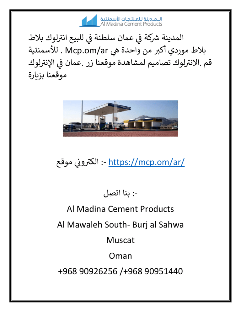 المدينة رشكة في عمان سلطنة في للبيع ر انتلوك بالط بالط موردي أكتي من واحدة هي . Mcp.om/arلألسمنتية .االنتلوك تصاميم لمشاهدة موقعنا زر .عمان في ر ر اإلنتلوك قم موقعنا بزيارة :- https://mcp.om/ar/ر الكتوني موقع :بنا اتصلAl Madina Cement Products Al Mawaleh South- Burj al Sahwa Muscat Oman +968 90926256 /+968 90951440