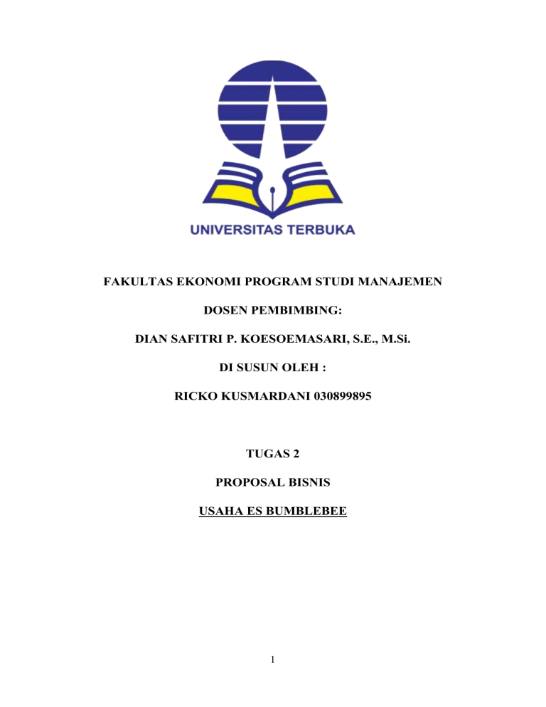 FAKULTAS EKONOMI PROGRAM STUDI MANAJEMEN DOSEN PEMBIMBING: DIAN SAFITRI P. KOESOEMASARI, S.E., M.Si. DI SUSUN OLEH : RICKO KUSMARDANI 030899895 TUGAS 2 PROPOSAL BISNIS USAHA ES BUMBLEBEE 1 A. JUDUL PROPOSAL : ES BUMBLEBEE B. EXECUTIVE SUMMARY 1. Konsep Bisnis “Es Bumblebee” adalah minuman yang menyegarkan dan juga menyehatkan. Berbahan dasar susu dan madu, lengkap dengan bubble yang kenyal dan segar. Penjualan es bubble ini direncanakan setiap weekend di depan perumahan permata depok, mulai pukul 16.00 sampai pukul 21.00 WIB. 2. Tim Manajemen Adapun usaha “Es Bubble Milo” ini merupakan kolaborasi dari tiga orang warga setempat. Dimana kami menyetorkan sejumlah modal dengan jumlah yang berbedabeda untuk menjalankan usaha minuman kekinian ini. Untuk pembagian jumlah profit yang didapatkan akan disesuaikan dengan banyaknya modal yang disetor. Tidak hanya menjadi owner, namun kami juga akan bertugas untuk melayani pembelian dalam sistem shift setiap weekend. C. RENCANA BISNIS 1. Deskripsi Singkat Produk “Es Bumblebee” lahir dari viralnya film “Bumblebee” yang sedang tayang di bioskop-bioskop. Karena mudah untuk diingat dan rasanya juga sangat enak. Supaya lebih menarik dan menjual, maka ditambahkan bubble boba (yang meletus segar saat digigit) dan es serut. 2. Strategi Pemasaran Strategi Produk Mengapa “Es Bumblebee” lebih unggul dibandingkan minuman berbahan buble lainnya? Karena adanya campuran susu dan madu ditambah Boba yang renyah dan segar menjadi tambahan rasa yang unik. Apalagi Boba memiliki banyak rasa buah, seperti jeruk, melon, strawberry, dan masih banyak lagi. Strategi Harga Karena sasaran penjualannya kalangan warga setempat, maka harga dipastikan terjangkau yakni Rp. 5.000 saja. Strategi Promosi Melakukan promosi via sosial media, juga mencetak spanduk dan brosur yang disebar di pusat keramaian. 2 Target Pasar Umumnya menjangkau semua kalangan tua dan muda. Namun target khususnya adalah warga perumahan Permata Depok. 3. Analisis Persaingan Pesaing Ada banyak pesaing yang menjual produk minuman buble, oleh sebab itu harus selalu diadakan inovasi terhadap produk. Misalnya dengan mencampurkan boba berbagai rasa. Supaya menciptakan sensasi yang lebih lezat. Posisi Dalam Persaingan Memilih lokasi untuk membuka usaha di area ruko perumahan yang belum ada pesaing, dan berpotensi memberikan lebih banyak profit. Kelebihan Dibanding Pesaing Adapun aspek yang membuat es bumblebee ini menjadi lebih menarik dibanding pesaingnya adalah campuran susu, madu dan buble yang enak. 4. Rencana Desain dan Pengembangan Tujuan Usaha Jangka Panjang Es bumblebee menjadi minuman yang hits, semua orang menyukai minuman ini dan bisa membuka banyak cabang di berbagai kawasan perumahan. Strategi Memaksimalkan promosi online dan offline supaya produk bisa dikenal konsumen lebih luas lagi. Promosi offline juga dilakukan gencar dengan memasang spanduk dan poster dengan ilustrasi menarik mengenai produk. Evaluasi Risiko Minuman buble ini tidak bisa tahan lama tanpa diletakkan di dalam lemari pendingin. Paling lama hanya 1 hari saja. 5. Rencana Operasi dan Manajemen Proses Produksi Menyediakan bahan susu kental manis, madu, bublee serta es siap serut. Dengan komposisi yang tepat, penyajian yang mudah dan cepat tentu ini bisa melayani para pembeli dengan cepat tanpa harus menunggu antrian yang lama. Pengendalian Persediaan Setiap hari disediakan 40 gelas yang akan dijual. Jika ada sisa yang tak terjual maka esok persediaan akan disesuaikan dengan penjualan hari sebelumnya. Pun demikian jika laris. 3 Kontrol Keuangan Sediakan uang pecahan untuk kembalian. Sisihkan modal dan profit untuk antispasi biaya yang tidak terduga. Keperluan pribadi tidak menggunakan uang modal. D. ANALISIS RENCANA KEUANGAN 1. Perkiraan Pendapatan Modal awal = biaya variabel + biaya tetap (biaya bahan baku x 30 hari) + biaya tetap (Rp 100.000 × 30 hari) + Rp 2.600.000 Rp 3.000.000 + Rp 2.600.000 Rp 5.600.000 Hasil penjualan per bulan = target penjualan harian x harga jual per gelas x 30 hari 40 gelas x Rp 5.000 x 30 hari Rp 6.000.000 Laba Hasil penjualan dikurangi modal awal Rp 6.000.000 – Rp 5.600.000 Jadi laba Rp 400.000 2. Perkiraan Pengeluaran Per Hari Bahan baku (sesuaikan dengan besaran modal yang anda keluarkan per hari) Peralatan (termasuk gerobak dagang dan spanduk jualan) 3. Sumber Modal dan Penggunaan Adapun usaha”Es Bumblebee” ini memiliki modal dari ketiga owner ditambah dengan pinjaman dari bank. Sehingga memiliki kewajiban untuk membayar cicilan di setiap bulan. Oleh karena itu, profit yang didapatkan setiap hari akan dialokasikan untuk pembagian owner dan untuk mencicil pinjaman ke bank. 4 5