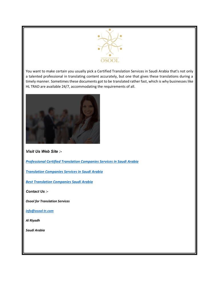 You want to make certain you usually pick a Certified Translation Services in Saudi Arabia that's not only a talented professional in translating content accurately, but one that gives these translations during a timely manner. Sometimes these documents got to be translated rather fast, which is why businesses like HL TRAD are available 24/7, accommodating the requirements of all. Visit Us Web Site :Professional Certified Translation Companies Services in Saudi Arabia Translation Companies Services in Saudi Arabia Best Translation Companies Saudi Arabia Contact Us :Osool for Translation Services info@osool-tr.com Al Riyadh Saudi Arabia