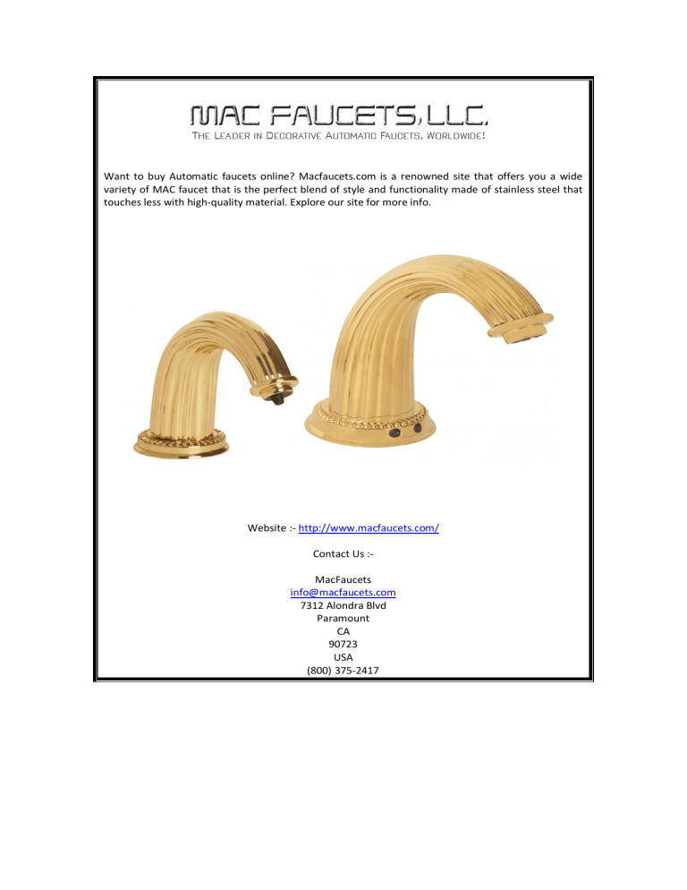 Want to buy Automatic faucets online? Macfaucets.com is a renowned site that offers you a wide variety of MAC faucet that is the perfect blend of style and functionality made of stainless steel that touches less with high-quality material. Explore our site for more info. Website :- http://www.macfaucets.com/ Contact Us :MacFaucets info@macfaucets.com 7312 Alondra Blvd Paramount CA 90723 USA (800) 375-2417