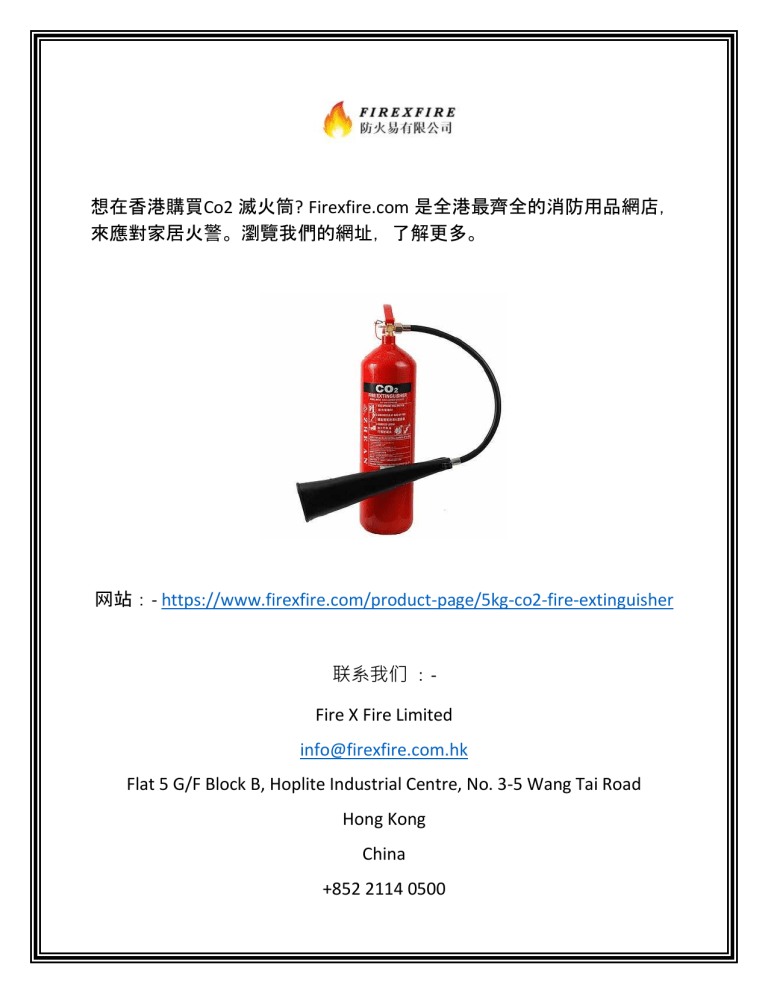想在香港購買Co2 滅火筒? Firexfire.com 是全港最齊全的消防用品網店, 來應對家居火警。瀏覽我們的網址,了解更多。 网站:- https://www.firexfire.com/product-page/5kg-co2-fire-extinguisher 联系我们 :Fire X Fire Limited info@firexfire.com.hk Flat 5 G/F Block B, Hoplite Industrial Centre, No. 3-5 Wang Tai Road Hong Kong China +852 2114 0500