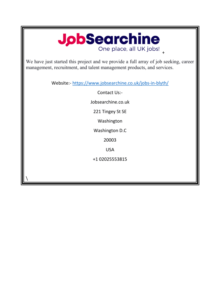 + We have just started this project and we provide a full array of job seeking, career management, recruitment, and talent management products, and services. Website:- https://www.jobsearchine.co.uk/jobs-in-blyth/ Contact Us:Jobsearchine.co.uk 221 Tingey St SE Washington Washington D.C 20003 USA +1 02025553815 \
