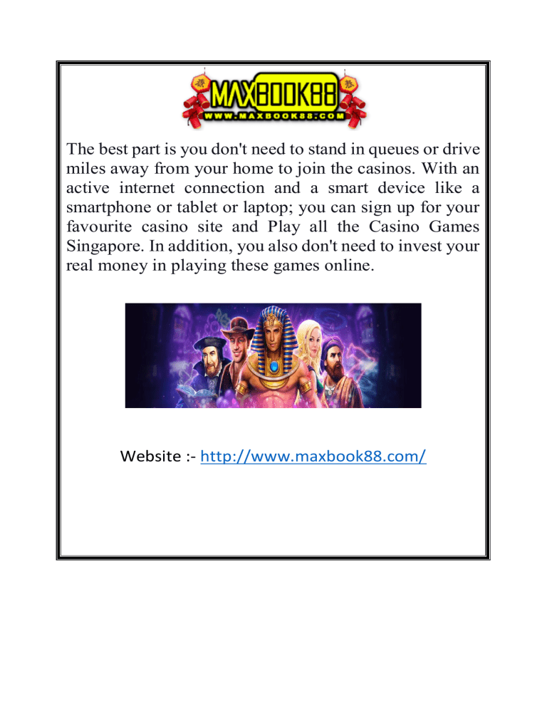 The best part is you don't need to stand in queues or drive miles away from your home to join the casinos. With an active internet connection and a smart device like a smartphone or tablet or laptop; you can sign up for your favourite casino site and Play all the Casino Games Singapore. In addition, you also don't need to invest your real money in playing these games online. Website :- http://www.maxbook88.com/