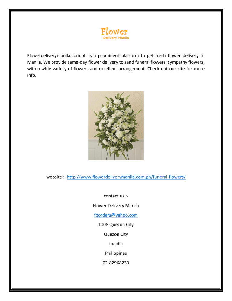 Flowerdeliverymanila.com.ph is a prominent platform to get fresh flower delivery in Manila. We provide same-day flower delivery to send funeral flowers, sympathy flowers, with a wide variety of flowers and excellent arrangement. Check out our site for more info. website :- http://www.flowerdeliverymanila.com.ph/funeral-flowers/ contact us :Flower Delivery Manila fborders@yahoo.com 1008 Quezon City Quezon City manila Philippines 02-82968233