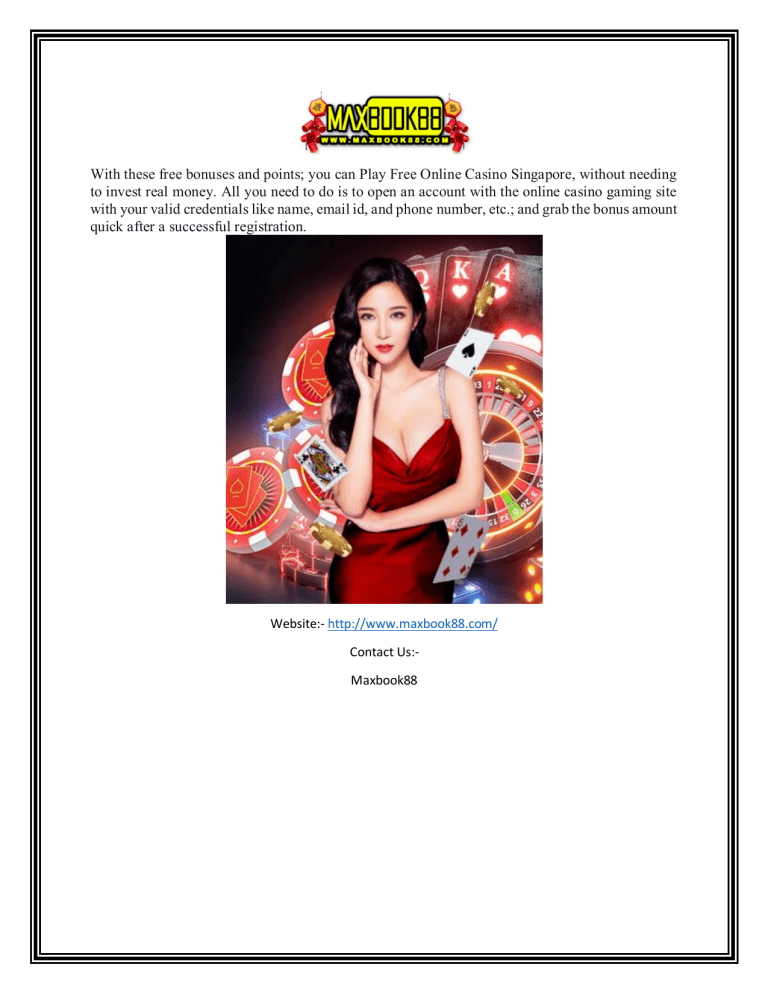 With these free bonuses and points; you can Play Free Online Casino Singapore, without needing to invest real money. All you need to do is to open an account with the online casino gaming site with your valid credentials like name, email id, and phone number, etc.; and grab the bonus amount quick after a successful registration. Website:- http://www.maxbook88.com/ Contact Us:Maxbook88