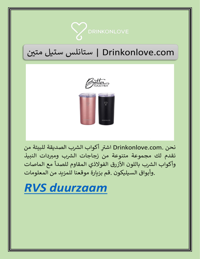 | Drinkonlove.comستانلس ستيل متيِ اشت أكواب ر ن الشب الصديقة للبيئ ِة م ِ رِ نحن Drinkonlove.com. نقدم لك مجموعة متنوعة من زجاجات ر ومتدات النبيذِ الشب ر وأكواب ر الشب باللون األزرق الفوالذي المقاوم للصدأ م ِع الماصات ن .قم بزيارة موقعنِا للمزيد من المعل ِومات .وأبواق السيليكو ِ RVS duurzaam
