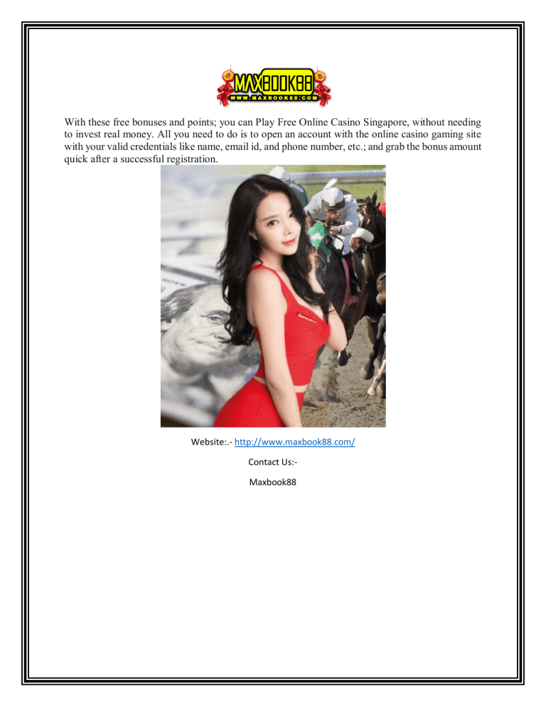 With these free bonuses and points; you can Play Free Online Casino Singapore, without needing to invest real money. All you need to do is to open an account with the online casino gaming site with your valid credentials like name, email id, and phone number, etc.; and grab the bonus amount quick after a successful registration. Website:.- http://www.maxbook88.com/ Contact Us:Maxbook88