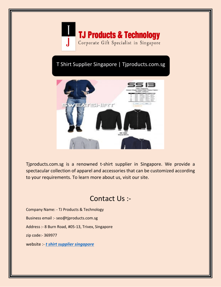 T Shirt Supplier Singapore | Tjproducts.com.sg Tjproducts.com.sg is a renowned t-shirt supplier in Singapore. We provide a spectacular collection of apparel and accessories that can be customized according to your requirements. To learn more about us, visit our site. Contact Us :Company Name: - TJ Products & Technology Business email :- seo@tjproducts.com.sg Address :- 8 Burn Road, #05-13, Trivex, Singapore zip code:- 369977 website :- t shirt supplier singapore
