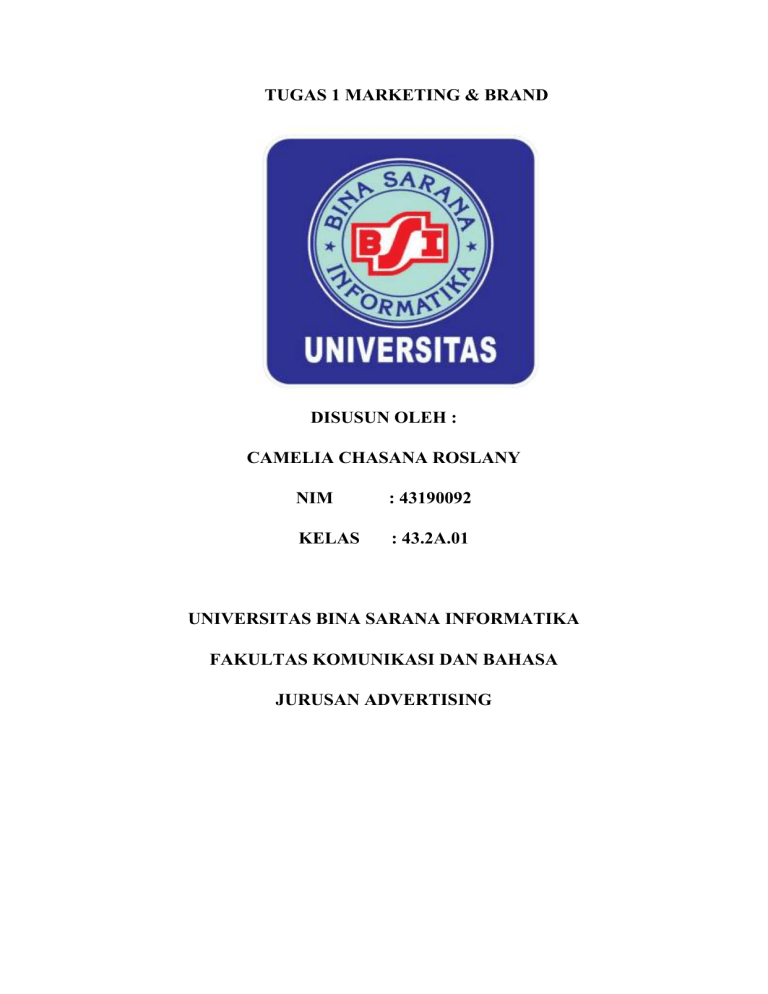 TUGAS 1 MARKETING & BRAND DISUSUN OLEH : CAMELIA CHASANA ROSLANY NIM : 43190092 KELAS : 43.2A.01 UNIVERSITAS BINA SARANA INFORMATIKA FAKULTAS KOMUNIKASI DAN BAHASA JURUSAN ADVERTISING 1. Buatlah Table Diferensiasi Produk dari Brief dibawah ini! Brief Produk Klien : Butik Produk : Pakaian wanita (Blouse and Dress) Brand : Chandi Butik Chandi merupakan butik wanita yang menjual blouse, dress, abaya, vest, kemeja, celana pendek dan selendang. Chandi merupakan butik yang elegan dengan mengunggulkan desain yang simple, untuk memperlihatkan sisi kecantikan konsumen, bahan yang lebih berkualitas dengan menggunakan Produk bahan cotton rayon untuk jenis blouse. Cotton rayon merupakah bahan yang lembut, menyerap keringat serta mudah untuk disetrika dan lebih banyak digunakan untuk pembuatan kaos, sedangkan Voile merupakan kain cantik yang berkerut, tetapi merupakah bahan yang tidak berbulu dan menyerap keringat sedangkan saten sutra merupakan bahan yang tergolong mewah, dengan kualitas prima tetapi tidak bisa untuk sembarangan dicuci karena bisa menjadi mengecil, bahan saten sutra mudah untuk disetrika, nyaman dipakai dan lembut serta tidak berbulu. Promosi yang sudah dilakukan melalui mulut ke mulut dan event dengan cara jika pembelian dalam jumlah besar akan mendapat potongan harga. Event yang pernah Chandi ikuti yaitu Jakarta Fashion World 2010 di Mall JCC, dan juga Inacraft 20-24 April 2012, Fashion ‘n Craft 29 Juni – 03 Juli, Wic’s Bazaar Juga mengadakan garage sale di akhir tahun. Karena dengan hidup masyarakat yang bersosialita dan cosmopolitan, maka banyak masyarakat yang mempromosikan produk Chandi dari mulut ke mulut. Hal ini menjadikan Chandi lebih dikenal oleh masyarakat. Banyak masyarakat yang menginginkan baju yang siap pakai, simpel dan murah, ini juga menjadikan Chandi lebih dipromosikan lagi oleh masyarakat. Di dalam penjualan produk Chandi juga memiliki beberapa pesaing yang juga memiliki produk hampir sama di dalamnya dan penjualan secara online seperti Gaudi dan BlinkBlink Butik. Pangsa pasar Gaudi lebih pesat karena sudah banyak memiliki outlet yang 20 tersebar luas di beberapa kota di Indonesia sedangkan pangsa pasar Blink-Blink Butik lebih sedikit dibanding dengan Chandi karena tidak memiliki outlet resmi dan harga yang ditawarkan lebih mahal dibanding Chandi dan Gaudi. Persaingan yang kompetitif tersebut menjadikan motivasi bagi Chandi untuk terus meningkatkan kualitas untuk memperluas pangsa pasar di Indonesia. Produk yang dibuat oleh Chandi lebih dominan menggunakan bahan cotton rayon untuk jenis blouse. Cotton rayon merupakah bahan yang lembut, menyerap keringat serta mudah untuk disetrika dan lebih banyak digunakan untuk pembuatan kaos, sedangkan Voile merupakan kain cantik yang berkerut, tetapi merupakah bahan yang tidak berbulu dan menyerap keringat sedangkan saten sutra merupakan bahan yang tergolong mewah, dengan kualitas prima tetapi tidak bisa untuk sembarangan dicuci karena bisa menjadi mengecil, bahan saten sutra mudah untuk disetrika, nyaman dipakai dan lembut serta tidak berbulu. Pemilihan bahan tergantung dari desain dan juga jenis baju yang ingin di buat sehingga tidak semua blouse menggunakan cotton rayon. 40% dari produk Chandi terdapat Blouse, 30% untuk dress, 10% untuk abaya dan 5% untuk vest, 3% celana pendek dan 2% untuk selendang. Perubahan yang Chandi lakukan sudah terjadi sekitar Juli 2010, sejak awal produksi Chandi lebih banyak memproduksi abaya dari pada lainnya dikarenakan saat itu sangat trend di kalangan wanita Jakarta. Semakin lama Chandi lebih dominan kepada dress dan blouse karena bagi para konsumen blouse lebih mudah dipadu padankan dengan jeans ataupun rok dari pada abaya yang hanya bisa digunakan untuk acara pengajian saja. Harga produk di Butik Chandi dapat dikategorikan sebagai berikut, yaitu: 1) Blouse Rp. 200.000,- s/d Rp. 300.000,- 2) Dress Rp. 300.000,- s/d Rp. 500.000,- 3) Abaya Rp.500.000,- s/d Rp. 900.000,- 4) Vest Celana pendek Rp. 150.000,- s/d Rp. 250.000,- 5) Rp. 250.000,- s/d Rp. 500.000,- 6) Kemeja Rp. 200.000,- s/d Rp. 350.000,- 7) Selendang Rp. 150.000,- s//d Rp. 200.000,Produk Chandi diproduksi di Jl. Kalibata Utara2 no.102 Buncit, Jakarta Selatan, setelah diproduksi, Chandi didistribusikan ke Jl. Teuku Umar no. 61 Menteng, Jakarta Pusat untuk proses penempatan produk yang sudah siap jual. Chandi belum memiliki outlet sehingga rumah kediaman Ibu Shanti diubah menjadi tempat untuk penjualan produk. Kompetitor A. Gaudi Gaudi beranggapan bahwa busana harus meningkatkan kecantikan dalam diri kita sendiri. Dan Gaudi tahu bahwa kecantikan tidak datang dengan harga yang murah dan singkat. Setiap hari harus mengenakan makeup dan juga memilih busana yang tepat untuk digunakan beserta dengan aksesorisnya. Gaudi bertekad untuk menyediakan semua kebutuhan dalam mode gaun yang sederhana dan seksi, atasan, celana dan aksesoris yang menarik. Gaudi memiliki penata ahli dalam masalah desain dan memiliki pelayanan yang sangat memuaskan dan juga memiliki konsep toko yang bagus yang menjadikan para pelanggan merasa nyaman berbelanja di Gaudi. Gaudi mempunyai tagline “ Kecantikan dengan Kebaikan” dan selalu berusaha menjadi yang terbaik untuk para shopaholic. Gaudi melakukan promosi berupa potongan harga, buy one get one dan juga dan promosi-promosi lainnya untuk hari-hari besar seperti Idul fitri, natal, imlek dan sebagainya. Harga yang ditawarkan Gaudi antara lain : 1) Oversized Blazer : Rp. 258.000 2) Cardigan : Rp. 158.000 3) Blouse tanpa lengan : Rp. 111.000 4) Blouse Rajut : Rp. 178.000 5) Rok Maksi : Rp. 140.000 6) Dress Tutu : Rp. 140.000 B. Blink-Blink butik Berawal dengan membuat online shop di jejaring sosial facebook pada tahun Juni 2009 sampai dengan saat ini blink blink butik menyediakan kebutuhan fashion para wanita seperti tas, pakaian dan aksesoris sampai dengan kosmetik. Semua produk ada yang impor langsung maupun lokal dengan kualitas baik. Untuk memudahkan dan menambahkan pelayanan kepada pelanggan kami membuat