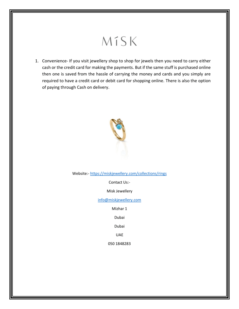 1. Convenience- If you visit jewellery shop to shop for jewels then you need to carry either cash or the credit card for making the payments. But if the same stuff is purchased online then one is saved from the hassle of carrying the money and cards and you simply are required to have a credit card or debit card for shopping online. There is also the option of paying through Cash on delivery. Website:- https://miskjewellery.com/collections/rings Contact Us:Misk Jewellery info@miskjewellery.com Mizhar 1 Dubai Dubai UAE 050 1848283