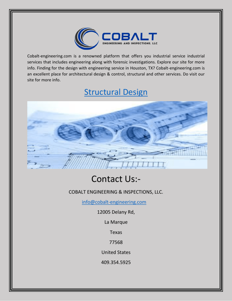 Cobalt-engineering.com is a renowned platform that offers you industrial service industrial services that includes engineering along with forensic investigations. Explore our site for more info. Finding for the design with engineering service in Houston, TX? Cobalt-engineering.com is an excellent place for architectural design & control, structural and other services. Do visit our site for more info. Structural Design Contact Us:COBALT ENGINEERING & INSPECTIONS, LLC. info@cobalt-engineering.com 12005 Delany Rd, La Marque Texas 77568 United States 409.354.5925