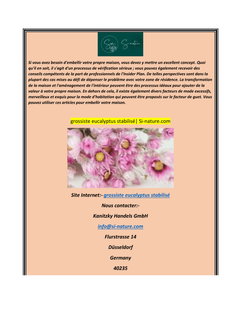 Si vous avez besoin d'embellir votre propre maison, vous devez y mettre un excellent concept. Quoi qu'il en soit, il s'agit d'un processus de vérification sérieux ; vous pouvez également recevoir des conseils compétents de la part de professionnels de l'Insider Plan. De telles perspectives sont dans la plupart des cas mises au défi de dépenser le problème avec votre zone de résidence. La transformation de la maison et l'aménagement de l'intérieur peuvent être des processus idéaux pour ajouter de la valeur à votre propre maison. En dehors de cela, il existe également divers facteurs de mode excessifs, merveilleux et exquis pour la mode d'habitation qui peuvent être proposés sur le facteur de guet. Vous pouvez utiliser ces articles pour embellir votre maison. grossiste eucalyptus stabilisé| Si-nature.com Site Internet:- grossiste eucalyptus stabilisé Nous contacter:Kanitzky Handels GmbH info@si-nature.com Flurstrasse 14 Düsseldorf Germany 40235 Germany