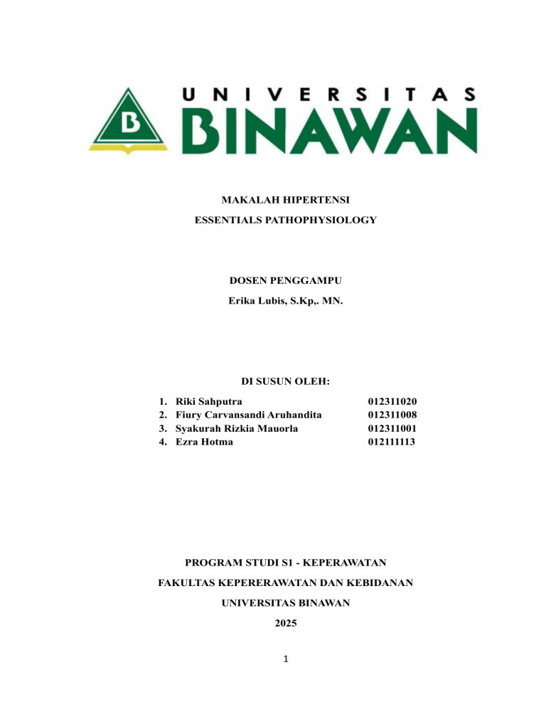 MAKALAH HIPERTENSI ESSENTIALS PATHOPHYSIOLOGY DOSEN PENGGAMPU Erika Lubis, S.Kp,. MN. DI SUSUN OLEH: 1. 2. 3. 4. Riki Sahputra Fiury Carvansandi Aruhandita Syakurah Rizkia Mauorla Ezra Hotma 012311020 012311008 012311001 012111113 PROGRAM STUDI S1 - KEPERAWATAN FAKULTAS KEPERERAWATAN DAN KEBIDANAN UNIVERSITAS BINAWAN 2025 1 KATA PENGANTAR Puji dan syukur saya panjatkan ke hadirat Tuhan Yang Maha Esa karena berkat rahmat-Nya makalah ini dapat disusun. Makalah ini disusun untuk memenuhi tugas/keperluan akademik dengan tujuan menyajikan tinjauan ilmiah yang komprehensif tentang hipertensi—meliputi definisi, etiologi, manifestasi klinis, patofisiologi (dilengkapi pathway), pemeriksaan penunjang, penatalaksanaan farmakologi dan non-farmakologi, serta komplikasi. Semoga makalah ini bermanfaat bagi mahasiswa, tenaga kesehatan, dan pembaca lain yang memerlukan ringkasan ilmiah tentang hipertensi. Kritik dan saran sangat diharapkan untuk perbaikan. Hipertensi merupakan salah satu penyakit kronis dengan prevalensi yang terus meningkat setiap tahunnya, baik di dunia, di Indonesia, maupun di wilayah perkotaan seperti DKI Jakarta. Kondisi ini menjadi tantangan serius dalam bidang kesehatan masyarakat karena dapat menimbulkan berbagai komplikasi seperti penyakit jantung koroner, stroke, dan gagal ginjal yang berdampak besar terhadap kualitas hidup individu dan produktivitas masyarakat. Melalui makalah ini, penulis berupaya memberikan gambaran menyeluruh tentang definisi, etiologi, faktor risiko, manifestasi klinis, patofisiologi, pemeriksaan penunjang, penatalaksanaan farmakologis dan nonfarmakologis, serta komplikasi hipertensi berdasarkan sumber-sumber ilmiah terkini dari jurnal dan buku keperawatan terbaru. Penulis menyadari bahwa penyusunan makalah ini tidak terlepas dari bantuan berbagai pihak. Oleh karena itu, penulis menyampaikan terima kasih yang sebesarbesarnya kepada dosen pembimbing, teman-teman sejawat, serta pihak-pihak lain yang telah memberikan bimbingan, masukan, dan dukungan selama proses penyusunan makalah ini. Semoga makalah ini dapat memberikan manfaat bagi pembaca, terutama bagi mahasiswa keperawatan dan tenaga kesehatan dalam meningkatkan pengetahuan serta kemampuan dalam pencegahan dan penatalaksanaan hipertensi di berbagai tatanan pelayanan kesehatan. Akhir kata, penulis menyadari bahwa makalah ini masih jauh dari sempurna. Oleh karena itu, kritik dan saran yang membangun sangat penulis harapkan demi perbaikan dan penyempurnaan karya tulis ilmiah di masa mendatang. Jakarta, 12 Oktober 2025 Penyusun 2 BAB I PENDAHULUAN 1.1 Latar Belakang Hipertensi merupakan salah satu masalah kesehatan global utama yang diakui oleh World Health Organization (WHO) sebagai silent killer karena sering tidak menimbulkan gejala namun berpotensi menimbulkan komplikasi serius seperti penyakit jantung, stroke, dan gagal ginjal. Secara global, lebih dari 1,28 miliar orang berusia 30–79 tahun hidup dengan hipertensi, dan sekitar 46% tidak mengetahui bahwa mereka mengidap kondisi tersebut (WHO, 2021). Faktor risiko seperti konsumsi garam berlebihan, obesitas, merokok, stres, serta kurangnya aktivitas fisik berkontribusi besar terhadap peningkatan angka kejadian. Pada tingkat regional, kawasan Asia memiliki beban hipertensi yang tinggi dan terus meningkat. Asia Tenggara dan Asia Timur mencatat prevalensi hipertensi yang lebih tinggi dibanding beberapa wilayah lainnya, dipengaruhi oleh perubahan pola makan, urbanisasi cepat, serta meningkatnya angka obesitas (Zhou,2021). Menunjukkan prevalensi hipertensi di negara-negara Asia mencapai 30–45% pada orang dewasa, sementara tingkat kontrol hipertensi masih rendah di bawah 20%, Asia menyumbang proporsi besar kematian akibat penyakit kardiovaskular yang berhubungan dengan tekanan darah tinggi, menjadikan hipertensi sebagai tantangan kesehatan masyarakat utama di kawasan ini (Kearney,2020). Di Indonesia hipertensi termasuk dalam penyakit tidak menular dengan prevalensi hipertensi mencapai 34,1% pada penduduk usia ≥18 tahun, menunjukkan tren peningkatan dibandingkan survei sebelumnya menegaskan bahwa hipertensi di Indonesia diperburuk oleh rendahnya kesadaran masyarakat untuk melakukan pemeriksaan tekanan darah serta banyaknya faktor risiko seperti obesitas, konsumsi makanan tinggi natrium, kebiasaan merokok, dan kurangnya aktivitas fisik. Selain itu, perempuan menunjukkan prevalensi lebih tinggi terutama pada mereka yang mengalami obesitas sentral (Riskesdas, 2018). Pada tingkat daerah DKI Jakarta mencatat angka hipertensi yang juga memprihatinkan prevalensi hipertensi di DKI Jakarta mencapai 22,7% menunjukkan bahwa tingginya beban hipertensi di Jakarta berkaitan erat dengan gaya hidup masyarakat perkotaan, termasuk konsumsi makanan cepat saji, tingginya tingkat stres, polusi, serta minimnya aktivitas fisik. Kondisi ini menegaskan perlunya strategi preventif dan promotif yang lebih kuat, seperti edukasi kesehatan, pengendalian pola makan, dan pemeriksaan 3 tekanan darah secara rutin untuk mencegah peningkatan kasus setiap tahun (Riskesdas 2018). Hipertensi memiliki dampak terhadap morbiditas dan mortalitas karena menjadi faktor risiko utama stroke, penyakit jantung, gagal ginjal, dan kerusakan pembuluh darah. WHO mencatat hipertensi menyebabkan lebih dari 10 juta kematian per tahun, terutama akibat komplikasi kardiovaskular. Hal ini diperburuk dengan banyaknya kasus hypertensi yang tidak terdiagnosis sehingga komplikasi muncul lebih cepat dan lebih berat. Topik hipertensi penting dibahas karena prevalensinya yang meningkat, banyak kasus tidak terdeteksi, dan komplikasinya berat namun sebenarnya dapat dicegah. Pemahaman yang baik mengenai faktor risiko, deteksi dini, dan pengendalian gaya hidup sangat penting untuk menurunkan angka kesakitan dan kematian akibat hipertensi. Peran perawat dalam hal ini Perawat memiliki peran sentral dalam pengendalian hipertensi, meliputi upaya promotif, preventif, kuratif, dan rehabilitatif. Dalam aspek promotif, perawat ber