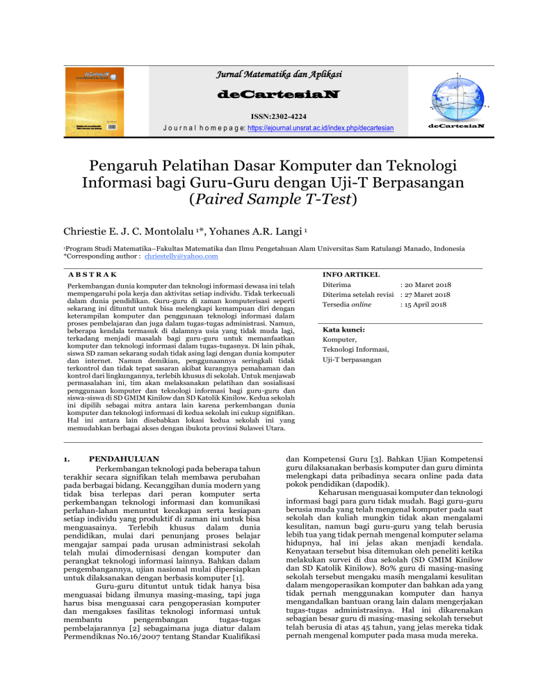 Jurnal Matematika dan Aplikasi deCartesiaN ISSN:2302-4224 J o u r n a l h o m e p a g e: https://ejournal.unsrat.ac.id/index.php/decartesian deCartesiaN Pengaruh Pelatihan Dasar Komputer dan Teknologi Informasi bagi Guru-Guru dengan Uji-T Berpasangan (Paired Sample T-Test) Chriestie E. J. C. Montolalu 1*, Yohanes A.R. Langi 1 Program Studi Matematika–Fakultas Matematika dan Ilmu Pengetahuan Alam Universitas Sam Ratulangi Manado, Indonesia *Corresponding author : chriestelly@yahoo.com 1 ABSTRAK INFO ARTIKEL Perkembangan dunia komputer dan teknologi informasi dewasa ini telah mempengaruhi pola kerja dan aktivitas setiap individu. Tidak terkecuali dalam dunia pendidikan. Guru-guru di zaman komputerisasi seperti sekarang ini dituntut untuk bisa melengkapi kemampuan diri dengan keterampilan komputer dan penggunaan teknologi informasi dalam proses pembelajaran dan juga dalam tugas-tugas administrasi. Namun, beberapa kendala termasuk di dalamnya usia yang tidak muda lagi, terkadang menjadi masalah bagi guru-guru untuk memanfaatkan komputer dan teknologi informasi dalam tugas-tugasnya. Di lain pihak, siswa SD zaman sekarang sudah tidak asing lagi dengan dunia komputer dan internet. Namun demikian, penggunaannya seringkali tidak terkontrol dan tidak tepat sasaran akibat kurangnya pemahaman dan kontrol dari lingkungannya, terlebih khusus di sekolah. Untuk menjawab permasalahan ini, tim akan melaksanakan pelatihan dan sosialisasi penggunaan komputer dan teknologi informasi bagi guru-guru dan siswa-siswa di SD GMIM Kinilow dan SD Katolik Kinilow. Kedua sekolah ini dipilih sebagai mitra antara lain karena perkembangan dunia komputer dan teknologi informasi di kedua sekolah ini cukup signifikan. Hal ini antara lain disebabkan lokasi kedua sekolah ini yang memudahkan berbagai akses dengan ibukota provinsi Sulawei Utara. Diterima 1. PENDAHULUAN Perkembangan teknologi pada beberapa tahun terakhir secara signifikan telah membawa perubahan pada berbagai bidang. Kecanggihan dunia modern yang tidak bisa terlepas dari peran komputer serta perkembangan teknologi informasi dan komunikasi perlahan-lahan menuntut kecakapan serta kesiapan setiap individu yang produktif di zaman ini untuk bisa menguasainya. Terlebih khusus dalam dunia pendidikan, mulai dari penunjang proses belajar mengajar sampai pada urusan administrasi sekolah telah mulai dimodernisasi dengan komputer dan perangkat teknologi informasi lainnya. Bahkan dalam pengembangannya, ujian nasional mulai dipersiapkan untuk dilaksanakan dengan berbasis komputer [1]. Guru-guru dituntut untuk tidak hanya bisa menguasai bidang ilmunya masing-masing, tapi juga harus bisa menguasai cara pengoperasian komputer dan mengakses fasilitas teknologi informasi untuk membantu pengembangan tugas-tugas pembelajarannya [2] sebagaimana juga diatur dalam Permendiknas No.16/2007 tentang Standar Kualifikasi : 20 Maret 2018 Diterima setelah revisi : 27 Maret 2018 Tersedia online : 15 April 2018 Kata kunci: Komputer, Teknologi Informasi, Uji-T berpasangan dan Kompetensi Guru [3]. Bahkan Ujian Kompetensi guru dilaksanakan berbasis komputer dan guru diminta melengkapi data pribadinya secara online pada data pokok pendidikan (dapodik). Keharusan menguasai komputer dan teknologi informasi bagi para guru tidak mudah. Bagi guru-guru berusia muda yang telah mengenal komputer pada saat sekolah dan kuliah mungkin tidak akan mengalami kesulitan, namun bagi guru-guru yang telah berusia lebih tua yang tidak pernah mengenal komputer selama hidupnya, hal ini jelas akan menjadi kendala. Kenyataan tersebut bisa ditemukan oleh peneliti ketika melakukan survei di dua sekolah (SD GMIM Kinilow dan SD Katolik Kinilow). 80% guru di masing-masing sekolah tersebut mengaku masih mengalami kesulitan dalam mengoperasikan komputer dan bahkan ada yang tidak pernah menggunakan komputer dan hanya mengandalkan bantuan orang lain dalam mengerjakan tugas-tugas administrasinya. Hal ini dikarenakan sebagian besar guru di masing-masing sekolah tersebut telah berusia di atas 45 tahun, yang jelas mereka tidak pernah mengenal komputer pada masa muda mereka. Pengaruh Pelatihan Dasar Komputer dan Teknologi Informasi bagi Guru-Guru dengan Uji-T Berpasangan (Paired Sample T-Test) Jurnal Matematika dan Aplikasi deCartesiaN, Vol.7, No.1 (Maret 2018): 44 -46 ๏ท SD GMIM Kinilow dan SD Katolik Kinilow beralamat di kelurahan Kinilow I, kecamatan Tomohon Utara, Kota Tomohon. Perkembangan komputer dan teknologi informasi di tempat ini cukup pesat. Salah satu penyebabnya adalah keluarahan Kinilow I terletak strategis sebagai pintu masuk Kota Tomohon yang dihubungkan langsung oleh jalan raya menuju ibukota povinsi Sulawesi Utara, yaitu Kota Manado. Hal ini menjadi salah satu perhatian bahwa pastinya setiap perkembangan dunia komputer dan teknologi informasi di tahun-tahun mendatang akan berpengaruh secara langsung dan cepat pada kehidupan warga Kinilow I. Berdasarkan hal-hal tersebut, dunia pendidikan khususnya sekolah-sekolah dasar yang ada di kelurahan ini sebaiknya semakin memperlengkapi unsur-unsurnya dengan perkembangan-perkembangan dunia komputer dan teknologi informasi tersebut. Guru-guru adalah pihak utama yang harus menyesuaikan diri dengan perkembangan ini. Dengan menguasai keterampilan dasar komputer dan teknologi informasi, guru-guru akan mendapatkan kemudahan dalam menyiapkan tugas-tugas administrasi dan perangkat pembelajaran mereka, bahkan nantinya bisa menerapkannya dalam proses pembelajaran yang berbasis pada komputer dan teknologi informasi. Selain itu, penguasaan komputer dan teknologi informasi akan membantu tugas para guru dalam mengontrol aktivitas anak-anak didiknya yang semakin dipengaruhi oleh gaya hidup modern dengan komputer dan perangkat teknologi informasi lainnya. Kenyataan yang didapat ini menjadi tantangan bagi Tim Peneliti untuk memberikan kontribusi melalui Ilmu Pengetahuan yang sudah diperoleh. Berdasarkan latar belakang ilmu yang dimiliki oleh Tim Pelaksana, keadaan-keadaan yang ditemui bisa