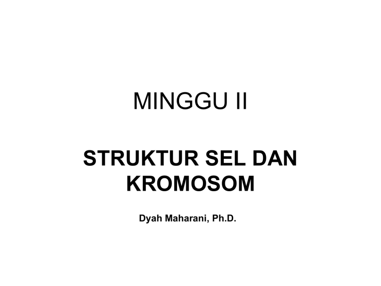 MINGGU II STRUKTUR SEL DAN KROMOSOM Dyah Maharani, Ph.D. Bagian-bagian Sel Sitoplasma mitokondria aparatus golgi retikulum endoplasma ribosom lisosom kromosom Inti sel nukleolus – metabolisme sel - sekresi sel - sintesis protein - pencernaan intra seluler STRUKTUR SEL Dinding sel Banyak mengandung phospolipid Cairan sel Jellylike inter Intracellular highway Metabolisme sel, Pernafasan/ respirasi sel Ribosom Sintesa protein Pencernaan intra seluler & Digesti enzym Sekresi sel Tdk ada di sel bakte LINK OF QUIZ INTERACTIVE Cell structure and function http://www.biologycorner.com/quiz/qz_cell_parts.html TUGAS I: Mohon dibuka dan dikerjakan Latihan soal pada link diatas dan buat flash card untuk masing masing soal dengan jawaban yang benar Genetik adalah suatu proses transfer information dari beberapa level yang berbeda. Level yang paling dasar adalah level molekul yang dikenal dengan DNA. Informasi yang tersusun dalam DNA tersebut dirangkai ke dalam gen. Selanjutnya gen-gen tersebut tersusun membentuk suatu kromosom. Jika semua level dari DNA sampai dengan kromosom tersebut terangkai maka akan membentuk suatu orgnaisme yang disebut genome. Setiap sel didalam suatu individu berisi genome. Understanding Genetics Genetics is about the transfer of information among many different levels. The foundation level is the molecule called DNA (1). The information in DNA is organized into Genes (2). Genes, in turn, make up Chromosomes (3), which when taken all together form an organism's Genome (4). Every cell in an Individual (5) contains the genome. The final level shows how individuals are genetically connected to their families and larger populations (6) through inheritance patterns. http://www.genetics.gsk.com/understand.htm GENE Gb. 1 Gb. 2 Gb. 3 Genom adalah keseluruhan informasi genetik yang dimiliki suatu sel atau organisme. Kromosom = struktur dalam inti sel yang terdiri dari DNA yang terikat dengan histon dan protein lain. Untaian DNA dalam posisi dan urutan tertentu membentuk suatu gen. Setiap gen dapat menentukan sifat (fenotip) dari suatu individu Gen = unit pewarisan sifat bagi organisme hidup yang terletak di kromosom yang memiliki posisi dan urutan tertentu. Gen tersusun dari rangkaian DNA dan setiap gen menentukan sifat (fenotip) serta fungsi tertentu dari suatu organisme DNA adalah sejenis biomolekul yang membawa instruksi atau kode genetik yang berperan penting dalam pertumbuhan, perkembangan, dan fungsi suatu organisme. KROMOSOM DEFINISI = struktur dalam inti sel yang terdiri dari DNA yang terikat dengan histon dan protein lain. Untaian DNA dalam posisi dan urutan tertentu membentuk suatu gen. Setiap gen dapat menentukan sifat (fenotip) dari suatu individu BAGIAN KROMOSOM 1. Sentromer (lekuan primer) = bagian /wilayah dari kromosom yang membentuk lekuan 2. Lengan kromosom (lengan pendek dan panjang) 3. Telomer 4. Lekuan Sekunder 5. Kinetokor (komplek protein yg berada di sentromer) telomer Bentuk Kromosom berdasar letak sentromer • Metasentris : sentromer di tengah K • Submetasentris : sentromer diantar metasentris dan akrosentris • Akrosentris : sentromer di dekat salah satu ujung K • Telosentris : sentomer diujung K • Asentris : tidak memilik sentromer Tipe Kromosom • OTOSOM (AUTOSOM) sepasang kromosom tubuh yang menentukan karakter fisik • SEX CHROMOSOME (KROMOSOM KELAMIN) sepasang kromosom yang menentukan jenis kelamin DNA SEBAGAI MATERI GENETIK DNA RNA DNA membawa informasi genetik yang menentukan struktur protein HISTON GEN Kromosom • Jumlah DNA tetap dalam semua sel tubuh • Jumlah DNA dalam gamet separoh dari jml sel somatik Struktur dasar dalam pembentukan sel kehidupan DNA merupakan molekul utama dalam kehidupan Struktur DNA (1) • DNA disusun oleh 2 untaian nukleotida yang saling melingkar satu sama lain membentuk double helix • Diluar struktur longitudinal atau diluar spiral terdapat gula dan phosphat. Di dalam spiral terdapat basa nitrogen Struktur DNA (2) GULA FOSFAT BASA NITROGEN Struktur DNA • Jika kita membuka/melepas molekul, struktur molekul mirip seperti sebuah tangga dimana gula dan phosphat terletak dibagian sisi-sisinya. Sedang basa nitrogen terletak pada bagian anak tangga Struktur DNA (4) • Pada tampilan terlihat ada 4 basa yang berbeda dan hanya pasangan-pasangan tertentu yang memungkinkan membentuk anak tangga (rungs) Adenin - Timin • Adenin selalu berlawanan dengan Timin Guanin - Sitosin • Guanin selalu berlawanan dengan sitosin STRUKTUR DNA DNA tersusun dari sejumlah senyawa protein yang terdapat dalam INTI Friederich Miescher nukleoprotein Richard Altman Nucleic acid / asam nukleat Struktur DNA Basa Nitrogen Purin Adenin Guanin Primidin Citosin Timin Gula pentosa yg memiliki C<5 : deoxyribosa 1-3 gugus fosfat Struktur RNA Basa Nitrogen Purin Adenin Guanin Primidin Gula pentosa yg memiliki 5 C : ribosa 1-3 gugus fosfat Citosin Urasil 3 macam RNA : a. mRNA : messenger RNA : pembawa kode genetik b. r RNA : ribosom RNA : RNA yang terdapat dalam ribosom c. t RNA : transfer RNA : pengangkut asam amino