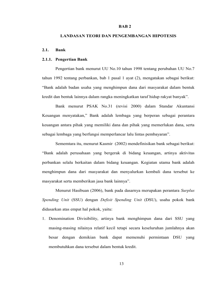 BAB 2 LANDASAN TEORI DAN PENGEMBANGAN HIPOTESIS 2.1. Bank 2.1.1. Pengertian Bank Pengertian bank menurut UU No.10 tahun 1998 tentang perubahan UU No.7 tahun 1992 tentang perbankan, bab 1 pasal 1 ayat (2), mengatakan sebagai berikut: “Bank adalah badan usaha yang menghimpun dana dari masyarakat dalam bentuk kredit dan bentuk lainnya dalam rangka meningkatkan taraf hidup rakyat banyak”. Bank menurut PSAK No.31 (revisi 2000) dalam Standar Akuntansi Keuangan menyatakan,” Bank adalah lembaga yang berperan sebagai perantara keuangan antara pihak yang memiliki dana dan pihak yang memerlukan dana, serta sebagai lembaga yang berfungsi memperlancar lalu lintas pembayaran”. Sememtara itu, menurut Kasmir (2002) mendefinisikan bank sebagai berikut: “Bank adalah perusahaan yang bergerak di bidang keuangan, artinya aktivitas perbankan selalu berkaitan dalam bidang keuangan. Kegiatan utama bank adalah menghimpun dana dari masyarakat dan menyalurkan kembali dana tersebut ke masyarakat serta memberikan jasa bank lainnya”. Menurut Hasibuan (2006), bank pada dasarnya merupakan perantara Surplus Spending Unit (SSU) dengan Defisit Spending Unit (DSU), usaha pokok bank didasarkan atas empat hal pokok, yaitu: 1. Denomination Divisibility, artinya bank menghimpun dana dari SSU yang masing-masing nilainya relatif kecil tetapi secara keseluruhan jumlahnya akan besar dengan demikian bank dapat memenuhi permintaan DSU yang membutuhkan dana tersebut dalam bentuk kredit. 13 13 2. Monarity Flexibility, artinya bank dalam menghimpun dana menyelenggarakan bentuk-bentuk simpanan yang bervariasi jangka waktu dan penarikannya, seperti deposito berjangka, buku tabungan. 3. Liquidity Transformation, artinya dana yang disimpan oleh para penabung (SSU) kepada bank umumnya bersifat liquid. Karena itu, SSU dapat dengan mudah dicairkan sesuai dengan bentuk tabungannya. 4. Risk Diversification, artinya bank dalam menyalurkan kredit kepada banyak pihak dan sektor-sektor ekonomi yang beraneka macam sehingga risiko yang dihadapi bank dengan cara menyebarkan kredit semakin kecil. Berdasarkan pengertian diatas dapat disimpulkan tugas bank adalah menghimpun dana dari masyarakat, memberikan kredit kepada pihak yang memerlukan dana, dan memperlancar lalu lintas pembayaran dari masyarakat. 2.1.2. Sumber Dana Perbankan Menurut Kasmir (2008), sumber-sumber dana bank adalah usaha bank dalam memperoleh dana dalam rangka membiayai kegiatan operasinya. Dana yang bersumber dari bank itu sendiri: modal sendiri, yaitu setoran modal dari para pemegang sahamnya. Apabila saham belum habis terjual, maka akan dijual kepada pemegang saham lama untuk mencari dana. Secara garis besar dapat disimpulkan pencairan dana sendiri terdiri dari: 1. Dana yang bersumber dari bank itu sendiri: a. Setoran modal dari pemegang saham b. Cadangan-cadangan laba bank tahun lalu yang tidak dibagi kepada para pemegang sahamnya. 14 c. Laba bank yang belum dibagi: laba yang memangbelum dibagikan pada tahun yang bersangkutan sehingga dapat dimanfaatkan sebagai modal untuk sementara waktu. 2. Dana yang berasal dari masyarakat luas: a. Simpanan giro merupakan dana murah bagi bank, karena bunga atau balas jasa dibayar paling murah jika dibandingkan dengan simpanan tabungan dan simpanan deposito. b. Simpanan tabungan c. Simpanan deposito d. Simpanan tabungan dan simpanan deposito disebut dana mahal, hal ini disebabkan bunga yang dibayar kepada pemegangnya relatif lebih tinggi dibandingkan dengan jasa giro. 3. Dana yang bersumber dari lembaga lainnya: a. Kredit likuiditas dari Bank Indonesia: kredit yang diberikan Bank Indonesia kepada bank-bank yang mengalami kesulitan likuiditasnya. b. Pinjaman antar bank (call money): pinjaman yang diberikan kepada bank-bank yang mengalami kalah kliring di dalam lembaga kliring. c. Pinjaman dari bank-bank luar negeri: pinjaman yang diperoleh dari pihak luar negeri. d. Surat Berharga Pasar Uang (SPBU): pihak perbankan menerbitkan SPBU kemudian diperjualbelikan kepada pihak yang berminat. 2.1.3. Biaya Dana Perbankan Berbagai jenis perhitungan biaya dana perbankan antara lain: a. Cost of borrowing 15 Biaya dana yang langsung dikeluarkan oleh bank untuk mendapatkan dana dari pinjaman yang dilakukan. Biaya ini terutama sebesar suku bunga dana yang dibayarkan oleh bank terhadap pemilik dana. b. Cost of fund Biaya dana yang langsung dikeluarkan oleh bank untuk mendapatkan sejumlah dana. c. Cost of loanable fund Biaya dana yang dapat ditanamkan di bidang perkreditan. d. Marginal cost of fund Biaya dana yang dikeluarkan oleh bank untuk mendapatkan suatu tambahan dana pada suatu periode tertentu. e. Cost of money Biaya dana yang dikeluarkan oleh bank setelah diperhitungkan dengan biaya overhead. f. Cost of operable fund (Cost of investible fund) Biaya atas dana yang dapat diinvestasikan ke dalam earning asset. 2.1.4. Fungsi Perbankan Fungsi spesifik bank menurut Susilo et al (2006), dapat sebagai: 1. Agent of trust: Kegiatan perbankan berdasarkan kepercayaan, baik dalam hal penghimpunan dana maupun penyaluran dana. 2. Agent of development: Penghimpun dan penyaluran dana untuk kelancaran kegiatan perekonomian di sektor riil, seperti memperlancar kegiatan produksi, distribusi, dan konsumsi. 16 3. Agent of service: Memberikan penawaran jasa-jasa perbankan yang lain kepada masyarakat, seperti jasa pengiriman uang, jasa penitipan barang berharga, jasa pemberian jaminan bank, dan lain-lain. 2.1.5. Peranan Bank Menurut Triandaru & Budisantoso (2008), “Bank mempunyai peran yang penting dalam sistem keuangan, yaitu: 1. Pengalihan asset (Asset transmutation): Pengalihan dana atau asset dari unit surplus ke unit defisit. 2. Transaksi (transaction): Pemberian kemudahan transaksi barang dan jasa. 3. Likuiditas (liquidity): Pemberian alternatif pengelolaan likuiditas. 4. Efisiensi (efficiency): Interaksi unit surplus dan unit defisit secara efisien.” 2.1.6. Jenis-jenis Bank Praktik perbankan di Indonesia yang diatur dalam Undang-Undang Perbankan memiliki b