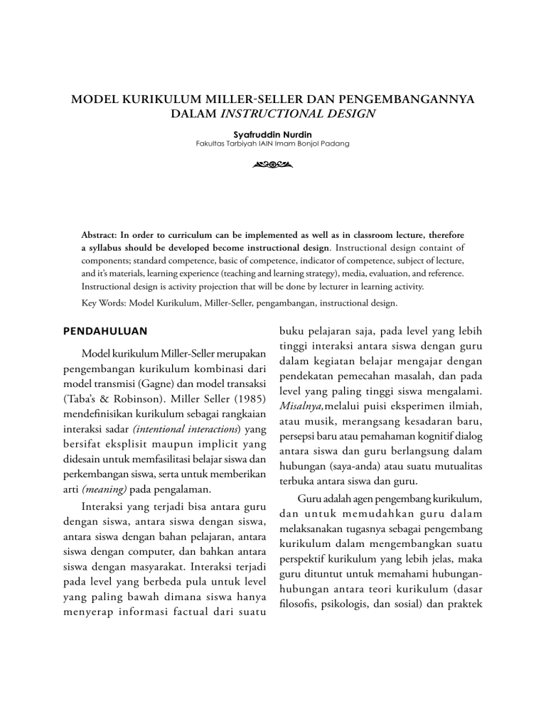 MODEL KURIKULUM MILLERSELLER DAN PENGEMBANGANNYA DALAM INSTRUCTIONAL DESIGN Syafruddin Nurdin Fakultas Tarbiyah IAIN Imam Bonjol Padang Abstract: In order to curriculum can be implemented as well as in classroom lecture, therefore a syllabus should be developed become instructional design. Instructional design containt of components; standard competence, basic of competence, indicator of competence, subject of lecture, and it’s materials, learning experience (teaching and learning strategy), media, evaluation, and reference. Instructional design is activity projection that will be done by lecturer in learning activity. Key Words: Model Kurikulum, Miller-Seller, pengambangan, instructional design. PENDAHULUAN Model kurikulum Miller-Seller merupakan pengembangan kurikulum kombinasi dari model transmisi (Gagne) dan model transaksi (Taba’s & Robinson). Miller Seller (1985) mendefinisikan kurikulum sebagai rangkaian interaksi sadar (intentional interactions) yang bersifat eksplisit maupun implicit yang didesain untuk memfasilitasi belajar siswa dan perkembangan siswa, serta untuk memberikan arti (meaning) pada pengalaman. Interaksi yang terjadi bisa antara guru dengan siswa, antara siswa dengan siswa, antara siswa dengan bahan pelajaran, antara siswa dengan computer, dan bahkan antara siswa dengan masyarakat. Interaksi terjadi pada level yang berbeda pula untuk level yang paling bawah dimana siswa hanya menyerap informasi factual dari suatu buku pelajaran saja, pada level yang lebih tinggi interaksi antara siswa dengan guru dalam kegiatan belajar mengajar dengan pendekatan pemecahan masalah, dan pada level yang paling tinggi siswa mengalami. Misalnya,melalui puisi eksperimen ilmiah, atau musik, merangsang kesadaran baru, persepsi baru atau pemahaman kognitif dialog antara siswa dan guru berlangsung dalam hubungan (saya-anda) atau suatu mutualitas terbuka antara siswa dan guru. Guru adalah agen pengembang kurikulum, dan untuk memudahkan guru dalam melaksanakan tugasnya sebagai pengembang kurikulum dalam mengembangkan suatu perspektif kurikulum yang lebih jelas, maka guru dituntut untuk memahami hubunganhubungan antara teori kurikulum (dasar filosofis, psikologis, dan sosial) dan praktek kurikulum (pengembangan implementasi, evaluasi). Menurut Miller-Seller (1985: 225226) ada tiga orientasi kurikulum yang mempengaruhi terjadinya perbedaan dalam program-program kurikulum. Pengembangan, implementasi, dan evaluasi kurikulum hendaknya dilakukan sesuai dengan posisi atau orientasi kurikulum yang mendasarinya. MODEL PENGEMBANGAN KURIKULUM MILLER SELLER Miller dan Seller mencoba menyusun suatu model yang lebih komprehensif berdasarkan pandangan mereka tentang kurikulum. Miller dan Seller (1985) mengemukakan bahwa proses pengembangan kurikulum adalah rangkaian kegiatan yang dilakukan secara terus menerus. Seller memandang bahwa pengembangan kurikulum harus dimulai dari menentukan orientasi kurikulum, yakni kebijakan-kebijakan umum, misalnya arah dan tujuan pendidikan, pandangan tentang hakikat belajar dan hakikat anak didik, pandangan tentang keberhasilan implementasi kurikulum dan lain sebagainya. 1. Orientasi Kurikulum Pengembangan kurikulum berdasarkan suatu orientasi. Orientasiini mencerminkan pandangan filsafat, psikologi dan teori belajar, tentang masyarakat, pandangan tentang dunia atau paradigma yang dianut para pembina.Berdasarkan orientasi itu selanjutnya dikembangkan kurikulum menjadi pedoman pembelajaran, diimplementasikan dalam 20 Jurnal al-Fikrah, Vol. II, No. 1, Januari-Juni 2014 proses pembelajaran dan dievaluasi. Hasil evaluasi itulah kemudian dijadikan bahan dalam menentukan orientasi, begitu seterusnya hingga membentuk siklus. Orientasi pengembangan kurikulum menurut Miller-Seller menyangkut enam aspek, yaitu: 1) Tujuan pendidikan menyangkut arah kegiatan pendidikan, artinya hendak dibawa kemana siswa yang kita didik itu. 2) Pandangan tentang anak, apakah anak dipandang sebagai organisme yang aktif atau pasif. 3) Pandangan tentang proses pembelajaran, apakah proses pembelajaran itu dianggap sebagai proses transformasi ilmu pengetahuan atau mengubah perilaku anak. 4) Pandangan tentang lingkungan, apakah lingkungan belajar harus dikelola secara formal atau secara bebas yang dapat memungkinkan anak bebas belajar. 5) Konsepsi tentang peranan guru, apakah guru harus berperan sebagai instruktur yang bersifat otoriter atau guru dianggap sebagai fasilitator yang siap memberi bimbingan dan bantuan pada anak untuk belajar. 6) Evaluasi belajar, apakah untuk mengukur keberhasilan ditentukan dengan tes atau nontes. Menurut Miller-Seller ada tiga orientasi kurikulum, yakni: a). Orientasi transmisi (transmission orientation) Kurikulum pada orientasi ini menekankan pada isi atau materi ajaran, isinya bersumber pada disiplin ilmu yang terstruktur/sistematis, guru berfungsi sebagai pemberi arahan langsung dan penyampai ilmu, teknologi, dan nilai sehingga harus menguasai materi ajar dengan baik. Sementara siswa harus bekerja keras sebagai penerima materi ajar, sehingga proses belajar yang terjadi adalah ekspositori dan evaluasi pembelajaran menggunakan tradisional achievement seperti tes, uraian, multiple objective, dan sebagainya. Pendidikan adalah ilmu yang harus dikuasai siswa dalam kompetensi-kompetensi yang dapat diukur, dengan demikian, tujuan pendidikan yang digunakan adalah penguasaan mata pelajaran dan norma-norma sosial yang sifatnya pengetahuan (Miller & Seller: 1985: 17-60). b). Orientasi transaksi (transaction orientation) Dalam orientasi transaksi, antara kurikulum dan siswa saling memberi pengaruh. Individu dipandang sebagai seseorang yang rasional dan memiliki kemampuan inteligensi untuk menyelesaikan masalah. Pendidikan dipandang sebagai dialog antara siswa dan kurikulum, dimana siswa membangun pengetahuan melalui proses dialog, sebab siswa dipandang mempunyai keterampilan seperti kemampuan berfikir. Elemen inti dari transaksi ini adalah terletak pada strategi kurikulum yang memban