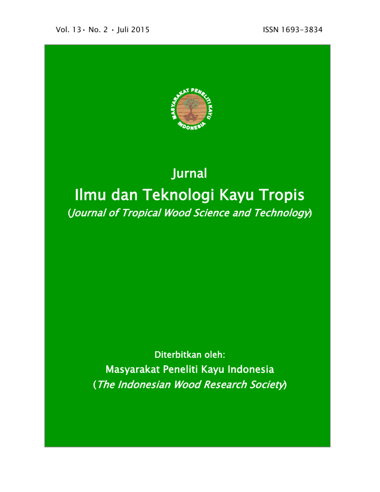 Vol. 13• No. 2 • Juli 2015 ISSN 1693-3834 Jurnal Ilmu dan Teknologi Kayu Tropis (Journal of Tropical Wood Science and Technology) Diterbitkan oleh: Masyarakat Peneliti Kayu Indonesia (The Indonesian Wood Research Society) Vol. 13• No. 2 • Juli 2015 ISSN 1693-3834 Jurnal Ilmu dan Teknologi Kayu Tropis (Journal of Tropical Wood Science and Technology) Penanggung Jawab: Ketua Masyarakat Peneliti Kayu Indonesia Ketua Dewan Penyunting (Chief editor): Fauzi Febrianto Penyunting Ahli (Editorial Board Members): Edi Suhaimi Bakar (UPM Malaysia) Enos Tangke Arung (Fahutan UNMUL) Imam Wahyudi (Fahutan IPB) Nyoman Jaya Wistara (Fahutan IPB) Lina Karlinasari (Fahutan IPB) Musrizal Muin (Fahutan UNHAS) Ragil Widyorini (Fahutan UGM) Subyakto (UPT BPP Biomaterial LIPI) Wahyu Dwianto (UPT BPP Biomaterial LIPI) Penyunting Pelaksana (Managing Editors) Anne Carolina Deded Sarip Nawawi Fengky Satria Yoresta Rita Kartika Sari Sukma Surya Kusumah Alamat Redaksi Departemen Hasil Hutan Fakultas Kehutanan Institut Pertanian Bogor Kampus IPB Darmaga Bogor 16680 Telp/Fax. +62-251-8621285, email : jkayutropis@gmail.com http://www.mapeki.org Jurnal Ilmu dan Teknologi Kayu Tropis adalah jurnal resmi Masyarakat Peneliti Kayu Indonesia (MAPEKI) yang terbit sejak tahun 2003. Jurnal ini mempublikasikan artikel asli baik penelitian dasar maupun terapan di bidang ilmu pengetahuan dan teknologi kayu, bahan berlignoselulosa bukan kayu, hasil hutan lainnya dan industri hasil hutan. Selain itu, jurnal ini juga mempublikasikan artikel ulas balik (review) dengan tema yang ditentukan oleh redaksi. Setiap artikel yang diterbitkan dalam jurnal ini telah ditelaah oleh mitra bestari yang dicantumkan pada nomor paling akhir dari setiap volume. Penerbitan jurnal 2 kali dalam setahun (Januari dan Juli). Harga langganan jurnal (hardcopy) sebesar Rp 100.000/tahun. Jurnal juga dapat diakses secara online di http://www.mapeki.org/jitkt. Jurnal ini telah terakreditasi B oleh DIKTI dengan Nomor 212/P/2014. Vol. 13• No. 2 • Juli 2015 ISSN 1693-3834 Daftar Isi Artikel Asli: The Effect of Jabon Veneer Quality on Laminated Veneer Lumber Glue Bond and Bending Strength Istie Rahayu, Wayan Darmawan, Naresworo Nugroho, Remy Marchal…... 98-110 Aktivitas Antidiabetes Ekstrak Etanol Jabon (Anthocephalus cadamba) (Antidiabetic Activity of Jabon (Anthocephalus cadamba) Ethanol Extracts) Laela Nur Anisah, Wasrin Syafii, Rita Kartika Sari, Gustan Pari …………. 111-124 Development of Testing Frame for Diagonal Shear Test of Composite Panels and Engineered Wood Products Jauhar Fajrin………………........................................................................... 125-135 Sifat Pengkaratan Lima Jenis Kayu Asal Sukabumi yang Disimpan Di Tempat Terbuka terhadap Sekrup Logam (Corrosion Properties on Five Wood Species from Sukabumi in the Open Site to Metal Screw) Djarwanto, Sihati Suprapti............................................................................ 136-145 Sifat Keawetan dan Fisis-Mekanis Kayu Kecapi serta Rambutan setelah Perlakuan Pemanasan Minyak sebagai Upaya Peningkatan Mutu Kayu Ramah Lingkungan (The Durability and Physical-Mechanical Properties of Kecapi and Rambutan Wood after Oil Heat Treatment as Green Wood Quality Enhancement) Trisna Priadi, Silva D Maretha………….………………………………….. 146-160 Aktifitas Antirayap Ekstrak Daun Orthosiphon sp., Morinda sp. dan Carica sp. (Antitermitic Activities of Leaf Extracts of Orthosiphon sp., Morinda sp. and Carica sp.) Abdul Azis, Tibertius A Prayitno, Ganis Lukmandaru, Tomy Listyanto……………………………………………………………….…… 161-174 Sifat Fisis dan Mekanis Papan Partikel Sengon dengan Perekat Asam Sitrat-Sukrosa (Physical and Mechanical Properties of Sengon Particleboard Using Citric Acid-Sucrose Adhesive) Ragil Widyorini, Pradana A Nugraha……………………………………… 175-184 Vol. 13• No. 2 • Juli 2015 ISSN 1693-3834 Pengawetan Kayu Ganitri dan Mahoni melalui Rendaman Dingin dengan Bahan Pengawet Boric Acid Equivalent (Ganitri and Mahoni Wood Preservation using Boric Acid Equivalent with Cold Immersion Method) Endah Suhaendah, Mohamad Siarudin…….. ……………………………… 185-192 Quinones Distribution of Teak Wood Grown in Community Forest Ganis Lukmandaru......................................................................................... 193-204 Vol. 13 • No. 2 • Juli 2015 ISSN 1693-3834 Jurnal Ilmu dan Teknologi Kayu Tropis (Journal of Tropical Wood Science and Technology) Artikel dalam Volume 13 Nomor 1 Aktivitas Antifungi Ekstrak Akar Mahoni Syamsul Falah, Achmad, terhadap Isolat Botryodiplodia theobromae Pat. Aji Winara Penyebab Mati Pucuk pada Bibit Jabon 1-10 Physical and Mechanical Properties of 10-Year Old Superior and Conventional Teak Planted in Randublatung Central Java Indonesia 11-21 Fanny Hidayati, Joko Sulistyo, Ganis Lukmandaru, Tomy Listyanto, Harry Praptoyo, Rini Pujiarti Perilaku Elastik Beban-Defleksi Balok Kayu Fengky S Yoresta Laminasi pada Pengujian Lentur 22-27 Kadar Kinon dalam Kayu Teras Jati yang Diisolasi dengan Ekstraksi Rendaman Dingin Ganis Lukmandaru 28-38 Properties of Wood Plastic Composite Using Primary Sludge as Filler Iwan Risnasari , Fauzi Febrianto, Nyoman J Wistara, Sucahyo Sadiyo, Siti Nikmatin 39-50 Karakteristik Kecepatan Gelombang Suara dan Maryam Jamilah, Lina Sifat Anatomi Sadapan Pohon Pinus Karlinasari, Sucahyo Sadiyo, Gunawan Santosa 51-60 Formulasi Umpan dari Campuran Terdegradasi dan Kertas Limbah Pengendalian Rayap Kayu Musrizal Muin, Astuti untuk Arif, Sitti Nuraeni, Wa Ode F Zohra 61-69 Trace Elements Content of Mangium Pulp Nyoman Wistara, Devi throughout ECF Bleaching Stages as Measured Nurmala by ICP 70-79 Pemanfaatan Kulit Buah Durian Stimulan Penyalaan Briket Batubara 80-87 sebagai Sanjaya Aktivitas Antioksidan dan Inhibitor Tirosinase Rita K Sari, Rahmi Utami, Ekstrak Metanol Mangium(Acacia mangium) Ir