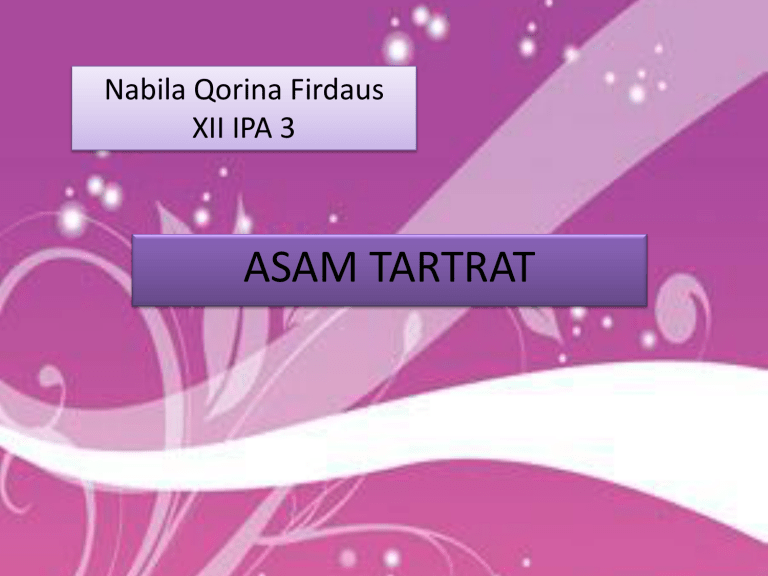 Nabila Qorina Firdaus XII IPA 3 ASAM TARTRAT PENGERTIAN Asam tartrat merupakan senyawa kimia yang secara alami terdapat dalam anggur, pisang, dan tamarin. Asam tartrat berfungsi sebagai zat asidulan yaitu pengatur keasaman. Selain itu, asidulan juga dapat bertindak sebagai penegas rasa dan warna atau menyelubungi after taste yang tidak disukai. Asidulan dapat mengintensifkan penerimaan rasa-rasa lain. Sifat asam senyawa ini dapat mencegah pertumbuhan mikroba dan bertindak sebagai bahan pengawet. Secara kimia atau menurut IUPAC, asam asam tartrat memiliki rumus kimia C4H6O6 dan rumus struktur seperti yang ditunjukkan pada gambar berikut. Gambar 1. Rumus Struktur Asam Tartrat SEJARAH Tartrat pertama kali diisolasi dari kalium tartrat yang dahulu dikenal sebagai tartar, pada abad ke 8 oleh alkemis Jabir bin Hayyan. Proses modern dikembangkan pada tahun 1769 oleh kimiawan Swedia Carl Wilhelm Scheele. Asam tartrat memainkan peran penting dalam penemuan kiralitas kimia.Properti asam tartrat pertama kali diamati pada 1832 oleh Jean Baptiste Biot, yang mengamati kemampuannya untuk memutar cahaya terpolarisasi. Louis Pasteur melanjutkan penelitian ini pada tahun 1847 dengan menyelidiki bentuk kristal amonium natrium tartrat, yang ditemukannya dalam bentuk kiral. Dengan cara manual, Louis Pasteur menyortir kristal yang berbeda bentuknya bawah pembesaran mikroskop untuk menghasilkan sampel murni asam levotartrat. Hal ini membuatnya menjadi penemu asam levotartrat. CIRI FISIK ASAM TARTRAT 1. Tidak berwarna atau bening 2. Titik didih suhu 1680C (334,40 F) – 1720C. 3. Berat molekulnya adalah sekitar 150,09 g/mol. 4. Kepadatannya adalah 1,76. SIFAT KIMIA 1. Bersifat korosif 2. Menjadi tidak stabil bila terkena panas secara terus menerus. 3. dapat mencegah pertumbuhan mikroba dan bertindak sebagai bahan pengawet. 4. Mudah larut dalam air dan gliserol. 5. asidulan yaitu zat yang berperan sebagai pengasam 6. Sifat asam senyawa ini dapat mencegah pertumbuhan mikroba dan bertindak sebagai bahan pengawet. APLIKASI ASAM TARTRAT Asam tartrat juga digunakan sebagai campuran tepung soda kue yang merupakan bahan pengembang yang secara umum digunakan dalam pembuatan roti. Bahan ini terdiri dari NaHCO3 dan tepung. Soda kue sendiri terdiri atas dua jenis, yaitu soda kue dengan aktivitas cepat disebut juga sebagai aktivitas tinggi dan soda kue dengan aktivitas lambat atau disebut juga sebagai aktivitas ganda. Perbedaan antara keduanya adalah pada mudah tidaknya komponen asam atau pembentuk asam larut dalam air dingin. Tabel BMP Beberapa Bahan Pangan yang Ditambahkan Asam Tartrat Jenis Bahan Pangan BMP Jam dan jeli, marmalade 3 g/kg tunggal atau campuran dengan asam fumarat dan garamnya, dihitung sebagai asam untuk mengatur pH antara 2,8 dan 3,5. Cokelat, cokelat bubuk, dan campuran cokelat dengan gula Kaldu 5 g/kg tunggal atau campuran dengan asam sitrat. Es krim 1 g/kg 250 g/kg, produk siap dikonsumsi. KANDUNGAN GARAM ASAM TARTRAT DALAM MAKANAN Matriks Bahan Pangan Konsentrasi Garam Tartrat Baked goods 1.30 g/kg Minuman non- alcohol 0.96 g/kg Es krim 0.57 g/kg Konfeksioneri 5.40 g/kg Gelatin dan pudding 0.06 g/kg Kondimen 10.00 g/kg Permen karet 3.70 g/kg EFEK NEGATIVE 1. 2. 3. 4. 5. Sedangkan jika asam ini tertelan atau terhirup, dapat menyebabkan iritasi pada paru-paru dan saluran pencernaan. Bila tertelan, selain dapat menyebabkan iritasi saluran pencernaan, juga menimbulkan gejala-gejala seperti mual, muntah, dan diare. Asam tartrat juga dapat mempengaruhi kerja ginjal (kerusakan ginjal). Paparan sedikit serbuk halus asam tartrat yang mengenai mata dapat mengakibatkan iritasi bila terjadi secara berulang. Paparan pada kulit dapat mengakibatkan kerusakan kulit secara local (hanya pada bagian yang terpapar) atau dermatitis bila terjadi secara berulang. Bila serbuk asam tartrat terhirup secara berulang, dapat mengakibatkan iritasi saluran pernapasan atau kerusakan paru-paru dengan berbagai derajat keparahan.