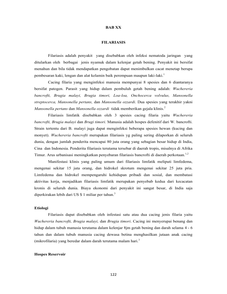BAB XX FILARIASIS Filariasis adalah penyakit yang disebabkan oleh infeksi nematoda jaringan yang ditularkan oleh berbagai jenis nyamuk dalam kelenjar getah bening. Penyakit ini bersifat menahun dan bila tidak mendapatkan pengobatan dapat menimbulkan cacat menetap berupa pembesaran kaki, lengan dan alat kelamin baik perempuan maupun laki-laki.1 Cacing filaria yang menginfeksi manusia mempunyai 8 spesies dan 6 diantaranya bersifat patogen. Parasit yang hidup dalam pembuluh getah bening adalah: Wuchereria bancrofti, Brugia malayi, Brugia timori, Loa-loa, Onchocerca volvulus, Mansonella streptocerca, Mansonella pertans, dan Mansonella ozzardi. Dua spesies yang terakhir yakni Mansonella pertans dan Mansonella ozzardi tidak memberikan gejala klinis.2 Filariasis limfatik disebabkan oleh 3 spesies cacing filaria yaitu Wuchereria bancrofti, Brugia malayi dan Brugi timori. Manusia adalah hospes defenitif dari W. bancrofti. Strain tertentu dari B. malayi juga dapat menginfeksi beberapa spesies hewan (kucing dan monyet). Wuchereria bancrofti merupakan filariasis yg paling sering dilaporkan di seluruh dunia, dengan jumlah penderita mencapai 80 juta orang yang sebagian besar hidup di India, Cina dan Indonesia. Penderita filariasis terutama tersebar di daerah tropis, misalnya di Afrika Timur. Arus urbanisasi meningkatkan penyebaran filariasis bancrofti di daerah perkotaan.1,2 Manifestasi klinis yang paling umum dari filariasis limfatik meliputi limfedema, mengenai sekitar 15 juta orang, dan hidrokel skrotum mengenai sekitar 25 juta pria. Limfedema dan hidrokel mempengaruhi kehidupan pribadi dan sosial, dan membatasi aktivitas kerja, menjadikan filariasis limfatik merupakan penyebab kedua dari kecacatan kronis di seluruh dunia. Biaya ekonomi dari penyakit ini sangat besar, di India saja diperkirakan lebih dari US $ 1 miliar per tahun.3 Etiologi Filariasis dapat disebabkan oleh infestasi satu atau dua cacing jenis filaria yaitu Wuchereria bancrofti, Brugia malayi, dan Brugia timori. Cacing ini menyerupai benang dan hidup dalam tubuh manusia terutama dalam kelenjar 8jm getah bening dan darah selama 4 - 6 tahun dan dalam tubuh manusia cacing dewasa betina menghasilkan jutaan anak cacing (mikrofilaria) yang beredar dalam darah terutama malam hari.3 Hospes Reservoir 122 Penularan filariasis umumnya dari manusia ke manusia melalui vektor serangga, tetapi ada satu strain Brugia malayi mempunyai hospes reservoir kera, anjing dan kucing dan bersifat zoonosis. Filariasis bancrofti dan timori tidak mempunyai hospes reservoir hewan. 2 Dalam perkembangannya, saat ini di Indonesia telah teridentifikasi ada 23 spesies nyamuk dari 5 genus yaitu : Mansonia, Anopheles, Culex, Aedes dan Armigeres yang menjadi vektor filariasis. 4 Patofisiologi Siklus hidup mikrofilaria terjadi dalam dua tahap yaitu dalam tubuh manusia dan dalam tubuh nyamuk (gambar 1) Gambar 1. Siklus Hidup dari Filaria Keterangan : Selama mengisap darah, nyamuk yang terinfeksi memasukkan larva stadium tiga (L-3) melalui kulit manusia dan penetrasi melalui luka bekas gigitan❶. Larva berkembang menjadi dewasa dan pada umumnya habitatnya pada kelenjar limfatik❷. Cacing dewasa menghasilkan microfilaria yang migrasi ke limfe dan mencapai sirkulasi darah perifer❸. Nyamuk mengingesti microfilaria selama mengisap darah❹. Setelah masuk dalam tubuh nyamuk, selubung (sheath) dari microfilaria terlepas dan melalui dinding proventikulus dan ke usus bagian tengah (midgut) kemudian mencapai otot toraks❺. Microfilaria berkembang menjadi larva stadium pertama (L-1)❻kemudian menjadi L-2 dan selanjutnya menjadi larva stadium tiga (L-3)❼. Larva stadium tiga bermigrasi menuju probosis❽ dan dapat menginfeksi penderita yang lain ketika mengisap darah❶ Morfologi mikrofilaria dan cacing dewasa dari Wuchereria bancrofti,Brugia malayi, dan Brugia timori diuraikan pada tabel 1. 123 Tabel 1. Diagnosis Banding Morfologi Mikrofilaria dan Cacing Dewasa.1,3 Wuchereria Brugia malayi Brugia timori 177 -230µ ±280 µ bancrofti Microfilaria Ukuran 244-296 x 7,5-10µ Kepala Panjang kepala = lebar Panjang kepala kepala Inti = 2 Panjang kepala = 3 x kali lebar kepala lebar kepala Tersusun teratur,tidak Berkelompok, ada inti tambahan Terdapat susunannya teratur, terdapat 2 inti tidak tambahan yang inti letaknya lebih tambahan berjauhan dibanding Brugia malayi Sarung Kurang mengambil zat Berwarna warna giemsa jambu merah Tidak mengambil zat (dengan warna giemsa) Lekuk Lekuk tubuh halus pada pengecatan giemsa Tajam dan patah-patah tubuh Cacing dewasa Ukuran Jantan : 40 x 0,1 mm Jantan : 13,5 – 23,3 x Betina : 80 – 100 x 0,24 – 0,3 mm 0,07 Jantan : 23mm – Betina : 39 mm 0,08mm Betina : 43,5 – 55 x 0,13 – 0,17 mm Ekor Melengkung ke arah Melengkung ke arah Jantan : melingkar ventral ventral Betina : lurus Bentuk Halus seperti benang Seperti benang Warna Putih susu Putih kekuningan Filariasis terutama disebabkan karena adanya cacing dewasa yang hidup dalam pembuluh getah bening. Cacing tersebut akan merusak pembuluh getah bening yang mengakibatkan cairan getah bening tidak dapat tersalurkan dengan baik sehingga menyebabkan pembengkakan pada tungkai dan lengan. Cacing dewasa mampu bertahan hidup selama 5 – 7 tahun di dalam kelenjar getah bening. 2 124 Gambar 2. Mikrofilaria 1 Keterangan : a. Wuchereria bancrofti; b. Brugia malayi; c. Brugia timori Kerusakan pembuluh getah bening akibat inflamasi yang ditimbulkan oleh cacing dewasa yang hidup di pembuluh getah bening aferen atau sinus kelenjar getah bening dan menyebabkan pelebaran pembuluh getah bening dan penebalan dinding pembuluh. Infiltrasi sel plasma, eosinofil, dan makrofag di dalam dan sekitar pembuluh getah bening yang mengalami inflamasi bersama dengan proliferasi sel endotel dan jaringan ikat, menyebabkan berliku-likunya sistem limfatik dan kerusakan atau inkompetensi katup pembuluh getah bening.2 Perubahan pembuluh limfe dapat berbentuk obstruksi, atresi atau dilatasi dan dapat pula terjadi aliran balik ke a