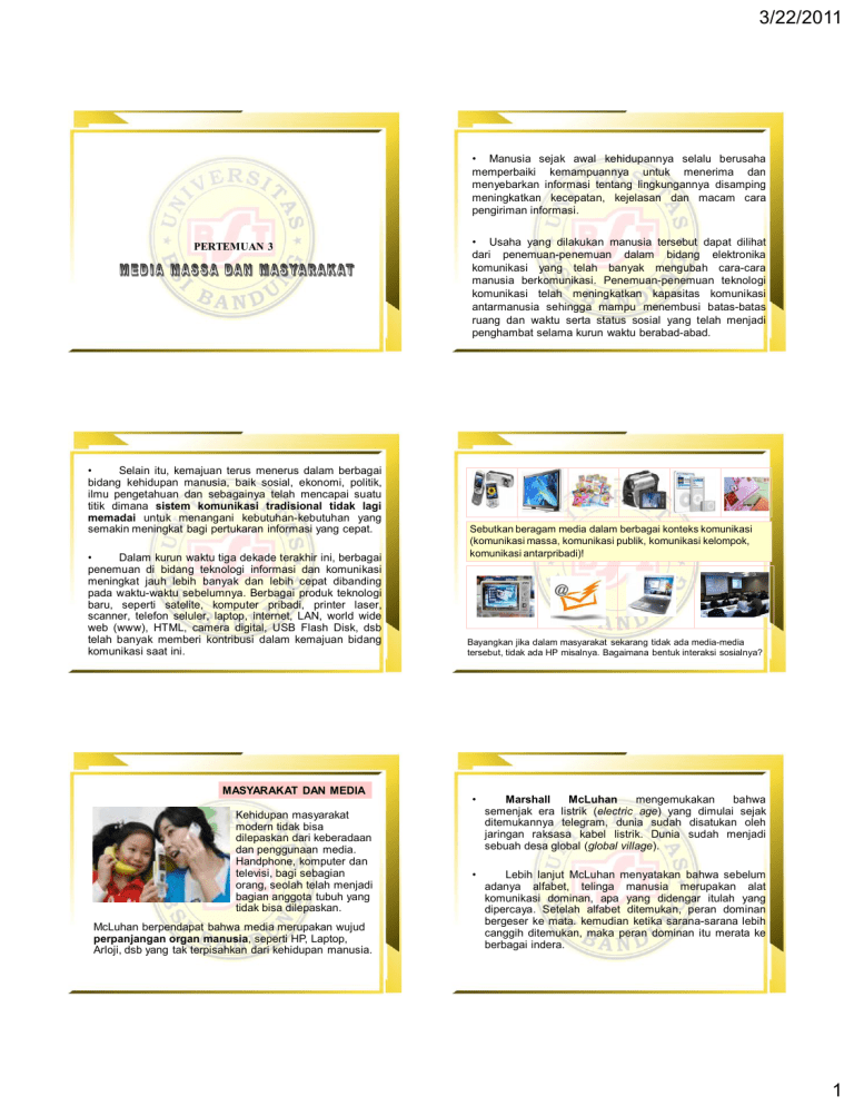 3/22/2011 • Manusia sejak awal kehidupannya selalu berusaha memperbaiki kemampuannya untuk menerima dan menyebarkan informasi tentang lingkungannya disamping meningkatkan kecepatan, kejelasan dan macam cara pengiriman informasi. PERTEMUAN 3 • Selain itu, kemajuan terus menerus dalam berbagai bidang kehidupan manusia, baik sosial, ekonomi, politik, ilmu pengetahuan dan sebagainya telah mencapai suatu titik dimana sistem komunikasi tradisional tidak lagi memadai untuk menangani kebutuhan-kebutuhan yang semakin meningkat bagi pertukaran informasi yang cepat. • Dalam kurun waktu tiga dekade terakhir ini, berbagai penemuan di bidang teknologi informasi dan komunikasi meningkat jauh lebih banyak dan lebih cepat dibanding pada waktu-waktu sebelumnya. Berbagai produk teknologi baru, seperti satelite, komputer pribadi, printer laser, scanner, telefon seluler, laptop, internet, LAN, world wide web (www), HTML, camera digital, USB Flash Disk, dsb telah banyak memberi kontribusi dalam kemajuan bidang komunikasi saat ini. MASYARAKAT DAN MEDIA Kehidupan masyarakat modern tidak bisa dilepaskan dari keberadaan dan penggunaan media. Handphone, komputer dan televisi, bagi sebagian orang, seolah telah menjadi bagian anggota tubuh yang tidak bisa dilepaskan. McLuhan berpendapat bahwa media merupakan wujud perpanjangan organ manusia, seperti HP, Laptop, Arloji, dsb yang tak terpisahkan dari kehidupan manusia. • Usaha yang dilakukan manusia tersebut dapat dilihat dari penemuan-penemuan dalam bidang elektronika komunikasi yang telah banyak mengubah cara-cara manusia berkomunikasi. Penemuan-penemuan teknologi komunikasi telah meningkatkan kapasitas komunikasi antarmanusia sehingga mampu menembusi batas-batas ruang dan waktu serta status sosial yang telah menjadi penghambat selama kurun waktu berabad-abad. Sebutkan beragam media dalam berbagai konteks komunikasi (komunikasi massa, komunikasi publik, komunikasi kelompok, komunikasi antarpribadi)! Bayangkan jika dalam masyarakat sekarang tidak ada media-media tersebut, tidak ada HP misalnya. Bagaimana bentuk interaksi sosialnya? • Marshall McLuhan mengemukakan bahwa semenjak era listrik (electric age) yang dimulai sejak ditemukannya telegram, dunia sudah disatukan oleh jaringan raksasa kabel listrik. Dunia sudah menjadi sebuah desa global (global village). • Lebih lanjut McLuhan menyatakan bahwa sebelum adanya alfabet, telinga manusia merupakan alat komunikasi dominan, apa yang didengar itulah yang dipercaya. Setelah alfabet ditemukan, peran dominan bergeser ke mata. kemudian ketika sarana-sarana lebih canggih ditemukan, maka peran dominan itu merata ke berbagai indera. 1 3/22/2011 MEDIA DAN SIGNIFIKANSINYA Untuk menelaah pernyataan McLuhan, perhatikan gambar2 berikut. (browsing internet, TV mobil, teleconference) • Tanpa media komunikasi seperti mesin cetak, telekomunikasi dan komputer, kita tidak mungkin secara cepat dapat mendistribusikan pesan ke banyak tempat di dunia ini. • Tanpa media komunikasi, kita juga menghadapi keterbatasan ketika harus memperbanyak, menyimpan dan mendapatkan kembali informasi yang akan digunakan. • Media memperluas komunikasi antar manusia dengan meningkatkan 1) Produksi dan distribusi pesan 2) Penerimaan, penyimpanan dan mendapatkan kembali informasi. • Fungsi paling dasar dari media adalah memperluas kemampuan kita untuk memproduksi dan mendistribusikan informasi pada jarak yang luas dalam lingkup ruang maupun waktu. • Produksi mencakup penciptaan menggunakan media komunikasi. pesan dengan • Distribusi memiliki 3 komponen, yaitu Transmission (pengiriman pesan) Reproduction and amplification (penggandaan pesan) Display (kehadiran pesan secara fisik pada sasaran yang dituju). • • • • TIPE-TIPE MEDIA Media komunikasi akan memperluas setiap bentuk komunikasi antar manusia. Adapun tipe-tipe media massa adalah: Mass media (surat kabar, majalah, buku, radio dan televisi) : menggandakan pesan untuk didistribusikan kepada khalayak dalam jumlah yang banyak. Group and organizational media (telepon, intercoms, paging systems, komputer): meningkatkan proses komunikasi diantara individu-individu dalam kelompok atau organisasi. Interpersonal media (surat, greeting cards, telepon) : membantu dalam pertukaran antara dua atau beberapa orang. Interpersonal media dipakai untuk meningkatkan komunikasi antar pribadi. Intrapersonal media (tape recorder, home video, diary) : memperluas kemampuan kita dalam memproduksi, menyimpan atau mendapatkan kembali pesan dimana kita sendiri bertindak sebagai sumber. Media yang membantu dalam produksi, distribusi, reproduksi dan/atau amplifikasi juga memainkan peran penting dalam penerimaan, karena media memungkinkan pesan dapat diakses. • Radio, TV receiver, teleskop dan lain-lain membantu penerimaan informasi visual, sedangkan earphones dan hearing aids memperluas kapabilitas untuk menerima pesan yang auditif. • Dokumen tertulis mempunyai fungsi dasar dalam memperluas usaha kita untuk menyimpan dan mendapatkan kembali informasi. • Information-recording tools yang paling penting sekarang ini adalah komputer, karena kapasitasnya dalam menyimpan, memanipulasi dan mendapatkan kembali pesan-pesan yang dibutuhkan. EVOLUSI MEDIA KOMUNIKASI (from smoke signal to the internet era) Bentuk evolusi dan perkembangan media dari waktu ke waktu yaitu: • 20.000 SM: simbol-sombol yang dipahat di dinding gua; penggunaan genderang (drum) dan asap untuk memberi sinyal satu sama lain. • 1000 SM: gambar-gambar hieroglyphic dan pictographic memberi cara menuju sistem penulisan yang menggunakan alphabet. • Tahun 1500: Johannes Gutenberg menyelesaikan pencetakan Injil dengan menggunakan moveble type. 2 3/22/2011 IMPACT OF MEDIA ON CONTEMPORARY LIFE. • Orang Cina, Jepang dan Korea sebenarnya telah mengembangkan proses percetakan lebih awal (sebelum pertengahan abad 15). • Tahun 1600an: penemuan surat kabar, tahun 1700an: layanan pos dan pertengahan tahun 1800an: telegram dan kode Morse. • Tahu