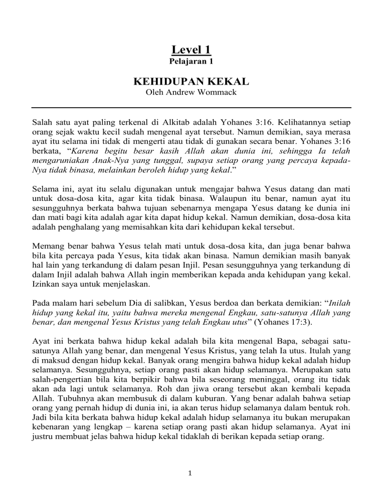 Level 1 Pelajaran 1 KEHIDUPAN KEKAL Oleh Andrew Wommack Salah satu ayat paling terkenal di Alkitab adalah Yohanes 3:16. Kelihatannya setiap orang sejak waktu kecil sudah mengenal ayat tersebut. Namun demikian, saya merasa ayat itu selama ini tidak di mengerti atau tidak di gunakan secara benar. Yohanes 3:16 berkata, “Karena begitu besar kasih Allah akan dunia ini, sehingga Ia telah mengaruniakan Anak-Nya yang tunggal, supaya setiap orang yang percaya kepadaNya tidak binasa, melainkan beroleh hidup yang kekal.” Selama ini, ayat itu selalu digunakan untuk mengajar bahwa Yesus datang dan mati untuk dosa-dosa kita, agar kita tidak binasa. Walaupun itu benar, namun ayat itu sesungguhnya berkata bahwa tujuan sebenarnya mengapa Yesus datang ke dunia ini dan mati bagi kita adalah agar kita dapat hidup kekal. Namun demikian, dosa-dosa kita adalah penghalang yang memisahkan kita dari kehidupan kekal tersebut. Memang benar bahwa Yesus telah mati untuk dosa-dosa kita, dan juga benar bahwa bila kita percaya pada Yesus, kita tidak akan binasa. Namun demikian masih banyak hal lain yang terkandung di dalam pesan Injil. Pesan sesungguhnya yang terkandung di dalam Injil adalah bahwa Allah ingin memberikan kepada anda kehidupan yang kekal. Izinkan saya untuk menjelaskan. Pada malam hari sebelum Dia di salibkan, Yesus berdoa dan berkata demikian: “Inilah hidup yang kekal itu, yaitu bahwa mereka mengenal Engkau, satu-satunya Allah yang benar, dan mengenal Yesus Kristus yang telah Engkau utus” (Yohanes 17:3). Ayat ini berkata bahwa hidup kekal adalah bila kita mengenal Bapa, sebagai satusatunya Allah yang benar, dan mengenal Yesus Kristus, yang telah Ia utus. Itulah yang di maksud dengan hidup kekal. Banyak orang mengira bahwa hidup kekal adalah hidup selamanya. Sesungguhnya, setiap orang pasti akan hidup selamanya. Merupakan satu salah-pengertian bila kita berpikir bahwa bila seseorang meninggal, orang itu tidak akan ada lagi untuk selamanya. Roh dan jiwa orang tersebut akan kembali kepada Allah. Tubuhnya akan membusuk di dalam kuburan. Yang benar adalah bahwa setiap orang yang pernah hidup di dunia ini, ia akan terus hidup selamanya dalam bentuk roh. Jadi bila kita berkata bahwa hidup kekal adalah hidup selamanya itu bukan merupakan kebenaran yang lengkap – karena setiap orang pasti akan hidup selamanya. Ayat ini justru membuat jelas bahwa hidup kekal tidaklah di berikan kepada setiap orang. 1 Beberapa orang mungkin akan berkata, “Hidup kekal adalah hidup selamanya di sorga dan bukan di neraka.” Namun hidup kekal adalah seperti apa yang Yesus katakan di Yohanes 17:3 – Mengenal Allah dan Yesus Kristus. Hal itu lebih dari sekedar mengenal melalui pengetahuan intelektual. Kata “mengenal” sering di gunakan di nas Alkitab untuk menggambarkan satu hubungan pribadi yang paling intim yang dapat anda miliki. Tujuan sebenarnya dari keselamatan adalah bukan agar dapat hidup selamanya di sorga, walaupun itu merupakan sesuatu yang indah. Tujuan sebenarnya dari keselamatan adalah agar anda memiliki ke-intim-an – satu hubungan pribadi dengan Tuhan Allah. Ada banyak sekali manusia yang telah berseru kepada Allah untuk memperoleh pengampunan atas dosa mereka namun mereka tidak punya tujuan untuk memiliki ke-intim-an dengan Allah. Bila kita tidak menjelaskan tujuan sesungguhnya dari keselamatan, maka kita tidak memberitakan pesan Injil dengan benar. Bila kita menawarkan keselamatan sekedar sebagai hal-hal rohani yang menguntungkan kita di masa yang akan datang di dalam ke-kekalan, maka kita sesungguhnya tidak menolong orang lain. Ada banyak orang yang hidupnya di dunia sekarang ini ibarat seperti di neraka. Banyak orang yang sedang mengalami depresi, hidup dalam kemiskinan, sedang menghadapi perseteruan, penolakan, penderitaan, dan kegagalan dalam pernikahan. Banyak orang yang hidupnya hanya sekedar bertahan hidup (survive) dari hari ke hari. Mereka berusaha agar tidak larut tenggelam dalam kehidupan ini. Bila kita menawarkan keselamatan sebagai sesuatu yang hanya terjadi di masa yang akan datang, maka banyak orang tidak akan tertarik akan hal itu oleh karena mereka sedang terlalu sibuk dengan usaha untuk bertahan hidup sekarang ini. Yang benar adalah bahwa Yesus datang bukan hanya untuk merubah masa depan kita di dalam ke-kekalan agar dapat hidup diberkati di sorga dan menghindari penghukuman dan kutuk di neraka, tapi Yesus datang juga untuk membebaskan kita dari dunia yang sekarang dan jahat ini (Galatia 1:4). Yesus datang untuk memberi anda satu hubungan pribadi dan intim dengan Allah Bapa pada hari ini. Yesus datang untuk membawa anda kembali ke dalam hubungan yang dekat secara pribadi dengan Dia. Yesus mengasihi anda. Yesus ingin mengenal anda secara pribadi. Yesus ingin memberi anda satu kehidupan yang jauh lebih baik di banding apa yang anda dapat peroleh dari manapun juga. Yesus menyampaikannya seperti ini di Yohanes 10:10: “Pencuri (Iblis) datang hanya untuk mencuri dan membunuh dan membinasakan; Aku datang, supaya mereka mempunyai hidup, dan mempunyainya dalam segala kelimpahan.” Allah ingin memberi anda hidup yang kekal. Allah ingin memberi anda hidup yang berkelimpahan, dan saya percaya anda sangat memerlukannya saat ini – dan itu merupakan sesuatu 2 yang anda ingini. Kristus mati bukan hanya untuk mengampuni dosa-dosa anda, tapi untuk membawa anda dekat pada Dia. Bila anda tidak mengenal Tuhan, maka anda perlu mengenal Dia agar bisa dekat. Bila anda sudah lahir baru, maka anda perlu bukan hanya memperoleh pengampunan atas dosa-dosa anda, tapi juga masuk ke dalam kehidupan yang kekal bersama dengan Bapa. Fakta mengenai Hidup Kekal 1. 2. 3. 4. 5. Tujuan dari pesan Injil adalah kehidupan kekal (Yohanes 3:16) Kehidupan kekal adalah mengenal Allah (Yohanes 17:3) Mengenal Allah merupakan satu hubungan yang intim (1 Kor 6:16-17) Kehidupan kekal tersedia sekarang ini juga (1 Yohanes 5:12) Allah ingin miliki sebuah hubungan pribadi dengan anda (Wahyu 3:20) Pertanyaan-Pertanyaan 1. Baca Yoh 3:1