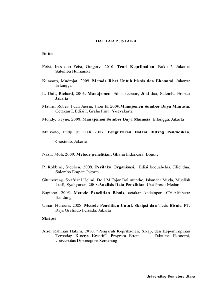 DAFTAR PUSTAKA Buku. Feist, Jess dan Feist, Gregory. 2010. Teori Kepribadian. Buku 2. Jakarta: Salemba Humanika Kuncoro, Mudrajat. 2009. Metode Riset Untuk bisnis dan Ekonomi. Jakarta: Erlangga L. Daft, Richard, 2006. Manajemen, Edisi keenam, Jilid dua, Salemba Empat: Jakarta Mathis, Robert l dan Jacsin, Jhon H. 2009.Manajemen Sumber Daya Manusia. Cetakan I, Edisi I. Graha Ilmu: Yogyakarta Mondy, wayne, 2008. Manajemen Sumber Daya Manusia, Erlangga: Jakarta Mulyono, Pudji & Djali 2007. Pengukuran Dalam Bidang Pendidikan, Grasindo: Jakarta Nazir, Moh, 2009. Metode penelitian, Ghalia Indonesia: Bogor. P. Robbins, Stephen, 2008. Perilaku Organisasi, Edisi keduabelas, Jilid dua, Salemba Empat: Jakarta Situmorang, Syafrizal Helmi, Doli M.Fajar Dalimunthe, Iskandar Muda, Muclish Lutfi, Syahyunan 2008.Analisis Data Penelitian, Usu Press: Medan Sugiono. 2005. Metode Penelitian Bisnis, cetakan kedelapan. CV.Alfabeta: Bandung Umar, Husaein. 2008. Metode Penelitian Untuk Skripsi dan Tesis Bisnis. PT. Raja Grafindo Persada: Jakarta Skripsi Arief Rahman Hakim, 2010. “Pengaruh Kepribadian, Sikap, dan Kepemimpinan Terhadap Kinerja Kreatif”. Program Strata – 1, Fakultas Ekonomi, Universitas Diponegoro Semarang Universitas Sumatera Utara Veronika A Simanjuntak, 2012. “Analisis Pengaruh Kepribadian Terhadap Kinerja Karyawan Pada Carrefour Citra Garden Padang Bulan Medan”.Program Strata – 1 reguler, Fakultas Ekonomi, Universitas Sumatera Utara Medan Anugrah Agus Putra, 2012. “Analisi Pengaruh Kepribadian Berdasarkan Teori Lima Besar (Big Five Model) terhadap Kinerja Karyawan Hotel Grand Darusalam Residences Syariah Medan”. Program Strata – 1 reguler, Fakultas Ekonomi, Universitas Sumatera Utara Medan. Rini Metia, 2009. “Analisis Pengaruh Teori Lima Besar (Big Five Model) terhadap Kinerja Karyawan Pada Kantor Wilayah Perum Pegadaian Medan”. Program Strata – 1 reguler, Fakultas Ekonomi, Universitas Sumatera Utara Medan. Internet Mangun, Tatang, 2010 http://tatangmangu.wordpress.com/2010/04/19/ukuransampel-rumus Rahayu, Astiti, 2012. Metodologi Penelitian http://astitirahayui.wordpress.com/2012/05/15/meodologi-penelitian/ Universitas Sumatera Utara