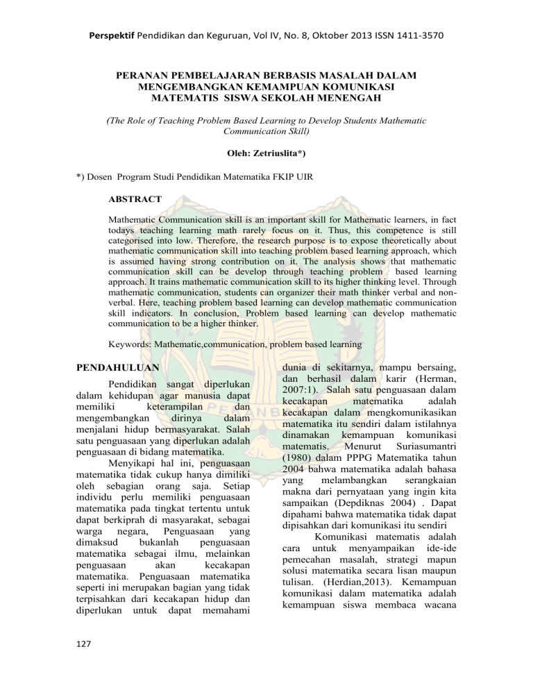 Perspektif Pendidikan dan Keguruan, Vol IV, No. 8, Oktober 2013 ISSN 1411-3570 PERANAN PEMBELAJARAN BERBASIS MASALAH DALAM MENGEMBANGKAN KEMAMPUAN KOMUNIKASI MATEMATIS SISWA SEKOLAH MENENGAH (The Role of Teaching Problem Based Learning to Develop Students Mathematic Communication Skill) Oleh: Zetriuslita*) *) Dosen Program Studi Pendidikan Matematika FKIP UIR ABSTRACT Mathematic Communication skill is an important skill for Mathematic learners, in fact todays teaching learning math rarely focus on it. Thus, this competence is still categorised into low. Therefore, the research purpose is to expose theoretically about mathematic communication skill into teaching problem based learning approach, which is assumed having strong contribution on it. The analysis shows that mathematic communication skill can be develop through teaching problem based learning approach. It trains mathematic communication skill to its higher thinking level. Through mathematic communication, students can organizer their math thinker verbal and nonverbal. Here, teaching problem based learning can develop mathematic communication skill indicators. In conclusion, Problem based learning can develop mathematic communication to be a higher thinker. Keywords: Mathematic,communication, problem based learning PENDAHULUAN Pendidikan sangat diperlukan dalam kehidupan agar manusia dapat memiliki keterampilan dan mengembangkan dirinya dalam menjalani hidup bermasyarakat. Salah satu penguasaan yang diperlukan adalah penguasaan di bidang matematika. Menyikapi hal ini, penguasaan matematika tidak cukup hanya dimiliki oleh sebagian orang saja. Setiap individu perlu memiliki penguasaan matematika pada tingkat tertentu untuk dapat berkiprah di masyarakat, sebagai warga negara, Penguasaan yang dimaksud bukanlah penguasaan matematika sebagai ilmu, melainkan penguasaan akan kecakapan matematika. Penguasaan matematika seperti ini merupakan bagian yang tidak terpisahkan dari kecakapan hidup dan diperlukan untuk dapat memahami 127 dunia di sekitarnya, mampu bersaing, dan berhasil dalam karir (Herman, 2007:1). Salah satu penguasaan dalam kecakapan matematika adalah kecakapan dalam mengkomunikasikan matematika itu sendiri dalam istilahnya dinamakan kemampuan komunikasi matematis. Menurut Suriasumantri (1980) dalam PPPG Matematika tahun 2004 bahwa matematika adalah bahasa yang melambangkan serangkaian makna dari pernyataan yang ingin kita sampaikan (Depdiknas 2004) . Dapat dipahami bahwa matematika tidak dapat dipisahkan dari komunikasi itu sendiri Komunikasi matematis adalah cara untuk menyampaikan ide-ide pemecahan masalah, strategi mapun solusi matematika secara lisan maupun tulisan. (Herdian,2013). Kemampuan komunikasi dalam matematika adalah kemampuan siswa membaca wacana Perspektif Pendidikan dan Keguruan, Vol IV, No. 8, Oktober 2013 ISSN 1411-3570 matematika dengan pemahaman, mampu mengembangkan bahasa dan simbol matematika sehingga dapat mengkomunikasikan secara lisan dan tulisan, mampu menggambarkan secara visual dan merefleksikan gambar atau diagram ke dalam ide matematika, mampu merumuskan dan mampu memecahkan masalah melalui penemuan (Tanti,2007). Melalui komunikasi, siswa dapat mengeksplorasi dan mengkonsolidasikan pemikiran matematisnya, pengetahuan dan pengembangan dalam memecahkan masalah dengan menggunakan bahasa matematis dapat dikembangkan sehingga komunikasi matematis siswa dapat dibentuk. Menurut Hirschfeld (2008) dalam Pratiwi,dkk (2013) bahwa komunikasi adalah bagian penting dari matematika dan pendidikan matematika. Untuk mencapainya, perlu mengembangkan pembelajaran matematika yang membangun komunikasi dan mengembangkan potensi yang dimiliki siswa. Ini sejalan dengan tujuan umum pembelajaran matematika yaitu: (1) belajar untuk berkomunikasi (mathematical communication); (2) belajar untuk bernalar (mathematical reasoning); (3) belajar untuk memecahkan masalah (mathematical problem solving); (4) belajar untuk mengaitkan ide (mathematical connections); (5) pembentukan sikap positif terhadap matematika (positive attitudes toward mathematics) (NCTM ,2000 dalam Somakin ,2007) Tujuan umum di atas juga sejalan BSNP (2006:346) bahwa mata pelajaran matematika bertujuan agar siswa memiliki kemampuan sebagai berikut: 1. Memahami konsep matematika, menjelaskan keterkaitan antarkonsep dan mengaplikasikan konsep atau algoritma, secara luwes, akurat, efisien dan tepat dalam pemecahan masalah. 2. Menggunakan penalaran pada pola dan sifat, melakukan manipulasi matematika dalam membuat generalisasi, menyusun bukti atau menjelaskan gagasan dan pernyataan matematika. 3. Memecahkan masalah yang meliputi kemampuan memahami masalah, merancang model matematika, menyelesaikan model dan menafsirkan solusi yang diperoleh. 4. Mengkomunikasikan gagasan dengan simbol, tabel, diagram atau media lain untuk memperjelas keadaan atau masalah. 5. Memiliki sikap menghargai kegunaan matematika dalam kehidupan, yaitu memiliki rasa ingin tahu, perhatian dan minat dalam mempelajari matematika, serta sikap ulet dan percaya diri dalam pemecahan masalah. Namun kenyataan di sekolah menengah, pengembangan kemampuan komunikasi matematis ini tidak begitu mendapat perhatian, baik dari guru maupun dari pihak sekolah, sehingga berdampak pada kompetensi siswa yang rendah. Dari hasil penelitian sebelumnya dan analisis di lapangan, ada beberapa masalah yang ditemukan dalam proses pembelajaran yang berhubungan dengan rendahnya kemampuan komunikasi matematis siswa. Masalahnya diantaranya yaitu seperti hasil penelitian berikut ini : 1) Siswa sulit menuliskan atau memodelkan apa yang diketahui, yang ditanya dari soal yang diberikan. 2) Siswa mengalami kesulitan dalam mengomunikasikan secara lisan alasan dari apa yang mereka lakukan (Izzati, 2010) 128 Perspektif Pendidikan dan Keguruan, Vol IV, No. 8, Oktober 2013 ISSN 1411-3570 3) Siswa sulit mengomunikasikan informasi visual terutama dalam mengomunikasikan sebuah lingkungan tiga dimensi (misalnya, sebuah bangunan terbuat dar
