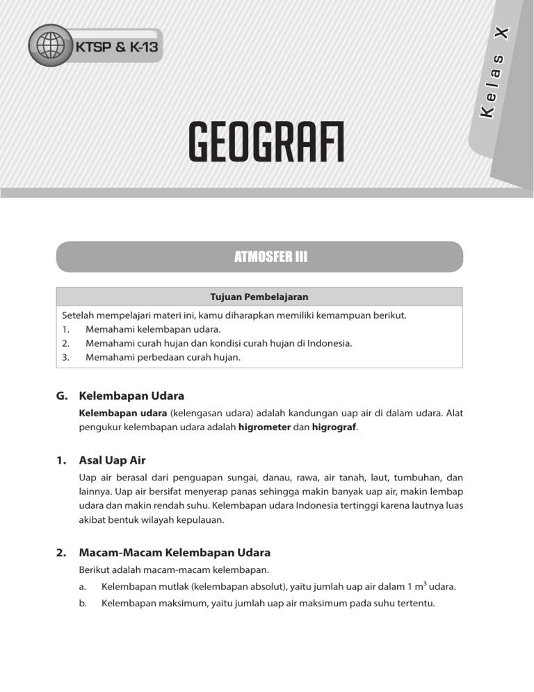 X Geograļ¬ ATMOSFER III Tujuan Pembelajaran Setelah mempelajari materi ini, kamu diharapkan memiliki kemampuan berikut. 1. Memahami kelembapan udara. 2. Memahami curah hujan dan kondisi curah hujan di Indonesia. 3. Memahami perbedaan curah hujan. G. Kelembapan Udara Kelembapan udara (kelengasan udara) adalah kandungan uap air di dalam udara. Alat pengukur kelembapan udara adalah higrometer dan higrograf. 1. Asal Uap Air Uap air berasal dari penguapan sungai, danau, rawa, air tanah, laut, tumbuhan, dan lainnya. Uap air bersifat menyerap panas sehingga makin banyak uap air, makin lembap udara dan makin rendah suhu. Kelembapan udara Indonesia tertinggi karena lautnya luas akibat bentuk wilayah kepulauan. 2. Macam-Macam Kelembapan Udara Berikut adalah macam-macam kelembapan. a. Kelembapan mutlak (kelembapan absolut), yaitu jumlah uap air dalam 1 m³ udara. b. Kelembapan maksimum, yaitu jumlah uap air maksimum pada suhu tertentu. Kela s KTSP & K-13 c. Kelembapan relatif (kelembapan nisbi), yaitu perbandingan antara jumlah uap air dalam 1 m³ udara dengan jumlah uap air maksimum pada suhu tertentu yang dinyatakan dalam persen. Rumus: Kelembapan Re latif = Kelembapan mutlak ´10 00 % Kelembapan maksimum Contoh Soal • Sebanyak 1 m³ udara mengandung uap air 4 gram. Pada suhu 28°C udara tersebut mengandung uap air 25 gram. Kelembapan relatifnya adalah … Jawab: 4g × 100% = 16% 25g Kelembapan relatif = • Udara pada ruangan berukuran 2 × 2 × 2 meter mengandung uap air 240 gram. Pada suhu 21°C udara tersebut mengandung uap air 50 gram. Hitunglah kelembapan absolut dan kelembapan nisbinya. Jawab: Kelembapan absolut = Kelembapan nisbi = 240 g = 30 g/m³ 8m3 30 g × 100% = 60% 50 g Super "Solusi Quipper" Kelembapan relatif (kelembapan nisbi). k → angka kecil → perbandingan B → angka besar H. Curah Hujan Curah hujan adalah banyaknya air hujan yang jatuh, baik cair maupun padat berupa hujan air, hujan salju, dan hujan es. Alat pengukur curah hujan adalah fluviometer atau ombrometer dengan menggunakan satuan milimeter atau sentimeter. Curah hujan 2 harian diukur dengan menampung air hujan dengan gelas ukur yang terdapat pada alat pengukur. Garis pada peta yang menghubungkan tempat-tempat yang memiliki curah hujan sama disebut isohyet. 1. Jenis Hujan Berikut adalah jenis-jenis hujan. a. Hujan konveksi/zenital/ekuatorial, yaitu hujan yang terjadi karena udara panas yang mengandung uap air bergerak konveksi (vertikal), lalu berkondensasi menjadi awan dan jatuh sebagai hujan di daerah tropis. Di Indonesia terjadi sepanjang tahun terutama di musim kemarau dan pancaroba. Ciri-ciri hujan konveksi, yaitu sebagai berikut. 1.) Deras di musim kemarau. 2.) Membentuk awan cumulonimbus. 3.) Lebat. 4.) Singkat. 5.) Petir. 6.) Angin kencang. 7.) Banjir. b. Hujan orografis/naik pegunungan, yaitu hujan yang terjadi karena udara mengandung uap air dipaksa naik ke pegunungan (mendaki lereng pegunungan), lalu berkondensasi menjadi awan dan jatuh sebagai hujan di lereng pertama. Udara yang sudah kosong uap air terus bergerak ke atas, lalu menuruni lereng berikutnya membentuk angin terjun yang kering dan panas. Daerah yang dilalui angin terjun ini disebut daerah bayangan hujan seperti Kota Palu dan Luwuk di Sulawesi Tengah. c. Hujan frontal, yaitu hujan yang terjadi karena pertemuan massa udara panas dengan massa udara dingin di lintang sedang (40°–60°). Daerah pertemuannya disebut front. Massa udara panas yang bergerak naik, lalu berkondensasi menjadi awan dan jatuh sebagai hujan. 2. Kondisi Curah Hujan di Indonesia Curah hujan rata-rata di Indonesia tinggi (±3.000 mm/tahun) karena > 100 milimeter per bulan, namun tidak merata. Tingginya curah hujan disebabkan oleh beberapa faktor sebagai berikut. a. Laut yang luas sekitar dua per tiga dari seluruh wilayah Indonesia sehingga kaya uap air dan konveksi sinar matahari membentuk kondensasi awan yang banyak. 3 b. Banyak gunung dan pegunungan yang mempercepat proses kondensasi. c. Angin muson yang melewati Indonesia, khususnya angin muson barat yang kaya uap air. d. Terletak di daerah ekuator sehingga terjadi kenaikan udara akibat pemanasan yang menimbulkan hujan lebat dan guntur. 3. Pola Curah Hujan di Indonesia a. Pantai barat curah hujannya lebih besar dibandingkan pantai timur. b. Wilayah bagian barat curah hujannya lebih besar dan makin ke timur curah hujan makin sedikit atau kecil c. Curah hujan lokal bertambah seiring pertambahan ketinggian. d. Curah hujan maksimum bergeser dari barat ke timur. 1.) November: curah hujan terbanyak di pantai barat Sumatra dan Bengkulu. 2.) Desember: curah hujan terbanyak di Lampung sampai Bangka. 3.) Januari: curah hujan terbanyak di Pantura–Bali–NTB–NTT. 4.) Mei: curah hujan terbanyak di Sulawesi sampai Maluku. e. Pada musim hujan, hujan jatuh di Sumatra, Kalimantan, dan Jawa. f. Pada musim kemarau, hujan jatuh di Maluku dan Sulawesi. g. Pada saat pancaroba, hujan jatuh di daerah rawa yang luas dan daerah pedalaman, seperti Bandung, Purwokerto, dan Malang. h. Batas daerah hujan Indonesia barat dengan Indonesia timur sekitar 120°BT (Sulawesi). 4. Tanda-Tanda Turun Hujan Berikut adalah tanda-tanda akan turunnya hujan di suatu wilayah. a. Terbentuknya awan nimbus, baik nimbostratus maupun cumulonimbus. b. Kelembapan relatif > 60 %. c. Udara panas sejenak. 5. Perbedaan Curah Hujan Perbedaan curah hujan disebabkan oleh beberapa faktor berikut. a. Letak DKAT (Daerah Konvergensi Antartopik). DKAT (ekuator termal) adalah daerah tropis dengan suhu tinggi sehingga penguapan besar, kondensasi awan 4 besar, dan curah hujan konveksi besar. Oleh karena DKAT suhunya tinggi, tekanan udaranya rendah sehingga merupakan tempat pertemuan dua angin dari arah yang berlawanan. Kedua angin yang dimaksud adalah angin pasat timur laut dan angin pasat tenggara dari daerah subtropis dan bertemu di daerah tropis, lalu menguap membentuk hujan konveksi. DKAT curah hujannya tinggi. b. Letak geografis. Pulau-pulau yang dekat dengan Asia, curah hu