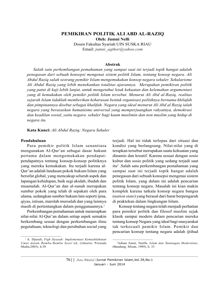 PEMIKIRAN POLITIK ALI ABD AL-RAZIQ Oleh: Jumni Nelli Dosen Fakultas Syariah UIN SUSKA RIAU Email: jumni_aqthor@yahoo.com Abstrak Salah satu perkembangan pemahaman yang sampai saat ini terjadi topik hangat adalah penegasan dari sebuah konsepsi mengenai sistem politik Islam, tentang konsep negara. Ali Abdul Raziq salah seorang pemikir Islam mengemukakan konsep negara sekuler. Sekularisme Ali Abdul Raziq yang lebih menekankan totalitas ajarannya. Merupakan pemikiran politik yang patut di kaji lebih lanjut, untuk mengetahui letak kekuatan dan kelemahan argumentasi yang di kemukakan oleh pemikir politik Islam tersebut. Menurut Ali Abd al-Raziq, realitas sejarah Islam tidaklah memberikan keharusan bentuk organisasi politiknya bernama khilafah dan pimpinannya disebut sebagai khalifah. Negara yang ideal menurut Ali Abd al Raziq ialah negara yang berasaskan humanisme universal yang memperjuangkan rakyatnya, demokrasi dan keadilan sosial, yaitu negara sekuler bagi kaum muslimin dan non muslim yang hidup di negara itu. Kata Kunci: Ali Abdul Raziq; Negara Sekuler Pendahuluan Para pemikir politik Islam senantiasa mengunakan Al-Qur’an sebagai dasar hukum pertama dalam mengemukakan pendapatpendapatnya tentang konsep-konsep politiknya yang mereka kemukakan. Itu terjadi karena alQur’an adalah landasan pokok hukum Islam yang bersifat global, yang mencakup seluruh aspek dan lapangan kehidupan, baik segi akidah, ibadah dan muamalah. Al-Qur’an dan al-sunah merupakan sumber pokok yang telah di sepakati oleh para ulama, sedangkan sumber hukum lain seperti ijma, qiyas, istisan, marslah mursalah dan yang lainnya masih di pertentangkan dalam penggunaannya.1 Perkembangan pemahaman untuk menerapkan nilai-nilai Al-Qur’an dalam setiap aspek semakin berkembang sesuai dengan perkembangan ilmu pegetahuan, teknologi dan perubahan social yang terjadi. Hal ini tidak terlepas dari situasi dan kondisi yang berlangsung. Nilai-nilai yang di terapkan tersebut merupakan suatu kekuatan yang dinamis dan kreatif. Karena sesuai dengan sosio kultur dan sosio politik yang sedang terjadi saat itu2 .Salah satu perkembangan pemahaman yang sampai saat ini terjadi topik hangat adalah penegasan dari sebuah konsepsi mengenai sistem politik Islam, yang dalam ini adalah pencarian tentang konsep negara. Masalah ini kian makin komplek karena tatkala konsep negara bangsa (nation state) yang berasal dari barat berpengaruh di praktekan dalam lingkungan Islam. Konsep tentang negara telah menjadi perhatian para pemikir politik dan filosof muslim sejak klasik sampai modern dalam pencarian mereka tentang konsep Negara yang ideal bagi masyarakat tak terkecuali pemikir Islam. Pemikir dan pencarian konsep tentang negara adalah ijtihad 1 A. Djazuli, Fiqh Siyasah: Implementasi Kemashlahatan Umat dalam Rambu-Rambu Syari’ah, (Jakarta: Prenada Media,2003), h.58 76|| 2 Adnan Amal, Taufik, Islam dan Tantangan Modernitas, (Bandung: Mizan, 1989), h. 33 :Jurnal Pemikiran Islam,Vol.39,No.1 Januari - Juni 2014 Jumni Nelli: Pemikiran Politik Ali Abd Al-Raziq politik dalam rangka menemukan nilai-nilai Islam dalam konsep sistem politik yang sedang berlangsung. Hal ini di maksudkan untuk : (1) menemukan identitas Islam tentang negara (aspek teoritis dan formal) ini berdasarkan asumsi bahwa Islam memiliki konsep tertentu tentang negara (2) melakukan idealisasi dari persepsi Islam tentang negara dan menawarkan prinsif-prinsif dasar tentang etika dan moralitas. Dalam konsep pemikiran politik ada tiga hubungan negara dan Agama yaitu : 1. Agama dan negara tidak bisa di pisahkan (menekankan paradigma integralistik) 2. Agama dan negara berhubungan secara simbiotik 3. Sekuralistik (agama dan negara di tempatkan secara terpisah) Ketiga paradigma tersebut yang muncul dari pendekatan dan pemahaman yang berbeda, menampilkan pola pemikiran yang berbeda pula. Namun kendati dalam pemahaman dan pendekatan berbeda ketiganya mempunyai tujuan yang sama, yaitu menemukan rekonsiliasi antara idealitas agama dan realitas politik. Rekonsiliasi antara cita-cita agama dan realitas politik menjadi tugas utama para pemikir politik Islam. Hal ini merupakan tuntunan karena hubungan antara negara dan Agama sering memunculkan dalam kenyataan sejarah dan menampilkan fenomena kesenjangan dan pertentangan. Fenomena ini bersumber pada dua sebab yaitu : terdapat perbedaan konsepsi antara agama dan politik yang menimbulkan kesukaran pemaduan dalam praktek-praktek dan terdapat penyimpangan praktek politik dari etika dan moralitas agama. Dalam usaha dan penerapan etika dan moralitas agama terhadap politik sangatlah beragam. Para pemikir politik Islam berupaya dengan berbagai pendekatan. Sedangkan menurut Ali Abdul Raziq tentang konsep negara ialah sekuler. Sekularisme Ali Abdul Raziq yang lebih menekankan totalitas ajarannya. Merupakan 77|| pemikiran politik yang patut di kaji lebih lanjut, untuk mengetahui letak kekuatan dan kelemahan argumentasi yang di kemukakan oleh pemikir politik Islam tersebut. Untuk itulah penulis merasa perlu untuk lebih mengetahui kerangka acuan atau argumentasi dalam upaya mewujudkan kerangka ideal masyarakat yang di lakukan oleh pemikir tersebut. Biografi Ali Abd Raziq Ali Abd Al-Raziq nama lengkapmya syeikh Ali Abd Al-Raziq salah satu seorang keluarga yang terkenal yang berdiam di as’Said yang termasuk wilayah Al-Mania, suatu keluarga hartawan dengan tanah-tanah pertanian yang luas atau meminjam istilah yang berlaku sekarang ini, keluarga feodal ayahnya yang bernama Hasan Pasha atau Abdul Raziq Pasha Sr, adalah seorang pembesar yang terpandang di daerah pinggiran dan Ali Abd Raziq di lahir di pedalaman propinsi Menia pada tahun 1888 ia keluarga feodal yang aktif dalam kegiatan politik. ayah yang berkicinpung dalam dunia politik bahkan ia pernah menjadi wakil ketua Partai Rakyat (Hizbu alUmmah) pada tahun 1907. Setelah revolusi tahun 1919, Al-Asharar Al-Dusturiyah, partai ini adalah partai kelanjutan Hizbu Al-Ashrar al Ummah yang mempunyai dukungan yang rapat dengan Ing