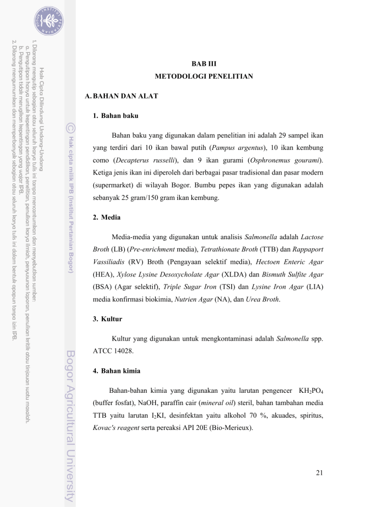BAB III METODOLOGI PENELITIAN A. BAHAN DAN ALAT 1. Bahan baku Bahan baku yang digunakan dalam penelitian ini adalah 29 sampel ikan yang terdiri dari 10 ikan bawal putih (Pampus argentus), 10 ikan kembung como (Decapterus russelli), dan 9 ikan gurami (Osphronemus gourami). Ketiga jenis ikan ini diperoleh dari berbagai pasar tradisional dan pasar modern (supermarket) di wilayah Bogor. Bumbu pepes ikan yang digunakan adalah sebanyak 25 gram/150 gram ikan kembung. 2. Media Media-media yang digunakan untuk analisis Salmonella adalah Lactose Broth (LB) (Pre-enrichment media), Tetrathionate Broth (TTB) dan Rappaport Vassiliadis (RV) Broth (Pengayaan selektif media), Hectoen Enteric Agar (HEA), Xylose Lysine Desoxycholate Agar (XLDA) dan Bismuth Sulfite Agar (BSA) (Agar selektif), Triple Sugar Iron (TSI) dan Lysine Iron Agar (LIA) media konfirmasi biokimia, Nutrien Agar (NA), dan Urea Broth. 3. Kultur Kultur yang digunakan untuk mengkontaminasi adalah Salmonella spp. ATCC 14028. 4. Bahan kimia Bahan-bahan kimia yang digunakan yaitu larutan pengencer KH2PO4 (buffer fosfat), NaOH, paraffin cair (mineral oil) steril, bahan tambahan media TTB yaitu larutan I2KI, desinfektan yaitu alkohol 70 %, akuades, spiritus, Kovac's reagent serta pereaksi API 20E (Bio-Merieux). 21 5. Alat Alat yang digunakan dalam penelitian ini adalah autoklaf, oven, inkubator 35 °C dan 42 °C, refrigerator dan freezer, cool bag, stomacher, vorteks, mikropipet dan tipnya, gelas ukur, pipet Mohr, gelas piala, batang pengaduk, bunsen, erlenmeyer, plastik HDPE, ose mata bulat dan lurus, bulb, neraca analitik, tabung reaksi dan raknya, cawan petri, steril, pisau, botol semprot, tutup kapas, dan aluminium foil. B. METODE PENELITIAN Secara garis besar penelitian ini terdiri dari dua tahap yaitu penelitian tahap I dan penelitian tahap II. Penelitian tahap I meliputi persiapan sampel, analisis total mikroba (AOAC, 1990), analisis Salmonella (BAM, 2007), dan identifikasi Salmonella (BAM, 2008). Sedangkan penelitian tahap II merupakan uji evaluasi ketahanan Salmonella terhadap proses pengukusan dengan dan tanpa bumbu setelah sampel dikontaminasi dalam jumlah tinggi 105 cfu/gram dan pengaruhnya terhadap kualitas mikrobiologi total mikroba secara umum. Diagram alir metode penelitian dapat dilihat pada Gambar 1 dan Gambar 2. Pengambilan sampel Persiapan sampel Analisis Total Mikroba Analisis Salmonella Chromogenic Media Identifikasi dengan API 20E Gambar 1. Diagram Alir Metode Penelitian Tahap I 22 Sampel Inokulasi dengan kultur murni Salmonella spp. sebanyak 105 cfu (kontaminasi tinggi) Didiamkan selama ±30 menit Tanpa Bumbu Dengan Bumbu (25 gram/150 gram ikan) Kukus selama 90 menit Analisis Kuantitatif Total Mikroba pada t-0’, t-15’, t-30’, t-45’, t-60’, t-75’, t-90’ waktu pengukusan Analisis Kuantitatif Total Salmonella pada t-0’, t-15’, t-30’ waktu pengukusan Analisis Kualitatif Salmonella pada t-15’ waktu pengukusan Gambar 2. Diagram Alir Metode Penelitian Tahap II 1. Penelitian Tahap I 1.1. Pengambilan Sampel Sampel yang diambil terdiri dari ikan bawal, kembung, dan gurami. Metode yang digunakan untuk pengambilan sampel adalah metode purposive sampling technique dimana hasil yang diperoleh merupakan gambaran kasar tentang suatu keadaan. Metode pemilihan sampel tidak dilakukan secara random tetapi dilakukan atas dasar pertimbangan peneliti dimana 23 diasumsikan bahwa unsur-unsur yang dikehendaki telah ada dalam anggota sampel yang diambil (Nasution, 2003). Sampel yang dianalisis berasal dari 7 pasar modern (supermarket) dan 3 pasar tradisional, dimana dari masing-masing pasar jenis sampel yang di ambil terdiri dari tiga jenis ikan yaitu ikan bawal, kembung, dan gurami. Salah satu pasar tradisional, ketersediaan terhadap salah satu jenis sampel uji tidak ada yaitu sampel ikan gurami sehingga jumlah total sampel yang dianalisis berkurang satu menjadi 29 sampel. Tempat yang menjadi lokasi pengambilan sampel di pasar modern meliputi : Giant Botani Square (GBS), Giant Taman Yasmin (GTY), Giant Sindang Barang (GSB), Giant Pangrango (GPR), Giant Padjajaran (GPJ), Yogya Mall (YGM), dan Bogor Trade Mall (BTM). Sementara itu, tempat yang menjadi lokasi pengambilan sampel di pasar tradisional meliputi : Pasar Anyar (PSA), Pasar Bogor (PSB), dan Pasar Induk (PSI). Tabel 8. Koleksi Sampel Ikan Segar pada Berbagai Jenis Pasar di wilayah Bogor Sumber Jenis ikan Kondisi Sampel Jumlah sampel Pasar Modern Bawal Segar 7 Pasar Modern Kembung Segar 7 Pasar Modern Gurami Segar 7 Pasar Tradisional Bawal Segar 3 Pasar Tradisional Kembung Segar 3 Pasar Tradisional Gurami Segar 2 Total sampel 29 Waktu pengambilan sampel adalah pada pagi hari yaitu sekitar pukul 06.00 WIB untuk pasar tradisional dan pukul 09.00 WIB untuk pasar modern yaitu pada saat supermarket dibuka. Proses pengambilan sampel dilakukan dengan cara membeli sampel sebanyak ± 350 gram. Umur sampel yang dianalisis adalah 4 ± 2 jam sejak ikan sampai dari agen sampai ke pasar tradisional dan 2 ± 1 jam sejak ikan sampai dari agen ke pasar modern. 24 Selanjutnya sampel dimasukkan ke dalam plastik steril yang sebelumnya telah dipersiapkan terlebih dahulu. Setelah dimasukkan ke dalam plastik steril sampel dimasukkan ke dalam cool bag yang telah berisi es, tujuannya agar suhu menjadi rendah seperti dalam refrigerator sehingga pertumbuhan mikroba menjadi terhambat dan kondisi mikroba awal tetap terjaga. Selanjutnya sampel uji segera dibawa ke laboratorium untuk dianalisis. Selain itu, penggunaan plastik steril bertujuan menjaga sampel agar tetap berada pada kondisi awal yaitu tidak terjadi kontaminasi silang yang mungkin saja terjadi selama sampel dibawa ke laboratorium. Selain itu suhu rendah cool bag juga bertujuan untuk menghambat pembusukkan yang terjadi pada ikan yang diakibatkan oleh mikroba pembusuk. Pengambilan bagian ikan untuk analisis dilakukan dengan cara mengambil dari tiga tempat yaitu kepala, perut, dan ekor. Hal ini untuk mewakili dari keseluruhan bagian ikan, di