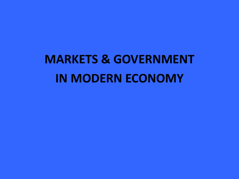 MARKETS & GOVERNMENT IN MODERN ECONOMY MARKETS & GOVERNMENT IN MODERN ECONOMY A. MARKET B. PERDAGANGAN, UANG DAN KAPITAL C. PERAN PEMERINTAH DALAM PEREKONOMIAN A. MARKET Pasar Dan Harga Market Equilibrium Bagaimana Pasar Memecahkan 3 Persoalan Dasar Perekonomian (What, How & For Whom) Pengaruh Selera (Taste) & Tehnologi The Invisible Hand B. PERDAGANGAN, UANG & KAPITAL Perdagangan, Spesialisasi & Pembagian Tenaga Kerja (Division of Labor) Uang: “The Lubricant of Exchange” Capital (Modal) C. PERAN PEMERINTAH DALAM PEREKONOMIAN Mendorong Efficiency Memastikan Keadilan Redistribusi pendapatan Menjaga “Macroeconomic Stability & Growth” Adam Smith - The Wealth of Nation “….setiap individu berusaha agar setiap modal yg dimilikinya bisa menghasilkan keuntungan yg terbaik baginya. Mereka umumnya bukan bermaksud atau berniat untuk memenuhi kebutuhan masyarakat. Niat mereka hanyalah mencukupi kebutuhan mereka sendiri, keinginan mereka sendiri. Dan dalam hal ini mereka seolah-olah di bimbing oleh tangan yg tak tampak (invisible hand) untuk tanpa sadar pada akhirnya berujung bukan saja pada pemenuhan kebutuhan pribadinya , tetapi juga kebutuhan masyarakat. Dengan maksud hanya untuk memenuhi kebutuhan pribadinya masing-masing, mereka pada akhirnya juga memenuhi kebutuhan masyarakat umum secara jauh lebih effektif, dibandingkan bila mereka memang sejak awal berniat untuk memenuh kebutuhan masyarakat.….” THE MIXED ECONOMY Steps to Welfare State Feudalism Economy Laissez-Faire (Pure Market Mechanism) Welfare State (The Mixed Economy) WELFARE STATE Suatu sistem perekonomian dimana mekanisme pasar merupakan dasar dari seluruh kegiatan utama ekonomi sehari hari di negara tersebut, sedangkan pemerintah mengatur berbagai kondisi/kebutuhan sosial serta meyediakan layanan pensiun, jaminan kesehatan, pendidikan serta berbagai kebutuhan bagi penduduk miskin di negara tersebut. A. MARKET Pasar Dan Harga Market Equilibrium Bagaimana Pasar Memecahkan 3 Persoalan Dasar Perekonomian (What, How & For Whom) Pengaruh Selera (Taste) & Tehnologi The Invisible Hand MARKET-PASAR Adalah suatu mekanisme dimana PEMBELI dengan PENJUAL bisa BERINTERAKSI satu sama lain untuk melakukan PERTUKARAN barang dan jasa serta menentukan HARGA dari komoditas tersebut. HARGA-PRICE (P) Harga adalah PENGHUBUNG antara penjual (producers) dan pembeli (consumers) di pasar. Harga melakukan KOORDINASI otomatis diantara keduanya. Harga yg TINGGI/naik: KONSUMEN MENGURANGI pembelian, dan Di sisi lain membuat PRODUSEN MENAMBAH produksinya Harga yg RENDAH/turun cenderung: KONSUMEN MENAMBAH/meningkatkan pembelian, dan Di sisi lain membuat PRODUSEN MENGURANGI produksinya. Harga adalah alat PENYEIMBANG mekanisme pasar. MARKET EQUILIBRIUM Suatu KESEIMBANGAN pasar Mencerminkan keseimbangan antara semua PEMBELI & PENJUAL pada suatu waktu tertentu Dicerminkan melalui HARGA yg ada. PERAN PASAR DALAM MEMECAHKAN 3 PROBLEM DASAR PEREKONOMIAN 1. WHAT : Barang apa yg diproduksi dan berapa banyak didasarkan atas PERMINTAAN konsumen tiap hari Permintaan terlihat dari PEMBELIAN para konsumen tersebut thd barang dan jasa. Produsen berusaha sebaik mungkin MENGIKUTI “permintaan (demand)” konsumen tsb. Tujuan utama produsen-firm adalah mencari PROFIT Dan hanya dengan memproduksi barang dan jasa yg DIINGINKAN konsumen (masyarakat) mereka bisa mendapatkan keuntungan-profit. PERAN PASAR DALAM MEMECAHKAN 3 PROBLEM DASAR PEREKONOMIAN 2. HOW : Bagaimana memproduksi barang & jasa, ditentukan oleh tingkat PERSAINGAN antar produsen dipasar. Persaingan di pasar membuat firm berusaha menjadi seEFFISIEN mungkin Menggunakan tehnologi terbaik yg mungkin untuk menghasilkan produk dgn harga paling MURAH, dgn kualitas terbaik. Apakah suatu produsen bisa terus bertahan di pasar ditentukan oleh keberlanjutan menghasilkan PROFIT. Agar terus menghasilkan profit, produsen (firm) harus mampu se effisien mungkin dgn mengadopsi TEHNIK PRODUKSI TERBAIK yg mungkin. PERAN PASAR DALAM MEMECAHKAN 3 PROBLEM DASAR PEREKONOMIAN 3. For WHOM : Siapa saja yg akan mengkonsumsi & berapa banyak ditentukan oleh: Seberapa besar tingkat supply (penawaran) dan demand (permintaan) terhadap FAKTOR-FAKTOR PRODUKSI (input) di pasar. Pasar untuk faktor-faktor produksi (input) pada akhirnya akan menentukan besarnya tingkat SEWA, GAJI, INTEREST & PROFIT. Semua hal tersebut jika di jumlahkan akan menjadi income atau PENDAPATAN. Berdasarkan besarnya pendapatannya, seseorang akan mengalokasikan untuk BELANJA apa saja (konsumsi). CIRCULAR FLOW OF A MARKET ECONOMY CIRCULAR FLOW OF MARKET ECONOMY Diagram tersebut memberi gambaran secara umum ttg bagaimana consumen dengan produsen saling BERINTERAKSI Intuk mencapai KESEPAKATAN dalam menentukan harga (P) dan kuantitas (Q) dari inputs dan outputs dalam suatu perekonomian. CIRCULAR FLOW OF MARKET ECONOMY Dimana dalam kegiatan ekonomi ada 2 JENIS PASAR: (1).Pasar produk (OUTPUT) & (2).Pasar faktor produksi (INPUT). Konsumen: membeli barang & Jasa hasil produksi produsen, serta menjual faktor-faktor produksi mereka ke produsen. Produsen/Bisnis: membeli faktor-faktor produksi dari konsumen, serta menjual barang & jasa ke konsumen TASTE & TECHNOLOGY Dua kekuatan utama yg sangat berpengaruh dalam perekonomian adalah: Selera masyarakat dan Tehnologi produksi. TASTE & TECHNOLOGY Selera masyarakat tercermin dari PILIHAN masyarakat terhadap barang dan jasa dalam bentuk PEMBELIAN yg mereka lakukan (consumer demand) Menentukan penggunaan sumber daya. Technology (& resource) memberikan BATASAN PRODUKSI barang/jasa kepada masyarakat. Betapapun besar consumers demand thd suatu brg/jasa tetap akan dibatasi oleh kemampuan tehnologi & keterbatasan resources dlm menghasilkan komoditas tsb. “ INVISIBLE HAND “ Meggambarkan suatu MEKANISME yg TAK TERLIHAT di dalam suatu perekonomian pasar (market economy) Dimana meskipun masing-masing pelaku dalam perekonomian pasar hanya berusaha MEMENUHI KEBUTUHAN SENDIRI saja, Tetapi pada akhirnya tanpa mereka sadari mampu menjalankan roda p