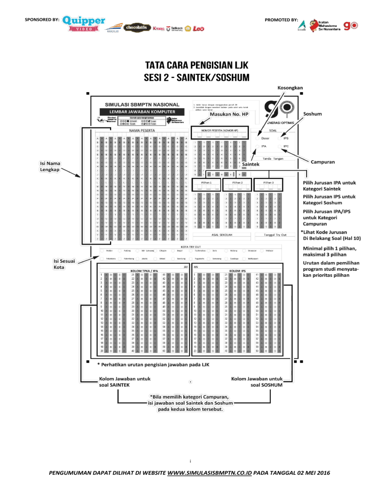 SPONSORED BY: PROMOTED BY: i PENGUMUMAN DAPAT DILIHAT DI WEBSITE WWW.SIMULASISBMPTN.CO.ID PADA TANGGAL 02 MEI 2016 SPONSORED BY: PROMOTED BY: Tips Trik Belajar Menghadapi Tes SBMPTN Mengenai bagaimana cara belajar yang baik dan benar, tiap orang memiliki gayanya masing- masing. Namun, berikut ini tip trik pokok yang perlu diperhatikan dalam belajar menghadapi tes SBMPTN. Belajar dari kata kunci yang sudah Anda rangkum sebelumnya. Belajar dalam keadaan santai dan mood yang bagus. Cobalah belajar di alam terbuka dan tidak lupa camilan serta air putih. Jangan memaksakan diri untuk belajar dengan keras, apalagi ketika Anda sudah letih, capek, dan banyak masalah. Ingat, daya tampung otak manusia ada batasnya, apabila terlalu banyak yang dipikirkan akan buruk akibatnya. Tips Trik Menjelang Tes SBMPTN Seminggu sebelum tes SBMPTN: Anda harus dapat memperkirakan jumlah soal minimal yang wajib dijawab dengan benar pada tiap pelajaran dengan memperhatikan passing grade. Pastikan kesehatan Anda sudah terjamin, dan kalau perlu periksa terlebih dahulu ke dokter. Dan bagi Anda yang memiliki penyakit kambuhan, pastikan Anda sudah menyiapkan obatnya dengan cukup. Selesaikan semua masalah Anda kalau mudah diselesaikan. Jika rumit Iepaskanlah untuk sementara agar tidak mengganggu konsentrasi belajar Anda. Permasalahan yang muncul umumnya adalah masalah keluarga, pacar, atau juga masalah hutang. Mintalah restu dan doa dari orangtua, keluarga, guru, dan teman-teman Anda. Detik-detik menjelang tes SBMPTN: Satu hari sebelumnya, Anda harus tahu tempat duduk Anda waktu mengerjakan ujian. Pastikan malamnya, Anda sudah beristirahat dengan cukup. Berapa jamkah tidur yang dapat dikatakan cukup? Pada umumnya, orang Indonesia membutuhkan tidur 6-8 jam sehari. Anda juga harus sudah menyiapkan peralatan dan perlengkapan yang dibutuhkan saat tes SBMPTN. Bangunlah 4 jam sebelum ujian, 3 jam gunakanlah dengan belajar santai diselingi dengan hiburan. Jangan gunakan 3 jam tersebut untuk belajar tanpa henti karena dapat menyebabkan timbulnya tekanan tertentu. Satu jam setelahnya gunakan untuk mandi dan berangkat ke tempat di mana Anda mengikuti ujian. Jangan lupa bawa arloji atau jam tangan. Tips Trik Waktu Mengerjakan Soal SBMPTN Perhatikan instruksi dan para pengawas dengan baik. Umumnya tidak boleh membuat gaduh dan diminta cek lembar jawaban yang disediakan. Kerjakan soal dengan serius tapi santai. Anggap saja Anda sedang mengerjakan soal latihan, seakan-akan tanpa beban. Tidak usah memperhatikan atau melihat peserta lainnya dan pengawas. Anggap saja Anda berada di ruang kosong yang sepi dan santai, agar konsentrasi Anda tidak terpecah belah. Kerjakan dulu soal-soal yang mudah. Untuk soal-soal yang ragu-ragu menjawabnya, beri tanda dulu. Kalau soal-soal yang mudah sudah selesai, barulah dilanjutkan dengan soal-soal yang sudah Anda tandai. Setelah itu, kerjakan soal-soal yang rumit, tapi ingat jangan dipaksakan menjawab karena berpotensi mengurangi nilai. Setelah semua beres, cek kembali instruksi ujian sudah dikerjakan semua atau belum. Setelah ujian selesai, istirahatlah sebentar untuk menenangkan diri, baru setelah itu mencari kesenangan atau refreshing yang tdak berlebihan. Kalau sudah benar-benar fresh, belajar lagi untuk ujian di hari benkutnya. Strategi dan Kiat-kita Ampuh Lulus Tes SBMPTN Kalau usaha saja tanpa diimbangi dengan doa, sama seperti berjalan tanpa tujuan. Oleh karena itu, rajin-rajinlah beribadah dan berdoa. Selalu optimis, jangan ragu apalagi pesimis jika tidak lulus ujian SBMPTN. Ingat, ucapan odalah doa. Misal, kalau Anda berkata, Ah mungkin Aku tidak akan lulus, itu sama saja dengan Anda berdoa berharap tidak lolos SBMPTN. Jangan pernah mengandaikan apalagi percaya pada keberuntungan. Kalau Anda mempercayainya, sama saja Anda telah kalah sebelum perang. Biasakan santai dan jangan memaksa ii PENGUMUMAN DAPAT DILIHAT DI WEBSITE WWW.SIMULASISBMPTN.CO.ID PADA TANGGAL 02 MEI 2016 SPONSORED BY: PROMOTED BY: Petunjuk Umum 1. Telitilah terlebih dahulu nomer dan dan halaman 6. serta kelengkapan soal yang lainnya sebelum sesuai petujuk yang diberikan petugas memulai mengerjakan 2. 3. 7. keperluan coret mencoret harap menggunakan lebar pada halaman soal yang selengkap-lengkapnya kosong, JANGAN SEKALI KALI MENCORAT CORET Bacalah dengan cermat Soal yang Petunjuk menjelaskan Khusus LEMBAR JAWABAN cara 8. Selama Try Out berlangsung saudara TIDAK penjawaban soal DIPERKENANKAN untuk bertanya atau meminta Bobot nilai soal adalah : 4 untuk jawaban benar , 0 penjelasan mengenai soal kepada SIAPAPUN untuk tidak dijawab, dan -1 untuk jawaban salah, 5. Untuk Tulislah Data diri saudara dengan jujur dan Penjawaban 4. Isilah bulatan pada lembar jawaban yang tersedia 9. Setelah ujian selesai harap tidak langsung maka pikirkanlah baik-baik sebelum menjawab soal meninggalkan tempat duduk saudara sebelum Jawablah terlebih petugas mempersilahkana dahulu soal yang menurut saudara mudah , kemudian dilanjutkan dengan soal 10. Perhatikan agar lembar jawaban TIDAK KOTOR, yang lebih sukar TERLIPAT, BASAH, dan SOBEK. Petunjuk Khusus Contoh model soal A : 1. Untuk menjawab soal Model A, pilih satu jawaban yang (…Pertanyaan Soal..) paling tepat A. …….. A. Jika A yang betul B. …….. B. Jika B yang betul C. …….. C. Jika C yang betul D. …….. D. D yang betul E. ……… E. Jika E yang betul Contoh model soal B : 2. Untuk menjawan soal Model B, pilih jawaban (…Pernyataan 1…) A. Sebab Jika pernyataan 1 dan 2 betul, dan juga saling berkaitan (..Pernyataan 2 …) B. Jika pernyataan 1 dan 2 betul namun tidak berkaitan C. Jika pernyataan 1 betul dan 2 salah Contoh model soal C : 3. D. Jika pernyataan 1 salah namun 2 benar (Pertanyaan 1 ) E. Jika kedua pernnyataan salah (1) …………… (2) ………….. Untuk menjawab soal Model C , pilihlah jawaban (3) ………….. (4) ………….. A. Jika 1,2,3 benar D. Jika hanya 4 yang benar B. Jika 1 dan 3 benar E. Jika semua benar C. Jika 2 dan 4 bena iii PENGUMUMAN DAPAT DILIHA