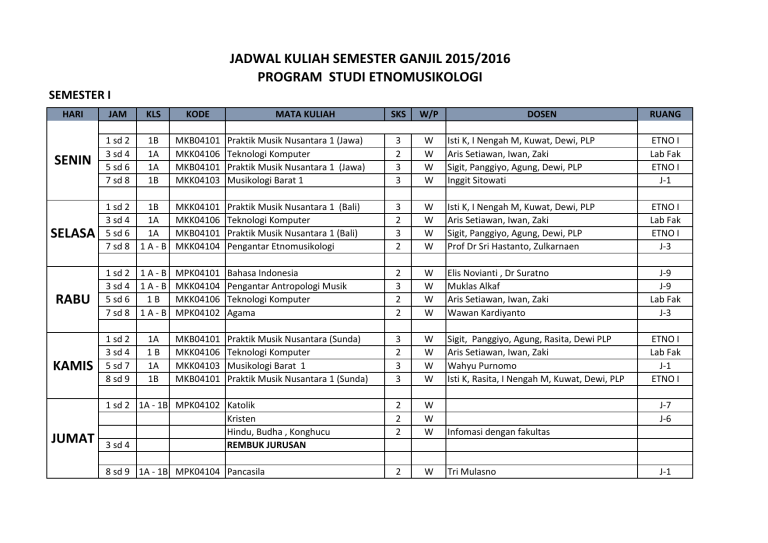 JADWAL KULIAH SEMESTER GANJIL 2015/2016 PROGRAM STUDI ETNOMUSIKOLOGI SEMESTER I HARI JAM KLS KODE SENIN 1 sd 2 3 sd 4 5 sd 6 7 sd 8 1B 1A 1A 1B MKB04101 MKK04106 MKB04101 MKK04103 1 sd 2 3 sd 4 5 sd 6 7 sd 8 1B 1A 1A 1 A ‐ B 1 sd 2 3 sd 4 5 sd 6 7 sd 8 1 sd 2 3 sd 4 5 sd 7 8 sd 9 SELASA RABU KAMIS JUMAT MATA KULIAH SKS W/P DOSEN RUANG Praktik Musik Nusantara 1 (Jawa) Teknologi Komputer Praktik Musik Nusantara 1 (Jawa) Musikologi Barat 1 3 2 3 3 W W W W Isti K, I Nengah M, Kuwat, Dewi, PLP Aris Setiawan, Iwan, Zaki Sigit, Panggiyo, Agung, Dewi, PLP Inggit Sitowati ETNO I Lab Fak ETNO I J‐1 MKK04101 MKK04106 MKB04101 MKK04104 Praktik Musik Nusantara 1 (Bali) Teknologi Komputer Praktik Musik Nusantara 1 (Bali) Pengantar Etnomusikologi 3 2 3 2 W W W W Isti K, I Nengah M, Kuwat, Dewi, PLP Aris Setiawan, Iwan, Zaki Sigit, Panggiyo, Agung, Dewi, PLP Prof Dr Sri Hastanto, Zulkarnaen ETNO I Lab Fak ETNO I J‐3 1 A ‐ B 1 A ‐ B 1 B 1 A ‐ B MPK04101 MKK04104 MKK04106 MPK04102 Bahasa Indonesia Pengantar Antropologi Musik Teknologi Komputer Agama 2 3 2 2 W W W W Elis Novianti , Dr Suratno Muklas Alkaf Aris Setiawan, Iwan, Zaki Wawan Kardiyanto J‐9 J‐9 Lab Fak J‐3 1A 1 B 1A 1B MKB04101 MKK04106 MKK04103 MKB04101 Praktik Musik Nusantara (Sunda) Teknologi Komputer Musikologi Barat 1 Praktik Musik Nusantara 1 (Sunda) 3 2 3 3 W W W W Sigit, Panggiyo, Agung, Rasita, Dewi PLP Aris Setiawan, Iwan, Zaki Wahyu Purnomo Isti K, Rasita, I Nengah M, Kuwat, Dewi, PLP ETNO I Lab Fak J‐1 ETNO I 1 sd 2 1A ‐ 1B MPK04102 Katolik Kristen Hindu, Budha , Konghucu 3 sd 4 REMBUK JURUSAN 2 2 2 W W W Infomasi dengan fakultas 8 sd 9 1A ‐ 1B MPK04104 Pancasila 2 W Tri Mulasno J‐7 J‐6 J‐1 SEMESTER III HARI JAM 4 sd 6 SENIN SELASA RABU KAMIS JUMAT KLS KODE MATA KULIAH SKS W/P 3 W Fawarti, Bondan, Iwan MKB04301 Praktik Musik Nus III (Jawa) MKB04301 Praktik Musik Nus III (Jawa) 3 3 W W Sigit Astono, Panggiyo, Agung, Dewi, PLP Isti K, I Nengah M, Kuwat, Dewi, PLP MKK04111 MKK04116 MKK04116 MKK04108 3 3 3 3 W W W W Aton RM, Budi Setiyono Wahyu Purnomo Inggit Sitowati Fawarti, Bondan, Iwan J‐1 J‐4 J‐1 J‐4 III A‐B MKK04108 Tehnologi Audio Visual DOSEN RUANG J‐2 7 sd 8 9 sd 10 III A III B 1 sd 3 4 sd 5 4 sd 5 6 sd 8 III A‐B III A III B III A‐B 1 sd 3 III A‐B MKK04113 Budaya Musik 1 3 W Aton R, Nengah M, Budi Setiyono,Teti Darlenis J‐3 5 sd 6 III A‐B MKK04117 Etnografi 3 W Bondan AM J‐3 3 3 W W Sigit, Panggiyo, Agung, Dewi, PLP Isti K, I Nengah M, Kuwat, Dewi, PLP ETNO I ETNO I 1 sd 2 III A MKB04301 Praktik Musik Nusantara III (Sunda) 3 sd 5 III A‐B MKK04102 Karawitanologi 7 sd 8 III A‐B MKK04116 Notasi dan Transkripsi Musik I (Jawa) 9 sd 10 III B MKB04301 Praktik Musik Nusantara III (Sunda) 3 3 3 3 W W W W Rasita, Kuwat, Dewi, PLP Prof. Dr. Sri Hastanto, Kuwat Rusdiantoro, Bambang Sosodoro Rasita, Kuwat, Dewi, PLP ETNO 1 J‐6 ETNO 2 ETNO I 1 sd 2 3 P Inggit Sitowati Etno 2 Sigit Astono Rusdiantoro, Bambang Sosodoro Etno 2 Etno 2 Etno1 7 sd 8 9 sd 10 III A III B Metode Penelitian I Notasi dan Transkripsi Musik I Notasi dan Transkripsi Musik I Tehnologi Audio Visual MKB04301 Praktik Musik Nusantara III (Bali) MKB04301 Praktik Musik Nusantara III (Bali) III A‐B MKP04102 Sosiologi Musik 4 sd 6 REMBUG JURUSAN 7 sd 8 III A‐B MKP04103 Bimbingan Penulisan 9 sd 10 III A‐B MKK04116 Notasi dan Transkripsi Musik I (Jawa) 3 3 P W ETNO I ETNO I SEMESTER V HARI JAM 1 sd 2 4 sd 6 KLS KODE MATA KULIAH V A ‐ B MKP04101 Editing V A ‐ B MKB04104 Analisis Musik SKS 2 3 W/P DOSEN P Bondan AM, Iwan W Dr. Bambang Sunarto, Wahyu P RUANG LAB. KOMP J‐1 SENIN SELASA RABU KAMIS JUMAT 7 sd 9 10 sd 11 1 sd 3 5 sd 6 V A ‐ B V A ‐ B V A ‐ B V A ‐ B MKK04119 MKP04104 MKK04313 MKB04102 Sejarah Musik Nusantara Musik dan pendidikan Masyarakat Budaya Musik III Praktik Intrumen Tunggal 3 3 3 3 W P W W Prof. Dr. Rustopo Inggit Sitowati Prof. Santosa, Aris S, Larso Wisnu, Junaedi, Inggit, Kuwat, Nengah, Rasita, Sigit, Panggiyo, Teti, Ilham J‐5 Etno II ETNO II Etno I 1 sd 3 V A ‐ B MKK02315 Studi Lapangan I 3 W 5 sd 6 V A ‐ B MKB04103 Praktik Intrumen Tunggal 3 W 7 sd 8 V A ‐ B MKP04101 Editing 2 P Zulkarnaen, Bondan, Fawarti, Aris J‐4 Wisnu, Junaedi, Inggit, Kuwat, Nengah, Rasita, Etno II‐I Sigit, Panggiyo, Teti, Ilham Bondan AM, Iwan LAB. KOMP 1 sd 3 4 sd 6 V A ‐ B MKK04103 Studi Lapangan I V A ‐ B MKK04120 Kapita Selekta Etnomusikologi 3 3 W W Zulkarnaen, Bondan, Fawarti, Aris Prof. Santosa, Aton RM J‐6 ETNO I 1 sd 2 3 sd 4 V A‐B 3 W Wisnu, Junaedi, Inggit, Kuwat, Nengah, Rasita, Sigit, Panggiyo, Ilham Etno II‐I MKB04101 Praktik Intrumen Tunggal REMBUK JURUSAN SEMESTER VII HARI JAM 1 sd 3 4 sd 6 KLS VII VII KODE MATA KULIAH MKB04105 Kritik Musik MKB04106 Seminar Etnomusikologi SKS 3 3 1 sd 3 4 sd 6 VII VII MPB04104 Kewirausahaan dan HAKI MKB04107 Kerja Feature 3 3 W W Fawarti GNU Dr. Aton Rustandi, Bondan, Popy 1 sd 3 VII MKB04105 Kritik Musik 3 W Aris Setiawan, Djoko Suranto J‐2 KAMIS 1 sd 3 7 sd 9 VII VII MKB04106 Seminar Etnomusikologi MPB00103 Wawasan Budaya Nusantara 3 3 W W Prof. Santosa, I Nengah M Dr Aton Rustandi, Joko Suranto J‐1 J‐7 JUMAT 3 sd 4 7 sd 9 VII REMBUK JURUSAN MKB04107 Kerja Feature 3 W Dr. Aton Rustandi, Bondan, Popy J‐5 SENIN SELASA W/P DOSEN W Aris Setiawan, Djoko Suranto W Prof. Santosa, I Nengah M RUANG J‐1 J‐6 Etno I ETNO II RABU Surakarta, 22 Juli 2015 Pembantu Dekan I FSP Djoko Purwanto, S.Kar., MA NIP. 195708061980121002 3,88 4 3,85 11,73 3,91