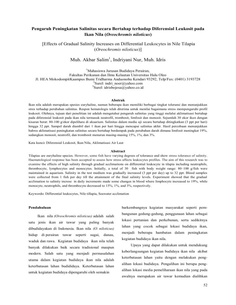 Pengaruh Peningkatan Salinitas secara Bertahap terhadap Diferensial Leukosit pada Ikan Nila (Oreochromis niloticus) [Effects of Gradual Salinity Increases on Differential Leukocytes in Nile Tilapia (Oreochromis niloticus)] Muh. Akbar Salim1, Indriyani Nur, Muh. Idris 1 Mahasiswa Jurusan Budidaya Perairan, Fakultas Perikanan dan Ilmu Kelautan Universitas Halu Oleo Jl. HEA MokodompitKaampus Bumi Tridharma Anduonohu Kendari 93292, Telp/Fax: (0401) 3193728 2 Surel: indri_noer@yahoo.com 3 Surel: idrisbojosa@yahoo.co.id Abstrak Ikan nila adalah merupakan spesies euryhaline, namun beberapa ikan memiliki berbagai tingkat toleransi dan menunjukkan stres terhadap perubahan salinitas. Respon hematologis telah diterima untuk menilai bagaimana stress mempengaruhi profil leukosit. Olehnya, tujuan dari penelitian ini adalah mengetahui pengaruh salinitas yang tinggi melalui aklimatisasi bertahap pada diferensial leukosit pada ikan nila termasuk neutrofil, trombosit, limfosit dan monosit. Sejumlah 30 ekor ikan dengan kisaran berat: 80-100 g/ekor dipelihara di akuarium. Salinitas dalam media uji secara bertahap ditingkatkan (3 ppt per hari) hingga 32 ppt. Sampel darah diambil dari 1 ikan per hari hingga mencapai salinitas akhir. Hasil percobaan menunjukkan bahwa aklimatisasi peningkatan salinitas secara bertahap berdampak pada perubahan darah dimana limfosit meningkat 19%, sedangkan monosit, neutrofil, dan trombosit menurun masing-masing 15%, 1%, dan 3%. Kata kunci: Diferensial Leukosit, Ikan Nila, Aklimatisasi Air Laut Abstract Tilapias are euryhaline species. However, some fish have varying degrees of tolerance and show stress tolerance of salinity. Haematological response has been accepted to assess how stress affects leukocytes profiles. The aim of this research was to examine the effects of high salinity through gradual acclimations on differential leukocyte in tilapia including neutrophils, thrombocyte, lymphocytes and monocytes. Initially, a total of 30 fish with body weight range: 80–100 g/fish were maintained in aquarium. Salinity in the test medium was gradually increased (3 ppt per day) up to 32 ppt. Blood samples were collected from 1 fish per day till the attainment of the final salinity levels. Experiment showed that the gradual acclimation to salinity increse in daily increments made some changes in blood where limphocyte increased to 19%, while monocyte, neutrophils, and thrombocyte decreased to 15%, 1%, and 3%, respectively. Keywords: Differential leukocytes, Nile tillapia, Seawater acclimation barkembangnya kegiatan masyarakat seperti pem- Pendahuluan Ikan nila (Oreochromis niloticus) adalah salah satu jenis ikan air tawar yang paling banyak dibudidayakan di Indonesia. Ikan nila (O. niloticus) hidup di perairan tawar seperti sugai, danau, waduk dan rawa. Kegiatan budidaya ikan nila telah banyak dilakukan baik secara tradisional maupun modern. Salah satu yang menjadi permasalahan utama dalam kegiatan budidaya ikan nila adalah keterbatasan lahan budididaya. Keterbatasan lahan untuk kegiatan budidaya dipengaruhi oleh semakin bangunan gedung-gedung, penggunaan lahan sebagai lokasi pertanian dan perkebunan, serta sedikitnya lahan yang cocok sebagai lokasi budidaya ikan, menjadi beberapa hambatan dalam peningkatan kegiatan budidaya ikan nila. Upaya yang dapat dilakukan untuk mendukung keberlangsungan kegiatan budidaya ikan nila akibat keterbatasan lahan yaitu dengan melakukan pengalihan lokasi budidaya. Pengalihan ini berupa pengalihan lokasi media pemeliharaan ikan nila yang pada awalnya merupakan air tawar kemudian dialihkan 52 menjadi air laut. Faktor lain yang mendukung upaya diangkut dengan menggunakan jerigen. Syarat air pengalihan lokasi budidaya ikan nila dari air tawar ke laut yang digunakan merupakan air laut yang diambil air laut adalah kemampuan ikan nila dapat men- dari pantai yang memenuhi kriteria penggunaan toleransi perubahan lingkungan media hidup terutama yakni bersih dan bebas dari pencemaran. salinitas air yang tinggi. Proses adaptasi suatu organisme terhadap perubahan lingkungan seperti ikan nila Seleksi Hewan Uji yang Hewan uji yang digunakan adalah ikan nila (O. beradaptasi terhadap perubahan salinitas akan menye- niloticus) yang diperoleh dari Laboratorium Produksi babkan ikan mengalami stres sebagai respon dari Fakultas Perikanan dan Ilmu Kelautan, Universitas proses adaptasinya. Karakteristik darah dapat di- Halu Oleo. Jumlah ikan nila yang digunakan dalam gunakan untuk mengevaluasi respon fisiologi pada penelitian ini adalah 30 ekor ikan bobot rata-rata 80- ikan (Royan et al., 2014). Differensial leukosit 100 g/ekor. Pada penelitian ini tidak dilakukan merupakan salah satu metode yang dapat digunakan pemisahan terhadap ikan nila jantan dan betina. dalam mengukur tingkat stres pada ikan akibat Sebelum memasuki proses aklimatisasi, ikan nila perubahan lingkungan. Differensial leukosit mengacu terlebih dahulu dipelihara tanpa perlakuan aklima- pada perbandingan jumLah sel limfosit, neutrofil, sel tisasi selama 5-7 hari. Hal ini dilakukan dengan granulosit, dan lain-lain, dimana apabila jumLah sel tujuan agar ikan nila dapat menyesuaikan diri dengan limfosit pada leukosit ikan meningkat, maka sel lingkungan barunya. neutrofil akan cenderung menurun. Sebaliknya, bila sel limfosit menurun maka jumLah sel neutrofil akan meningkat (Modra et al., 1998). Proses Aklimatisasi Air Laut Proses aklimatisasi ikan nila ke air laut dilakukan secara perlahan dan bertahap, dimana Metode Penelitian media pemeliharaan akan ditingkatkan salinitasnya Penelitian ini dilaksanakan pada bulan Juni-Juli sebanyak 3 ppt/hari. Penambahkan air laut kedalam 2016 dan bertempat di Laboratorium Fakultas Peri- media pemeliharaan menggunakan wadah bervolume kanan dan Ilmu Kelautan, Universitas Halu Oleo, 1 L. Penambahan air laut dilakukan secara bertahap Kendari. Tujuan dari penelitian ini adalah untuk hingga mencapai 32 ppt. Salinitas media pemeliha- mengetahui pengaruh aklimatisasi air laut terhadap 