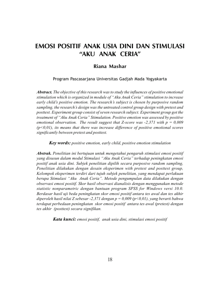 EMOSI POSITIF ANAK USIA DINI DAN STIMULASI “AKU ANAK CERIA” Riana Mashar Program Pascasarjana Universitas Gadjah Mada Yogyakarta Abstract. The objective of this research was to study the influences of positive emotional stimulation which is organized in module of “Aku Anak Ceria” stimulation to increase early child’s positive emotion. The research’s subject is chosen by purposive random sampling, the research’s design was the untreated control group design with pretest and posttest. Experiment group consist of seven research subject. Experiment group got the treatment of “Aku Anak Ceria” Stimulation. Positive emotion was assessed by positive emotional observation. The result suggest that Z-score was -2,371 with p = 0,009 (p<0,01), its means that there was increase difference of positive emotional scores significantly between pretest and posttest. Key words: positive emotion, early child, positive emotion stimulation Abstrak. Penelitian ini bertujuan untuk mengetahui pengaruh stimulasi emosi positif yang disusun dalam modul Stimulasi “Aku Anak Ceria” terhadap peningkatan emosi positif anak usia dini. Subjek penelitian dipilih secara purposive random sampling, Penelitian dilakukan dengan desain eksperimen with pretest and posttest group, Kelompok eksperimen terdiri dari tujuh subjek penelitian, yang mendapat perlakuan berupa Stimulasi “Aku Anak Ceria”. Metode pengumpulan data dilakukan dengan observasi emosi positif. Skor hasil observasi dianalisis dengan menggunakan metode statistic nonparametric dengan bantuan program SPSS for Windows versi 10.0. Berdasar hasil uji beda peningkatan skor emosi positif antara tes awal dan tes akhir diperoleh hasil nilai Z sebesar -2,371 dengan p = 0,009 (p<0,01), yang berarti bahwa terdapat perbedaan peningkatan skor emosi positif antara tes awal (pretest) dengan tes akhir (posttest) secara signifikan. Kata kunci: emosi positif, anak usia dini, stimulasi emosi positif 18 Emosi Positif Anak Usia Dini Dan Stimulasi “ Aku Anak Ceria” Riana Mashar Penelitian ini memfokuskan pengamatan pada ranah emosi karena banyaknya permasalahan dalam ranah tersebut. Emosi dapat diartikan sebagai aktivitas badaniah secara eksternal, baik berupa reaksi menyenangkan maupun tidak menyenangkan terhadap peristiwa atau suatu kondisi mental tertentu. Reaksi menyenangkan terkait dengan emosi positif sedangkan reaksi yang tidak menyenangkan terkait dengan emosi negatif (Lewis dan Haviland-Jones, 2000). Beberapa penelitian mengenai masalah emosi anak usia dini dapat diamati dari hasil survei yang dilakukan Izzaty (2005) di Taman Kanak-kanak di Yogyakarta. Hasil tersebut menunjukkan adanya permasalahan umum yang sering ditemui yaitu agresivitas, kecemasan, temper tantrum, sulit konsentrasi, gagap atau kesulitan berkomunikasi, menarik diri, enuresis dan encopresis, berbohong, menangis berlebihan, tergantung, pemalu, dan takut berlebihan. Hasil survei tersebut dipertegas dengan hasil penelitian mengenai masalah-masalah perilaku pada anak usia TK di mana masalah yang paling banyak muncul terdapat pada area conduct/restless yang salah satunya adalah perilaku agresif, kemudian disusul dengan permasalahan pada area emotional/miserable, dan terakhir permasalahan yang 19 termasuk area isolated/immature (Izzaty, 2006). Anak dengan karakteristik khusus tersebut dapat menimbulkan kesulitan tersendiri dalam proses pembelajaran. Foot, Woolfson, Terras, dan Norfolk (2004) mencantumkan bahwa kesulitan sosial, emosi, dan perilaku akan menghambat anak untuk berpartisipasi secara penuh dalam kurikulum prasekolah dan kesempatan memperoleh pendidikan, serta dalam memaksimalkan kemampuan mereka. Menurut Ashiabi (2000) dan Lawhan dan Lawhon (2000), prediktor timbulnya permasalahan perkembangan anak prasekolah yang diindikasikan dengan adanya perilaku yang tidak adaptif, dapat diamati dari kurangnya kemampuan pendidik TK dalam menstimulasi perkembangan emosi dan sosial anak. Shonkoff, dkk (2006) juga menyatakan bahwa keterbatasan guru dan pengasuh untuk mengevaluasi dan menangani anak-anak yang mengalami masalah emosi dan perilaku dalam program pendidikan dan tempat-tempat pengasuhan anak usia dini, menimbulkan kesenjangan antara apa yang diketahui mengenai perkembangan emosional yang sehat dan manajemen kesulitan perilaku, dengan apa yang dilakukan dalam kebijakan publik dan program-program kegiatan bagi anak. Hasil penelitian Izzaty (2006) meunjukkan bahwa 20 terdapat hubungan yang signifikan dan memberi sumbangan sebesar 21.45% kemampuan pendidik dalam menstimulasi perkembangan emosi dan sosial anak terhadap permasalahan perilaku anak usia TK. Uraian mengenai permasalahan emosi anak usia dini di atas, sesuai dengan hasil FGD (Focus Group Discussion) dan survei awal yang peneliti lakukan. Focus Group Discussion terhadap anggota HIMPAUDI (Himpunan Pendidik dan Tenaga Kependidikan Anak Usia Dini) Kabupaten Magelang pada tanggal 29 April 2006, menunjukkan bahwa permasalahan yang paling sering ditemui para pendidik anak usia dini adalah kesulitan dalam menangani anak terutama terkait dengan masalah emosi, misalnya anak ngambek, rewel, mengamuk, mudah marah, malas, ketakutan berpisah dengan orang tua, sehingga mempengaruhi aktivitas belajar anak di mana anak tidak mau mengikuti berbagai kegiatan yang ditawarkan guru. Berdasar hasil survei peneliti pada tanggal 2 Mei 2006 terhadap guru-guru TK di Kabupaten Magelang dan Purworejo; 80% permasalahan siswa yang ditemui guru adalah masalah emosi dan 51% guru menyatakan mengalami kesulitan dalam memperoleh pedoman penyusunan kegiatan yang terkait dengan aspek emosi; dan di antara ranah Indigenous, Jurnal Ilmiah Berkala Psikologi Vol. 9, No. 1, Mei 2007: 18-29 daya pikir, daya cipta, bahasa, emosi, sosial, fisik, dan motorik, 28% responden menganggap ranah emosi sulit untuk distimulasi. Beberapa kondisi tersebut tentu saja mengakibatkan stimulasi emosi tidak dapat diberikan secara optimal, sehingga sangat mungkin tidak sesuai dengan prinsi