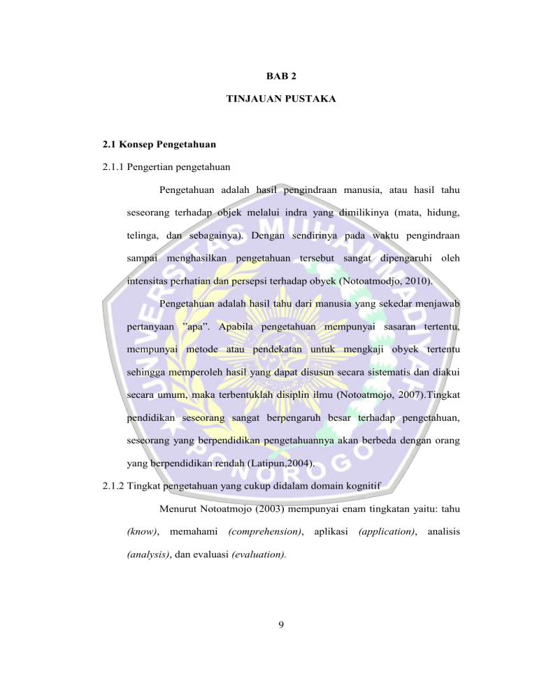 BAB 2 TINJAUAN PUSTAKA 2.1 Konsep Pengetahuan 2.1.1 Pengertian pengetahuan Pengetahuan adalah hasil pengindraan manusia, atau hasil tahu seseorang terhadap objek melalui indra yang dimilikinya (mata, hidung, telinga, dan sebagainya). Dengan sendirinya pada waktu pengindraan sampai menghasilkan pengetahuan tersebut sangat dipengaruhi oleh intensitas perhatian dan persepsi terhadap obyek (Notoatmodjo, 2010). Pengetahuan adalah hasil tahu dari manusia yang sekedar menjawab pertanyaan ”apa”. Apabila pengetahuan mempunyai sasaran tertentu, mempunyai metode atau pendekatan untuk mengkaji obyek tertentu sehingga memperoleh hasil yang dapat disusun secara sistematis dan diakui secara umum, maka terbentuklah disiplin ilmu (Notoatmojo, 2007).Tingkat pendidikan seseorang sangat berpengaruh besar terhadap pengetahuan, seseorang yang berpendidikan pengetahuannya akan berbeda dengan orang yang berpendidikan rendah (Latipun,2004). 2.1.2 Tingkat pengetahuan yang cukup didalam domain kognitif Menurut Notoatmojo (2003) mempunyai enam tingkatan yaitu: tahu (know), memahami (comprehension), aplikasi (application), analisis (analysis), dan evaluasi (evaluation). 9 10 1. Tahu ( know) Tahu diartikan sebagai pengingat sesuatu materi yang telah dipelajari sebelumnya, termasuk dalam pengetahuan tindakan tingkat ini adalah mengingat kembali (recall) terhadap suatu yang spesifik dari seluruh bahan yang dipelajari. 2. Memahami (comprehension) Memahami diartikan suatu kemampuan menjelaskan secara benar tentang obyek yang diketahui dan dapat menginterprestasikan materi tersebut secara benar. 3. Aplikasi (application) Aplikasi diartikan sebagai kemampuan untuk menggunakan materi yang telah dipelajari pada situasi atau kondisi sebenarnya. 4. Analisis (analysis) Analisis adalah suatu kemampuan untuk menjabarkan materi atau suatu obyek kedalam komponen-komponen, tetapi dalam struktur organisasi tersebut dan masih ada kaitannya satu sama lain. 5. Sintesis (synthesis) Sintesis merujuk pada suatu kemampuan untuk meletakan atau menghubungkan bagian-bagian didalam suatu bentuk keseluruhan yang baru. Dengan kata lain sintesis itu suatu kemampuan untuk menyusun informasi baru dari formulasi-formulasi lama. 11 6. Evaluasi (evaluation) Evaluasi itu berkaitan dengan kemampuan untuk melakukan penilaian terhadap suatu materi atau obyek. Penilaian-penilaian itu berdasarkan suatu kriteria-kriteria yang telah ada. 2.1.3 Faktor yang mempengaruhi pengetahuan Menurut Widianti (2007), faktor-faktor yang mempengaruhi pengetahuan antara lain: 1.Tingkat Pendidikan Pendidikan dapat membawa wawasan atau pengetahuan seseorang secara umum, seseorang yang berpendidikan lebih tinggi akan mempunyai pengetahuan yang lebih luas dibanding dengan seseorang yang tingkat pendidikannya rendah. 2.Pengalaman Pengalaman dapat diperoleh dari pengalamannya sendiri maupun orang lain. Pengalaman yang sudah diperoleh dapat memperluas pengetahuan seseorang. 3.Fasilitas Fasilitas sebagai sumber informasi yang dapat mempengaruhi pengetahuan seseorang misalnya radio, televisi, majalah, koran dan buku. 4.Penghasilan Penghasilan tidak berpengaruh langsung terhadap pengetahuan seseorang. Namun bila seseorang berpenghasilan cukup besar maka ia akan mampu untuk menyediakan atau membeli fasilitas sumber informasi. 12 5.Sosial budaya Kebudayaan setempat dan kebiasaan dalam keluarga dapat mempengaruhi persepsi dan sikap seseorang terhadap sesuatu. 6. Keyakinan Biasanya diperoleh secara turun temurun dan tanpa adanya pembuktian terlebih dahulu. Keyakinan ini bisa mempengaruhi pengetahuan seseorang, baik keyakinan itu sifatnya positif maupun negatif. 2.2 Konsep Ibu 2.2.1 Pengertian Ibu Ibu adalah posisi sebagai istri, pemimpin, dan pemberi asuhan kesehatan. Ibu adalah sebutan untuk seorang perempuan yang telah menikah dan melahirkan, sebutan wanita yang telah bersuami (Effendi, 2004). 2.2.2 Peran Dan Fungsi Ibu Ibu sebagai istri, ibu dari anak-anaknya. Ibu mempunyai peranan dalam mengurus rumah tangga, pengasuh dan pendidik anak-anaknya, pelindung dan sebagai salah satu kelompok dalam peranan sosialnya, serta sebagai anggota masyarakat dari lingkungannya. Disamping itu ibu berperan sebagai pencari nafkah tambahan dalam keluarganya. Seorang ibu bersama keluarga mempunyai peran dan fungsifungsinya sebagai berikut: 1. Fungsi fisiologis: berperan dalam reproduksi, pengasuh anak, pemberian makanan, pemelihara kesehatan dan rekreasi. 13 2. Fungsi ekonomi: menyediakan cukup untuk mendukung fungsi lainya, menentukan alokasi sumber dana, menjamin keamanan vital keluarga. 3. Fungsi pendidik: mengajarkan ketrampilan, tingkah laku, dan pengetahuan berdasarkan fungsi lainnya. 4. Fungsi psikologis: memberikan lingkungan yang mendukung fungsi alamiah setiap individu, menawarkan perlindungan psikologis yang optimal dan mendukung untuk membentuk hubungan dengan orang lain. 5. Fungsi sosial budaya dengan meneruskan nilai-nilai budaya, sosialisasi, dan pembentukan norma-norma, tingkah laku pada tiap tahap perkembangan anak serta kehidupan keluarga (Puspitasari, 2013). 2.3 Konsep Dasar Gizi Seimbang Pada Balita 2.3.1 Pengertian Seimbang Pada Gizi Gizi Seimbang Susunan pangan sehari-hari yang mengandung zat gizi dalam jenis dan jumlah yang sesuai dengan kebutuhan tubuh, dengan memperhatikan prinsip keanekaragaman pangan, aktivitas fisik, perilaku hidup bersih dan mempertahankan berat badan normal untuk mencegah masalah gizi (Kemenkes RI, 2014). Masa balita adalah periode perkembangan fisik dan mental yang pesat. Ada usia balita juga membutuhkan gizi seimbang yaitu makanan yang mengandung zat-zat gizi yang dibutuhkan oleh tubuh sesuai umur. Makanan seimbang pada usia ini perlu diterapkan karena akan mempengaruhi kualitas pada usia dewasa sampai lanjut (Laksamana, 2005). 14 Gizi Seimbang yang biasanya digambarkan dengan bentuk Piramida Makanan adalah susunan makanan sehari-hari yang mengandung zat gizi dalam jenis dan jumlah yang sesuai dengan kebutuhan tubuh, dengan memperhatikan prinsip keanekar