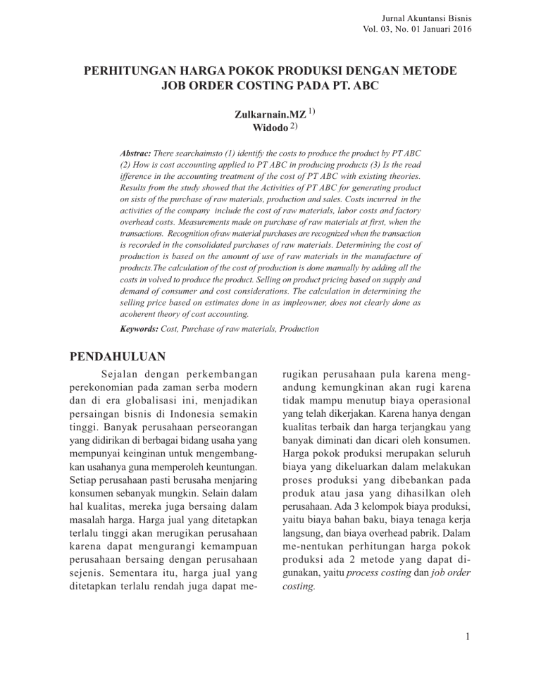 Jurnal Akuntansi Bisnis Vol. 03, No. 01 Januari 2016 PERHITUNGAN HARGA POKOK PRODUKSI DENGAN METODE JOB ORDER COSTING PADA PT. ABC Zulkarnain.MZ 1) Widodo 2) Abstrac: There searchaimsto (1) identify the costs to produce the product by PT ABC (2) How is cost accounting applied to PT ABC in producing products (3) Is the read ifference in the accounting treatment of the cost of PT ABC with existing theories. Results from the study showed that the Activities of PT ABC for generating product on sists of the purchase of raw materials, production and sales. Costs incurred in the activities of the company include the cost of raw materials, labor costs and factory overhead costs. Measurements made on purchase of raw materials at first, when the transactions. Recognition ofraw material purchases are recognized when the transaction is recorded in the consolidated purchases of raw materials. Determining the cost of production is based on the amount of use of raw materials in the manufacture of products.The calculation of the cost of production is done manually by adding all the costs in volved to produce the product. Selling on product pricing based on supply and demand of consumer and cost considerations. The calculation in determining the selling price based on estimates done in as impleowner, does not clearly done as acoherent theory of cost accounting. Keywords: Cost, Purchase of raw materials, Production PENDAHULUAN Sejalan dengan perkembangan perekonomian pada zaman serba modern dan di era globalisasi ini, menjadikan persaingan bisnis di Indonesia semakin tinggi. Banyak perusahaan perseorangan yang didirikan di berbagai bidang usaha yang mempunyai keinginan untuk mengembangkan usahanya guna memperoleh keuntungan. Setiap perusahaan pasti berusaha menjaring konsumen sebanyak mungkin. Selain dalam hal kualitas, mereka juga bersaing dalam masalah harga. Harga jual yang ditetapkan terlalu tinggi akan merugikan perusahaan karena dapat mengurangi kemampuan perusahaan bersaing dengan perusahaan sejenis. Sementara itu, harga jual yang ditetapkan terlalu rendah juga dapat me- rugikan perusahaan pula karena mengandung kemungkinan akan rugi karena tidak mampu menutup biaya operasional yang telah dikerjakan. Karena hanya dengan kualitas terbaik dan harga terjangkau yang banyak diminati dan dicari oleh konsumen. Harga pokok produksi merupakan seluruh biaya yang dikeluarkan dalam melakukan proses produksi yang dibebankan pada produk atau jasa yang dihasilkan oleh perusahaan. Ada 3 kelompok biaya produksi, yaitu biaya bahan baku, biaya tenaga kerja langsung, dan biaya overhead pabrik. Dalam me-nentukan perhitungan harga pokok produksi ada 2 metode yang dapat digunakan, yaitu process costing dan job order costing. 1 Jurnal Akuntansi & Bisnis Krisnadwipayana Untuk perusahaan yang menggunakan job order costing, perhitungan harga pokok produksi yang tepat menjadi sangat penting karena ketika perusahaan menerima pesanan dari konsumen, maka harus menentukan harga jualnya sebelum pesanan dikerjakan. Harga pokok produksi harus ditentukan secara akurat agar perusahaan tidak mengalami kerugian. Perusahaan harus dapat melakukan akumulasi biaya produksi baik biaya bahan baku, biaya tenaga kerja langsung, maupun biaya overhead pabrik (BOP). Biaya produksi yang diakumulasikan tersebut kemudian harus dapat dibebankan untuk tiap pesanan yang diproduksi. Biaya produksi berupa bahan baku dan tenaga kerja langsung dibebankan secara langsung ke harga pokok produksi berdasarkan jumlah yang sesungguhnya digunakan untuk tiap pesanan. Untuk pembebanan biaya overhead pabrik harus menggunakan sebuah tarif yang ditentukan dimuka dengan dasar pembebanan tertentu agar jumlah yang dibebankan di muka menjadi akurat, sehingga harga pokok produksi yang ditentukan untuk masing-masing pesanan menjadi lebih akurat pula. Ketepatan dalam penghitungan biaya produksi tersebut mempengaruhi penghitungan harga pokok produksi untuk tiap-tiap pesanan yang diproduksi, serta mempengaruhi ketepatan dalam harga jual atau harga pesanan. LANDASAN TEORI Menurut beberapa para ahli diantaranya Mulyadi (2016), mengartikan pengertian biaya sebagai berikut : Pengorbanan sumber ekonomi, yang 2 Zulkarnain MZ. & Widodo diukur dalam satuan uang, yang telah terjadi atau kemungkinan akan terjadi untuk tujuan tertentu. Dari pengertian diatas ada 4 unsur pokok dalam biaya tersebut : 1. Biaya merupakan pengorbanan sumber ekonomi 2. Diukur dalam satuan uang 3. Yang telah terjadi atau yang secara potensial akan terjadi 4. Pengorbanan tersebut untuk tujuan tertentu Klasifikasi biaya sangat diperlukan untuk mengembangkan data biaya yang dapat membantu pihak manajemen dalam mencapai tujuannya. Untuk tujuan perhitungan biaya produk dan jasa, biaya dapat diklasifikasikan menurut tujuan khusus atau fungsi-fungsi. Menurut Mulyadi (2016), ada beberapa cara penggolongan biaya diantaranya : Penggolongan biaya menurut objek pengeluaran, penggolongan biaya menurut fungsi pokok dalam perusahaan, penggolongan biaya menurut hubungan biaya dengan sesuatu yang dibiayai, penggolongan biaya menurut perilaku dalam hubungannya dengan perubahan volume aktivitas dan biaya atas dasar jangka waktu manfaat. Menurut Blocher, Chen, Cokin, dan Lin (2007:147), Penentuan harga pokok produksi mempunyai tujuan utama yaitu untuk mengetahui berapa sebenarnya biaya yang telah dikeluarkan untuk membuat atau menghasilkan barang yang dihasilkan oleh perusahaan sehingga dari sini dapat ditetapkan pula berapa jumlah biaya perunit dari jumlah produksi tersebut, disamping itu kalkulasi harga pokok produk mempunyai Jurnal Akuntansi & Bisnis Krisnadwipayana tujuan lain, yaitu : a) Sebagai Dasar Penentuan Harga Jual. b) Untuk Menilai Efisiensi Kegiatan. c) Untuk Memberikan Berbagai Kemungkinan Dalam Penjualan. Menurut Blocher, Chen, Cokin, dan Lin (2007:147-149), mengklasifikasikan beberapa jenis penentuan biaya produk yaitu : 1. Metode Akumulasi Biaya a. Sistem Biaya Berdasarkan Pesanan (job order costing). b.Sistem Bia