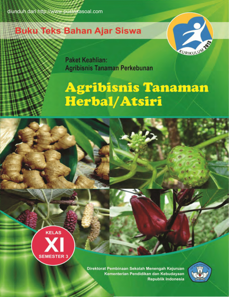 diunduh dari http://www.pustakasoal.com i KATA PENGANTAR Kurikulum 2013 dirancang untuk memperkuat kompetensi siswa dari sisi sikap, pengetahuan dan keterampilan secara utuh. Keutuhan tersebut menjadi dasar dalam perumusan kompetensi dasar tiap mata pelajaran mencakup kompetensi dasar kelompok sikap, kompetensi dasar kelompok pengetahuan, dan kompetensi dasar kelompok keterampilan. Semua mata pelajaran dirancang mengikuti rumusan tersebut. Pembelajaran kelas X dan XI jenjang Pendidikan Menengah Kejuruhan yang disajikan dalam buku ini juga tunduk pada ketentuan tersebut. Buku siswa ini diberisi materi pembelajaran yang membekali peserta didik dengan pengetahuan, keterapilan dalam menyajikan pengetahuan yang dikuasai secara kongkrit dan abstrak, dan sikap sebagai makhluk yang mensyukuri anugerah alam semesta yang dikaruniakan kepadanya melalui pemanfaatan yang bertanggung jawab. Buku ini menjabarkan usaha minimal yang harus dilakukan siswa untuk mencapai kompetensi yang diharuskan. Sesuai dengan pendekatan yang digunakan dalam kurikulum 2013, siswa diberanikan untuk mencari dari sumber belajar lain yang tersedia dan terbentang luas di sekitarnya. Peran guru sangat penting untuk meningkatkan dan menyesuaikan daya serp siswa dengan ketersediaan kegiatan buku ini. Guru dapat memperkayanya dengan kreasi dalam bentuk kegiatan-kegiatan lain yang sesuai dan relevan yang bersumber dari lingkungan sosial dan alam. Buku ini sangat terbuka dan terus dilakukan perbaikan dan penyempurnaan. Untuk itu, kami mengundang para pembaca memberikan kritik, saran, dan masukan untuk perbaikan dan penyempurnaan. Atas kontribusi tersebut, kami ucapkan terima kasih. Mudah-mudahan kita dapat memberikan yang terbaik bagi kemajuan dunia pendidikan dalam rangka mempersiapkan generasi seratus tahun Indonesia Merdeka (2045) ii DAFTAR ISI KATA PENGANTAR ..................................................................................................................................................... ii DAFTAR ISI .....................................................................................................................................................................iii DAFTAR GAMBAR ......................................................................................................................................................ix DAFTAR TABEL............................................................................................................................................................. x PETA KEDUDUKAN BAHAN AJAR ....................................................................................................................xi GLOSARIUM.................................................................................................................................................................. xii I. II. PENDAHULUAN .................................................................................................................................................1 A. Deskripsi ......................................................................................................................................................1 B. Prasyarat......................................................................................................................................................4 C. Petunjuk Penggunaan ..........................................................................................................................4 D. Tujuan Akhir..............................................................................................................................................4 E. Kompetensi Inti dan Kompetensi Dasar ..................................................................................5 F. Cek Kemampuan Awal ........................................................................................................................7 PEMBELAJARAN .............................................................................................................................................10 Kegiatan Pembelajaran 1. Keselamatan, Kesehatan Kerja dan Lingkungan Hidup pada Tanaman Herbal/Atsiri .......................................................................................................................10 A. Deskripsi ...................................................................................................................................................10 B. Kegiatan Belajar ..................................................................................................................................11 1. Tujuan Pembelajaran................................................................................................................11 2. Uraian Materi .................................................................................................................................11 a. Identifikasi unsur/bahan/kegiatan beresiko pada pekerjaan produksi tanaman herbal/atsiri ......................................................................................................................19 iii b. Alat dan bahan dalam penerapan K3LH pada pekerjaan produksi tanaman herbal/atsiri ......................................................................................................................23 c. Pelaksanaan K3LH secara disiplin dan bertanggungjawab dalam kegiatan produksi tanaman herbal/atsiri ............................................................................36 3. Refleksi...............................................................................................................................................46 4. Tugas ...................................................................................................................................................48 5. Tes Formatif....................................................................................................................................49 C. Penilaian .....................