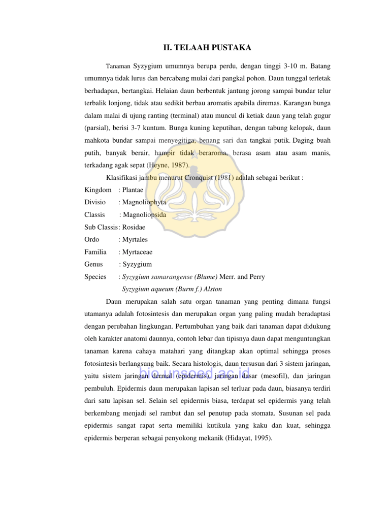 II. TELAAH PUSTAKA Tanaman Syzygium umumnya berupa perdu, dengan tinggi 3-10 m. Batang umumnya tidak lurus dan bercabang mulai dari pangkal pohon. Daun tunggal terletak berhadapan, bertangkai. Helaian daun berbentuk jantung jorong sampai bundar telur terbalik lonjong, tidak atau sedikit berbau aromatis apabila diremas. Karangan bunga dalam malai di ujung ranting (terminal) atau muncul di ketiak daun yang telah gugur (parsial), berisi 3-7 kuntum. Bunga kuning keputihan, dengan tabung kelopak, daun mahkota bundar sampai menyegitiga, benang sari dan tangkai putik. Daging buah putih, banyak berair, hampir tidak beraroma, berasa asam atau asam manis, terkadang agak sepat (Heyne, 1987). Klasifikasi jambu menurut Cronquist (1981) adalah sebagai berikut : Kingdom : Plantae Divisio : Magnoliophyta Classis : Magnoliopsida Sub Classis : Rosidae Ordo : Myrtales Familia : Myrtaceae Genus : Syzygium Species : Syzygium samarangense (Blume) Merr. and Perry Syzygium aqueum (Burm f.) Alston Daun merupakan salah satu organ tanaman yang penting dimana fungsi utamanya adalah fotosintesis dan merupakan organ yang paling mudah beradaptasi dengan perubahan lingkungan. Pertumbuhan yang baik dari tanaman dapat didukung oleh karakter anatomi daunnya, contoh lebar dan tipisnya daun dapat menguntungkan tanaman karena cahaya matahari yang ditangkap akan optimal sehingga proses fotosintesis berlangsung baik. Secara histologis, daun tersusun dari 3 sistem jaringan, bio.unsoed.ac.id yaitu sistem jaringan dermal (epidermis), jaringan dasar (mesofil), dan jaringan pembuluh. Epidermis daun merupakan lapisan sel terluar pada daun, biasanya terdiri dari satu lapisan sel. Selain sel epidermis biasa, terdapat sel epidermis yang telah berkembang menjadi sel rambut dan sel penutup pada stomata. Susunan sel pada epidermis sangat rapat serta memiliki kutikula yang kaku dan kuat, sehingga epidermis berperan sebagai penyokong mekanik (Hidayat, 1995). 3 Epidermis adalah sistem sel-sel yang bervariasi struktur dan fungsinya, yang menutupi tubuh tumbuhan. Struktur yang demikian tersebut dapat dihubungkan dengan peranan jaringan tersebut sebagai lapisan yang berhubungan dengan lingkungan luar. Adanya bahan lemak, kutin dan kutikula dapat membatasi penguapan, pada dinding terluar menjadikannnya kompak dan keras, sehingga dapat dianggap sebagai penyokong mekanis. Di antara sel-sel epidermis terdapat derivatnya antara lain yang disebut stomata, trikoma, sel kipas, sel silika dan sel gabus (Hidayat, 1995). Tebal dinding sel epidermis setiap tumbuhan berbeda-beda. Dinding sel epidermis yang berbatasan pada bagian luar terdapat penebalan oleh zat kutin sehingga membentuk lapisan kutikula. Lapisan ini membatasi ruang interselular yang membentuk sistem sehingga berhubungan langsung dengan stomata (Sutrian, 2004). Permukaan kutikula bila dilihat dari atas akan menampakkan bentuk kasar, bergerigi, seakan-akan menunjukkan adanya garis-garis (Sutrian, 1992). Cutler (1969) menyatakan bahwa kutikula pada epidermis daun baik permukaan atas maupun bawah merupakan faktor ketahanan struktural tanaman. Fungsi kutikula adalah menghambat terjadinya penetrasi jamur dan mikroorganisme lainnya. Semakin tebal lapisan kutikula daun maka semakin tahan tanaman tersebut terhadap penetrasi patogen. Mesofil merupakan bagian utama helaian daun yang mengandung kloroplas dan ruang antar sel. Mesofil dapat bersifat homogen atau terbagi menjadi jaringan tiang (palisade) dan jaringan spons (bunga karang). Jaringan palisade terletak langsung di bawah epidermis, sel ini dapat tersusun dalam satu lapisan atau lebih, berbentuk memanjang atau sedikit silindris, dan bentuknya lebih teratur daripada jaringan spons (Hidayat, 1995). Stomata adalah celah diantara epidermis yang diapit oleh 2 sel epidermis khusus yang disebut sel penutup. Dekat sel penutup terdapat sel-sel yang mengelilinginya disebut sel tetangga. Sel penutup dapat membuka dan menutup bio.unsoed.ac.id sesuai dengan kebutuhan tanaman akan transpirasinya, sedangkan sel-sel tetangga turut serta dalam perubahan osmotik yang berhubungan dengan pergerakan sel-sel penutup. Stomata terdapat pada semua bagian tumbuhan yang terdedah ke udara, tetapi lebih banyak terdapat pada daun (Pandey, 1982). Sel-sel penutup tanaman dikotil umumnya berbentuk ginjal, sedangkan monokotil mempunyai bentuk halter dan strukturnya spesifik yang jika dilihat dari permukaan sel terlihat sempit di bagian tengah dan membesar pada ujungnya. Dilihat dengan mikroskop elektron, protoplas 4 dari kedua sel penutup saling berhubungan melalui pori dinding yang membesar tersebut karena adanya sinambung ini, sel-sel penutup dianggap sebagai satu unit secara fisiologi dimana terjadi keseimbangan perubahan turgor (Fahn, 1991). Tipe stomata pada daun sangat bervariasi. Berdasarkan hubungan stomata dengan sel epidermis dan sel tetangga ada banyak tipe stomata. Klasifikasi ini terpisah dari klasifikasi berdasarkan perkembangan. Walaupun tipe yang berbeda dapat terjadi pada satu familia yang sama atau dapat juga pada daun dari spesies yang sama. Struktur stomata dapat digunakan dalam studi taksonomi (Fahn, 1991). Tjitrosoepomo (1978) menyatakan bahwa pada umumnya daun tanaman dikotil mempunyai helaian menjari atau menyirip, sedangkan monokotil umumnya sejajar atau melengkung. Hal ini menyebabkan perkembangan distribusi stomatanya juga mengikuti kaidah tersebut. Sebenarnya jika dilihat ukurannya, stomata mempunyai ukuran yang berbeda-beda ada yang kecil ada yang besar. Hasil pengamatan menunjukkan bahwa pada daun tanaman monokotil ukuran stomatanya relatif kecil, sehingga terlihat sangat padat daripada stomata daun dikotil (Haryanti, 2010). Shukla dan Misra (1982), menyatakan bahwa kekerabatan taksonomi adalah kekerabatan fenetik (penampakan) dan filogenetik (evolusi) antar individu. Kekerabatan sering diekspresikan dalam kekerabatan filogenetik saja. Meskipun demikian, konsep taksonomi numerik yang sekarang diterima sangat luas kekerabatan antar individu baik fene
