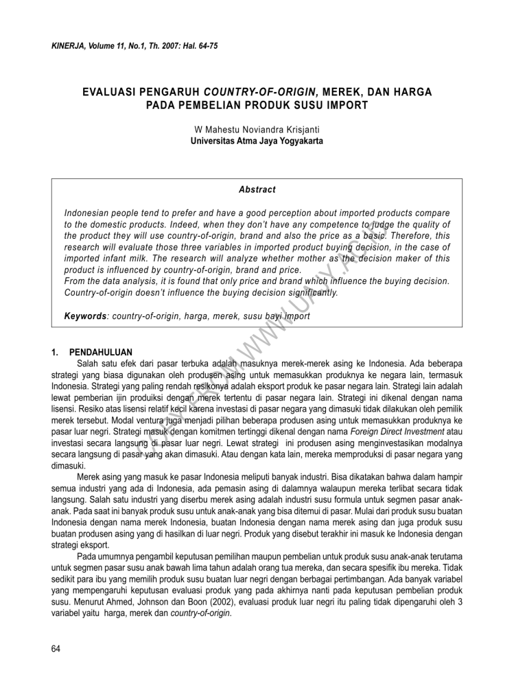 KINERJA, Volume 11, No.1, Th. 2007: Hal. 64-75 EVALUASI PENGARUH COUNTRY-OF-ORIGIN, MEREK, DAN HARGA PADA PEMBELIAN PRODUK SUSU IMPORT W Mahestu Noviandra Krisjanti Universitas Atma Jaya Yogyakarta Abstract .U AJ Y. AC .ID Indonesian people tend to prefer and have a good perception about imported products compare to the domestic products. Indeed, when they don’t have any competence to judge the quality of the product they will use country-of-origin, brand and also the price as a basic. Therefore, this research will evaluate those three variables in imported product buying decision, in the case of imported infant milk. The research will analyze whether mother as the decision maker of this product is influenced by country-of-origin, brand and price. From the data analysis, it is found that only price and brand which influence the buying decision. Country-of-origin doesn’t influence the buying decision significantly. W W Keywords: country-of-origin, harga, merek, susu bayi import CO PY FR OM W 1. PENDAHULUAN Salah satu efek dari pasar terbuka adalah masuknya merek-merek asing ke Indonesia. Ada beberapa strategi yang biasa digunakan oleh produsen asing untuk memasukkan produknya ke negara lain, termasuk Indonesia. Strategi yang paling rendah resikonya adalah eksport produk ke pasar negara lain. Strategi lain adalah lewat pemberian ijin produiksi dengan merek tertentu di pasar negara lain. Strategi ini dikenal dengan nama lisensi. Resiko atas lisensi relatif kecil karena investasi di pasar negara yang dimasuki tidak dilakukan oleh pemilik merek tersebut. Modal ventura juga menjadi pilihan beberapa produsen asing untuk memasukkan produknya ke pasar luar negri. Strategi masuk dengan komitmen tertinggi dikenal dengan nama Foreign Direct Investment atau investasi secara langsung di pasar luar negri. Lewat strategi ini produsen asing menginvestasikan modalnya secara langsung di pasar yang akan dimasuki. Atau dengan kata lain, mereka memproduksi di pasar negara yang dimasuki. Merek asing yang masuk ke pasar Indonesia meliputi banyak industri. Bisa dikatakan bahwa dalam hampir semua industri yang ada di Indonesia, ada pemasin asing di dalamnya walaupun mereka terlibat secara tidak langsung. Salah satu industri yang diserbu merek asing adalah industri susu formula untuk segmen pasar anakanak. Pada saat ini banyak produk susu untuk anak-anak yang bisa ditemui di pasar. Mulai dari produk susu buatan Indonesia dengan nama merek Indonesia, buatan Indonesia dengan nama merek asing dan juga produk susu buatan produsen asing yang di hasilkan di luar negri. Produk yang disebut terakhir ini masuk ke Indonesia dengan strategi eksport. Pada umumnya pengambil keputusan pemilihan maupun pembelian untuk produk susu anak-anak terutama untuk segmen pasar susu anak bawah lima tahun adalah orang tua mereka, dan secara spesifik ibu mereka. Tidak sedikit para ibu yang memilih produk susu buatan luar negri dengan berbagai pertimbangan. Ada banyak variabel yang mempengaruhi keputusan evaluasi produk yang pada akhirnya nanti pada keputusan pembelian produk susu. Menurut Ahmed, Johnson dan Boon (2002), evaluasi produk luar negri itu paling tidak dipengaruhi oleh 3 variabel yaitu harga, merek dan country-of-origin. 64 Evaluasi Pengaruh Country-of-origin, Merek, dan Harga Pada Pembelian Produk Susu Import (W Mahestu Noviandra Krisjanti) Dalam penelitian ini akan diuji, apakah country-of-origin memberikan pengaruh yang signifikan pada keputusan pembelian produk susu buatan luar negri. Lebih jauh akan diuji apakah country-of-origin memberikan pengaruh yang lebih besar pada evaluasi produk dibanding dua variabel indepen lainnya yaitu merek dan harga. OM W W W .U AJ Y. AC .ID 2. TINJAUAN LITERATUR 2.1. Country of Origin Beberapa penulis mempunyai pemahaman yang kurang lebih sama terhadap definisi country-of-origin, seperti misalnya Badri, Davis dan Davis (1995) memahami efek country-of-origin sebagai efek “made in”. Sedangkan Ahmed, Johnson dan Boon (2004) secara jelas mendefinisikan country-of-origin sebagai “country of manufacture or assembly that is identified by “made in” or manufactured in” labels. Czinkota dan Ronkainen (2001) bahkan menyebutkan bahwa country-of-origin dipahami sebagai efek yang muncul dalam persepsi konsumen yang dipengaruhi oleh lokasi dimana suatu produk dihasilkan. Lokasi atau negara tempat suatu produk dihasilkan akan mempengaruhi persepsi orang mengenai kualitas produk tersebut. Semakin banyak informasi yang dimiliki oleh konsumen, maka efek country-of-origin akan semakin berkurang. Hal ini disebabkan oleh terbentuknya rasionalitas konsumen akan kualitas suatu produk. Hal senada disampaikan oleh Zhang (1996) yang mengatakan bahwa ketersediaan informasi yang jelas dan dapat dipercaya akan mendorong sikap tertentu pada pemilihan produk. Dalam beberapa penelitian (Ahmed dan d”Astous: 2004; Kaynak dan Kara, 2002; Kaynak, Kucukemiroglu dan Hyder, 2000) disepakati bahwa konsumen mempunyai persepsi tertentu mengenai lokasi/ negara tempat suatu produk dihasilkan. Ketika konsumen hanya mempunyai informasi lokasi suatu produk dihasilkan, maka dalam pengambilaan keputusan pembelian akan dipengaruhi oleh persepsi konsumen akan negara tersebut. Dengan masuknya produk-produk asing ke suatu negara dengan strategi modal ventura, investasi secara langsung maupun lisensi sebagai salah satu efek dari pasar terbuka maka semakin berkurang juga produk-produk buatan luar negri. Namun demikian beberapa tahun terakhir terdapat aktivitas efisiensi di beberapa perusahaan, seperti P & G, dengan menutup pabrik di beberapa negara dan mensentralkan di satu negara saja. Usaha ini ternyata bisa memberikan kontribusi penurunan biaya produksi yang cukup signifikan. Dan tentu saja di beberapa negara mucul efek country-of-origin yang mempengaruhi persepsi konsumen terdapat kualitas produk tersebut. CO PY FR 2.1.1. Pendekatan dalam Riset Country-of-Origin Menurut Kaynak, Kucukemiroglu dan Hyder (2000), Terdapat empat pen
