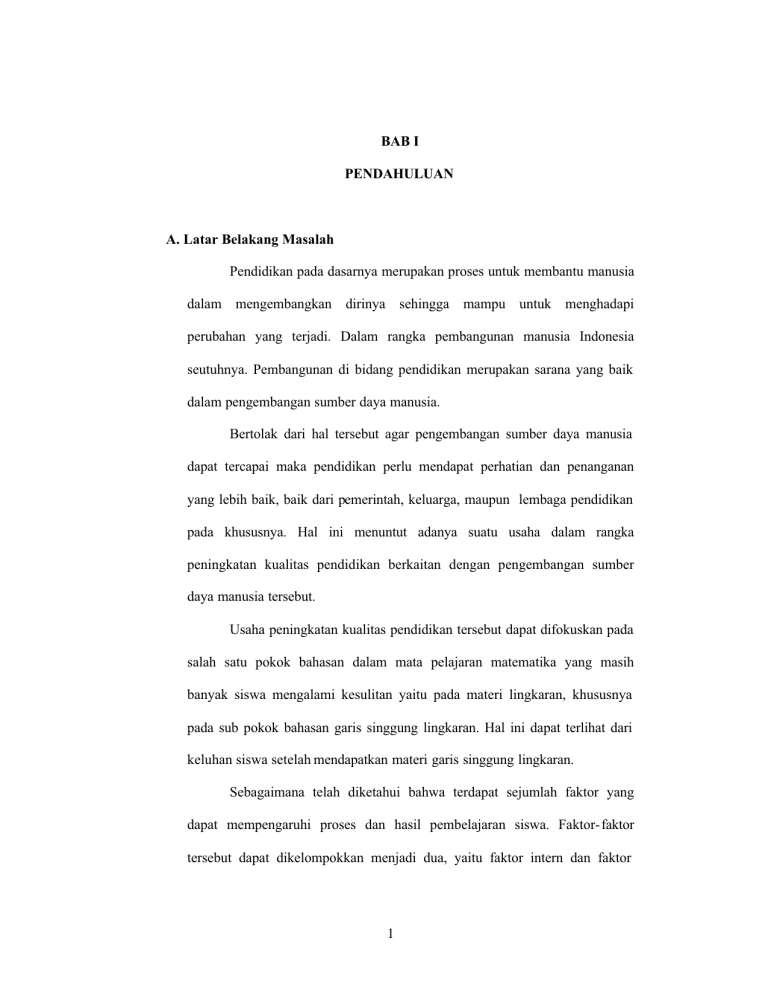1 BAB I PENDAHULUAN A. Latar Belakang Masalah Pendidikan pada dasarnya merupakan proses untuk membantu manusia dalam mengembangkan dirinya sehingga mampu untuk menghadapi perubahan yang terjadi. Dalam rangka pembangunan manusia Indonesia seutuhnya. Pembangunan di bidang pendidikan merupakan sarana yang baik dalam pengembangan sumber daya manusia. Bertolak dari hal tersebut agar pengembangan sumber daya manusia dapat tercapai maka pendidikan perlu mendapat perhatian dan penanganan yang lebih baik, baik dari pemerintah, keluarga, maupun lembaga pendidikan pada khususnya. Hal ini menuntut adanya suatu usaha dalam rangka peningkatan kualitas pendidikan berkaitan dengan pengembangan sumber daya manusia tersebut. Usaha peningkatan kualitas pendidikan tersebut dapat difokuskan pada salah satu pokok bahasan dalam mata pelajaran matematika yang masih banyak siswa mengalami kesulitan yaitu pada materi lingkaran, khususnya pada sub pokok bahasan garis singgung lingkaran. Hal ini dapat terlihat dari keluhan siswa setelah mendapatkan materi garis singgung lingkaran. Sebagaimana telah diketahui bahwa terdapat sejumlah faktor yang dapat mempengaruhi proses dan hasil pembelajaran siswa. Faktor- faktor tersebut dapat dikelompokkan menjadi dua, yaitu faktor intern dan faktor 1 2 ekstern. Kedua faktor inilah yang menentukan berhasil atau tidaknya proses pembelajaran siswa. Menurut Muhibbin Syah (1995:138) faktor-faktor yang mempengaruhi proses dan hasil pembelajaran siswa tersebut adalah sebagai berikut: Pertama faktor internal yang terdiri dari: (1) Aspek Fisiologis yaitu kondisi umum jasmani yang menandai tingkat kebugaran tubuh dan (2) Aspek psikologis yang mencakup inelegensi, minat, motivasi, kesiapan dan konsentrasi belajar. Kedua faktor eksternal yang terdiri dari: (1) Lingkungan Sosial seperti guru, para staf administrasi dan teman-teman sekelas dapat mempengaruhi semangat belajar seorang siswa dan (2) Lingkungan Non-sosial seperti gedung sekolah dan letaknya, alat-alat belajar, keadaan cuaca serta waktu belajar yang digunakan siswa. Faktor tersebut dipandang turut menentukan tingkat keberhasilan belajar siswa. Dalam proses belajar mengajar, guru terbiasa menyajikan materi menggunakan metode konvensional, yaitu metode ceramah. Metode mengajar ini menjadikan siswa pasif dalam menerima informasi. Siswa hanya diajak untuk mendengarkan mencatat tanpa aktifitas. Dengan demikian guru tidak tahu apakah siswanya benar-benar mengerti dengan materi yang disampaikan. Dari realita ini guru harus berani mencoba metode- metode baru sehingga dapat mengaktifkan siswa dan menarik perhatian siswa untuk merasa senang mempelajari mata pelajaranya, sehingga siswa termotivasi untuk belajar. Berdasarkan permasalahan yang ada, peneliti akan mencoba salah satu metode alternatif yang dapat digunakan pada sub pokok bahasan garis 3 singgung lingkaran sehingga prestasi belajar siswa akan menjadi lebih baik. Metode yang dimaksud adalah metode pembelajaran kelompok tipe STAD (Students Team Achievement Divisions). Guru dalam metode STAD hanya memberikan konsep-konsep pokok. Pengembangan dari konsep-konsep tersebut dilakukan oleh siswa dalam bentuk kelompok melalui soal-soal yang diberikan. Dalam kelompok siswa mendiskusikan konsep dan soal yang diberikan secara bersama, membandingkan masing- masing jawaban dari soal yang diberikan, dan membetulkan kesalahan dalam memahami konsep, sehingga seluruh siswa akan terlibat secara langsung dalam penguasaan materi pelajaran. Keaktifan siswa dalam STAD sangat ditekankan dan dalam STAD keaktifan siswa dapat dibangkitkan. Siswa yang kurang memahami suatu konsep akan lebih mudah bertanya dan meminta penjelasan sejelas-jelasnya kepada teman dalam kelompoknya tanpa adanya perasaan takut atau malu sebagaimana apabila bertanya pada guru. Selain metode pembelajaran, gaya belajar siswa juga berperan dalam keberhasilan proses pembelajaran. Dalam kegiatan pembelajaran segala pengetahuan pada dasarnya diperoleh dari usaha siswa sendiri, sehingga gaya belajar siswa dalam proses pembelajaran sangat diperlukan. Umumnya, setiap siswa memiliki ga ya belajar sendiri-sendiri dalam menelaah suatu materi pelajaran yang sedang dipelajari. Akan tetapi gaya belajar setiap siswa tersebut akan berperan optimal apabila diterapkan pada metode yang tepat. Adapun gaya belajar menurut De Porter (1999:110-112) 4 berdasarkan cara menerima informasi dengan mudah (modalitas) digolongkan kedalam tiga tipe yaitu gaya belajar tipe visual, tipe auditorial, dan tipe kinestetik. Guru harus mampu memadukan faktor-faktor yang berperan dalam keberhasilan proses pembelajaran agar hasil pembelajaran yang optimal dapat tercapai. Penggunaan metode pembelajaran harus disesuaikan dengan materi yang disampaikan dan juga melihat kondisi siswa. Dengan demikian diharapkan prestasi belajar siswa menjadi lebih baik. B. Identifikasi Masalah Berdasarkan latar belakang masalah tersebut diatas, maka dapat ditarik identifikasi masalah sebagai berikut: 1. Kurang tepatnya metode yang digunakan oleh guru matematika dalam menyampaikan pokok bahasan tertentu sehingga akan mempengaruhi prestasi belajar. 2. Adanya kemungkinan penggunakan metode pengajaran selain konvensional untuk menyampaikan sub kompetensi garis singgung lingkaran sehingga menimbulkan peningkatan prestasi belajar. 3. Perbedaan gaya belajar siswa memungkinkan adanya perbedaan pada prestasi belajar siswa. 5 C. Pembatasan Masalah Beberapa permasalahan terkadang akan timbul secara bersamaan. Sehingga hal ini dapat mempersulit peneliti dalam meneliti permasalahanpermasalahan yang ada. Dari beberapa permasalahan yang ada pada identifikasi masalah diatas akan dibatasi pada beberapa masalah. Dengan adanya pembatasan masalah diharapkan masalah yang diteliti dapat dikaji lebih mendalam. Adapun pada penelitian, diberikan pembatasan masalah sebagai berikut: 1. Metode pembelajaran yang dimaksud dalam penelitian ini adalah metode pembelajaran kooperatif tipe STAD. 2. Gaya belajar yang dimaksud dalam p