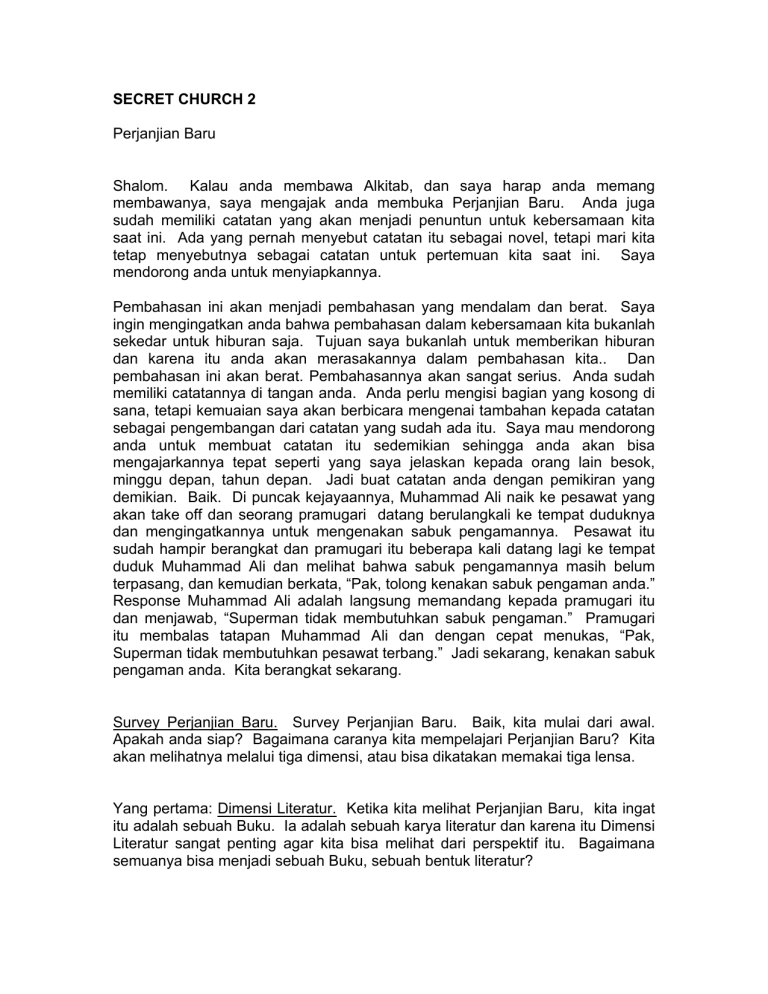 SECRET CHURCH 2 Perjanjian Baru Shalom. Kalau anda membawa Alkitab, dan saya harap anda memang membawanya, saya mengajak anda membuka Perjanjian Baru. Anda juga sudah memiliki catatan yang akan menjadi penuntun untuk kebersamaan kita saat ini. Ada yang pernah menyebut catatan itu sebagai novel, tetapi mari kita tetap menyebutnya sebagai catatan untuk pertemuan kita saat ini. Saya mendorong anda untuk menyiapkannya. Pembahasan ini akan menjadi pembahasan yang mendalam dan berat. Saya ingin mengingatkan anda bahwa pembahasan dalam kebersamaan kita bukanlah sekedar untuk hiburan saja. Tujuan saya bukanlah untuk memberikan hiburan dan karena itu anda akan merasakannya dalam pembahasan kita.. Dan pembahasan ini akan berat. Pembahasannya akan sangat serius. Anda sudah memiliki catatannya di tangan anda. Anda perlu mengisi bagian yang kosong di sana, tetapi kemuaian saya akan berbicara mengenai tambahan kepada catatan sebagai pengembangan dari catatan yang sudah ada itu. Saya mau mendorong anda untuk membuat catatan itu sedemikian sehingga anda akan bisa mengajarkannya tepat seperti yang saya jelaskan kepada orang lain besok, minggu depan, tahun depan. Jadi buat catatan anda dengan pemikiran yang demikian. Baik. Di puncak kejayaannya, Muhammad Ali naik ke pesawat yang akan take off dan seorang pramugari datang berulangkali ke tempat duduknya dan mengingatkannya untuk mengenakan sabuk pengamannya. Pesawat itu sudah hampir berangkat dan pramugari itu beberapa kali datang lagi ke tempat duduk Muhammad Ali dan melihat bahwa sabuk pengamannya masih belum terpasang, dan kemudian berkata, “Pak, tolong kenakan sabuk pengaman anda.” Response Muhammad Ali adalah langsung memandang kepada pramugari itu dan menjawab, “Superman tidak membutuhkan sabuk pengaman.” Pramugari itu membalas tatapan Muhammad Ali dan dengan cepat menukas, “Pak, Superman tidak membutuhkan pesawat terbang.” Jadi sekarang, kenakan sabuk pengaman anda. Kita berangkat sekarang. Survey Perjanjian Baru. Survey Perjanjian Baru. Baik, kita mulai dari awal. Apakah anda siap? Bagaimana caranya kita mempelajari Perjanjian Baru? Kita akan melihatnya melalui tiga dimensi, atau bisa dikatakan memakai tiga lensa. Yang pertama: Dimensi Literatur. Ketika kita melihat Perjanjian Baru, kita ingat itu adalah sebuah Buku. Ia adalah sebuah karya literatur dan karena itu Dimensi Literatur sangat penting agar kita bisa melihat dari perspektif itu. Bagaimana semuanya bisa menjadi sebuah Buku, sebuah bentuk literatur? Kedua: Dimensi Sejarah. Ini bukan hanya sebuah cerita dongeng masa lalu yang mungkin benar tetapi mungkin juga tidak. Ini adalah sebuah kebenaran sejarah. Kebenaran sejarah yang kita yakini memiliki kaitan erat dengan semua manusia di sepanjang sejarah termasuk kehidupan kita. Inilah sebabnya kita perlu mempelajarinya, karena ada nilai sejarah di dalam Perjanjian Baru. Dimensi Literatur, Dimensi Sejarah, dan kemudian yang ketiga : Dimensi Theologis. Apakah yang diajarkan Perjanjian Baru tentang Allah? Dan itulah yang akan kita selidiki. Kita akan membagi pembahasan kita dalam sesi belajar ini menjadi dua bagian. Dan kita akan membuatnya menjadi empat sesi pembahasan, tapi dalam dua bagian utama. Yang pertama, kita akan menyelami Dimensi Literatur dan Sejarah, untuk mendapatkan gambaran umum dari Kitab-Kitab di dalam Perjanjian Baru dan kemudian kedua, merupakan bagian terakhir dari waktu kita bersama dalam pembahasan kita, jadi kalau anda entah karena alasan apa berniat meninggalkan bagian kedua ini, maka anda akan kehilangan bagian yang terpenting, karena bagian yang kedua adalah kita akan menyelami Perjanjian Baru dan melihat bagaimana semuanya saling berkaitan untuk memberikan kepada kita gambaran tentang Kristus dan tentang Allah dan apa kaitannya dengan kehidupan kita. Jadi itulah tiga dimensi yang akan kita perhatikan dengan menggunakan tiga lensa. Apakah Perjanjian Baru, kalau kita berpikir mengenai Perjanjian Baru sebagai Literatur? Perjanjian Baru adalah kumpulan dari berapa banyak kitab? 27. baik. 27. Beberapa di antara anda mungkin berpikir, rasanya ada 27, tapi mungkin saya keliru juga. Dua puluh tujuh kitab dituliskan oleh satu Penulis Ilahi, itu sesuatu yang penting untuk diingat. Roh Kudus Allah, Allah adalah penulis dari Kitab Suci. Kita akan melihat hal itu dinyatakan beberapa kali. Dan perkiraannya, ada yang tahu berapa jumlah orang yang dipakai menjadi penulis? Perkiraannya ada sekitar sembilan orang. Matius, Markus, Lukas, Yohanes. Itu jelas dari nama keempat kitab pertama. Lalu ada juga Paulus dan Petrus, dan ada juga Yakobus dan Yudas lalu ada penulis surat Ibrani yang kemungkinan bukan salah satu dari mereka. Angka itu berubah bergantung kepada pandangan anda tentang penulis surat Ibrani. Kita akan melihat hal itu nantinya. Tetapi secara perkiraan, dan perkiraan ini bukannya tidak berdasar, jumlah orang yang menjadi penulis adalah sekitar sembilan orang penulis. Ibrani menjadi sebuah kasus yang menarik. Surat ini ditulis dalam bahsa Yunani Koine yang merupakan bahasa Yunani yang dipakai secara umum. Perjanjian Baru ditulis menggunakan bahasa yang umum di masyarakat, dan kita akan membicarakan mengenai hal ini juga, dalam jangka waktu kurang dari seratus tahun. Jadi pada dasarnya anda akan melihat bahwa keseluruhan kitab-kitab ini dituliskan dalam jangka waktu kurang dari seratus tahun. Jadi kita melihat bahwa sebenarnya memakan waktu kurang dari satu abad untuk menyelesaikan penulisan Kitab ini. Pada dasarnya mengenai kehidupan dan pelayanan Kristus dan semua yang ditulis di dalam kitab itu belum selesai ditulis sebelum Ia meninggalkan dunia ini, dan kemudian anda akan melihat ada satu generasi tokoh yang sudah menjadi saksi mata dari kehidupan Kristus dan yang masih secara langsung berhubungan dengan Dia. Jadi anda melihat waktu penulisannya kurang dari seratus tahun.dan Tiga Jenis Utama dalam Literatur Perjanjian Baru Pertama Narasi Sejarah. Narasi Sejarah. Dan itu artinya cerita. Perjanjian Baru adalah sebu