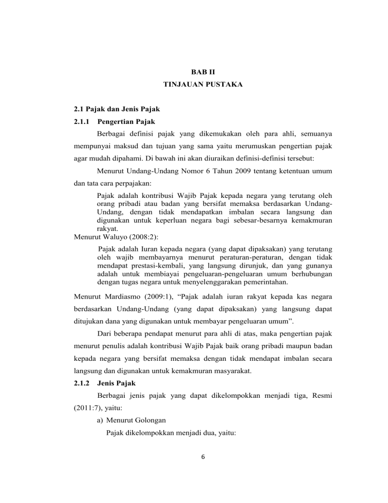 BAB II TINJAUAN PUSTAKA 2.1 Pajak dan Jenis Pajak 2.1.1 Pengertian Pajak Berbagai definisi pajak yang dikemukakan oleh para ahli, semuanya mempunyai maksud dan tujuan yang sama yaitu merumuskan pengertian pajak agar mudah dipahami. Di bawah ini akan diuraikan definisi-definisi tersebut: Menurut Undang-Undang Nomor 6 Tahun 2009 tentang ketentuan umum dan tata cara perpajakan: Pajak adalah kontribusi Wajib Pajak kepada negara yang terutang oleh orang pribadi atau badan yang bersifat memaksa berdasarkan UndangUndang, dengan tidak mendapatkan imbalan secara langsung dan digunakan untuk keperluan negara bagi sebesar-besarnya kemakmuran rakyat. Menurut Waluyo (2008:2): Pajak adalah Iuran kepada negara (yang dapat dipaksakan) yang terutang oleh wajib membayarnya menurut peraturan-peraturan, dengan tidak mendapat prestasi-kembali, yang langsung dirunjuk, dan yang gunanya adalah untuk membiayai pengeluaran-pengeluaran umum berhubungan dengan tugas negara untuk menyelenggarakan pemerintahan. Menurut Mardiasmo (2009:1), “Pajak adalah iuran rakyat kepada kas negara berdasarkan Undang-Undang (yang dapat dipaksakan) yang langsung dapat ditujukan dana yang digunakan untuk membayar pengeluaran umum”. Dari beberapa pendapat menurut para ahli di atas, maka pengertian pajak menurut penulis adalah kontribusi Wajib Pajak baik orang pribadi maupun badan kepada negara yang bersifat memaksa dengan tidak mendapat imbalan secara langsung dan digunakan untuk kemakmuran masyarakat. 2.1.2 Jenis Pajak Berbagai jenis pajak yang dapat dikelompokkan menjadi tiga, Resmi (2011:7), yaitu: a) Menurut Golongan Pajak dikelompokkan menjadi dua, yaitu: 6 7 1. Pajak langsung: pajak yang harus dipikul atau ditanggung sendiri oleh Wajib Pajak dan tidak dapat dilimpahkan atau dibebankan kepada orang lain. Pajak harus menjadi beban Wajib Pajak yang bersangkutan. 2. Pajak tidak langsung: pajak yang pada akhirnya dapat dibebankan atau dilimpahkan kepada orang lain atau pihak ketiga. Pajak tidak langsung terjadi jika suatu kegiatan, peristiwa, atau perbuatan yang menyebabkan terutangnya pajak, misalnya terjadi penyerahan barang atau jasa. b) Menurut Sifat Pajak dapat dikelompokkan menjadi dua, yaitu: 1. Pajak subjektif: pajak yang pengenaannya memerhatikan keadaan pribadi Wajib Pajak atau pengenaan pajak yang memerhatikan keadaan subjeknya. 2. Pajak objektif: pajak yang pengenaannya memerhatikan objeknya baik berupa benda, keadaan, perbuatan, atau peristiwa yang mengakibatkan timbulnya kewajiban membayar pajak, tanpa memerhatikan keadaan pribadi subjek pajak (Wajib Pajak) maupun tempat tinggal. c) Menurut Lembaga Pemungut Pajak dikelompokkan menjadi dua, yaitu : 1. 2. Pajak Negara (pajak pusat): pajak yang dipungut oleh pemerintah pusat dan digunakan untuk membiayai rumah tangga negara pada umumnya. Pajak Daerah: pajak yang dipungut oleh pemerintah daerah baik tingkat I (pajak provinsi) maupun daerah tingkat II (pajak kabupaten/kota) dan digunakan untuk membiayai rumah tangga daerah masing-masing. 2.2 Wajib Pajak 2.2.1 Pengertian Wajib Pajak Pajak merupakan peranan penting untuk pembiayaan pembangunan, dimana Wajib Pajak merupakan bagian dari penerimaan pajak tersebut. Dengan kata lain tidak akan ada pajak apabila tidak ada Wajib Pajak. Menurut Undang-Undang Nomor 16 Tahun 2009 tentang Perubahan Ketiga Atas Undang-Undang Nomor 6 Tahun 1983 tentang Ketentuan Umum Perpajakan, “Wajib Pajak adalah orang pribadi atau badan, meliputi pembayar pajak, pemotong pajak dan pemungut pajak yang mempunyai hak dan kewajiban perpajakan sesuai dengan ketentuan peraturan perundang-undangan perpajakan”. 8 Sebagaimana telah diketahui banyak Wajib Pajak terdaftar yang tidak memenuhi kewajiban perpajakannya. Oleh karena itu ada beberapa istilah seperti Wajib Pajak Efektif dan Wajib Pajak Non Efektif. Adapun pengertian Wajib Pajak Efektif adalah Wajib Pajak yang memenuhi kewajiban perpajakannya, berupa memenuhi kewajiban menyampaikan Surat Pemberitahuan (SPT) Masa dan/atau Tahunan sebagaimana mestinya. Sedangkan Wajib Pajak Non Efektif adalah Wajib Pajak yang tidak memenuhi kewajiban perpajakannya. 2.2.2 Kewajiban Wajib Pajak Menurut Mardiasmo (2009:54), Kewajiban Wajib Pajak adalah sebagai berikut: 1. 2. 3. 4. 5. 6. Mendaftarkan diri untuk mendapatkan NPWP Melaporkan usahanya untuk dikukuhkan sebagai Pengusaha Kena Pajak (PKP) Menghitung dan membayar sendiri pajak dengan benar Mengisi dengan benar SPT (SPT diambil sendiri), dan memasukkan ke Kantor Pelayanan Pajak dalam batas waktu yang telah ditentukan Menyelenggarakan pembukuan dan pencatatan Jika diperiksa wajib: a) Memperlihatkan dan/atau meminjamkan buku atau catatan, dokumen yang menjadi dasarnya dan dokumen lain yang berhubungan dengan penghasilan yang diperoleh, kegiatan usaha, pekerjaan bebas Wajib Pajak atau objek yang terutang pajak; b) Memberikan kesempatan untuk memasuki tempat atau ruang yang dipandang perlu dan memberi bantuan guna kelancaran pemeriksaan; c) Memberikan keterangan yang diperlukan. 2.2.3 Surat Ketetapan Pajak Besarnya pajak yang terutang dalam suatu tahun pajak sebagai ketetapan pajak, tertuang dalam surat yang diistilahkan dengan Surat Ketetapan Pajak. Menurut Undang-Undang Nomor 28 tahun 2007 tentang Ketentuan Umum dan Tata Cara Perpajakan (KUP) yang dikutip oleh Waluyo (2008:51), Surat Ketetapan Pajak adalah: “...surat ketetapan yang meliputi Surat Ketetapan Kurang Bayar, Surat Ketetapan Kurang Bayar Tambahan, Surat Ketetapan Nihil, atau Surat Ketetapan Lebih Bayar”. Surat Ketetapan Pajak ini sebagai suatu ketetapan terulis yang menimbulkan hak dan kewajiban, memuat besarnya utang pajak pada tahun 9 tertentu bagi Wajib Pajak yang nama dan alamatnya tercantum dalam surat ketetapan pajak. Ketetapan pajak ini merupakan tembusan dari kohir sehingga bentuk dan isi kohir sama dengan surat ketetapan pajak. 2.2.4 Surat Tagihan Pajak Menurut Undang-Undang Nomor 28 Tahun 2007, Surat Tagihan Pajak (STP) adalah: “surat untuk melakukan tagihan pajak dan/atau sanksi administ