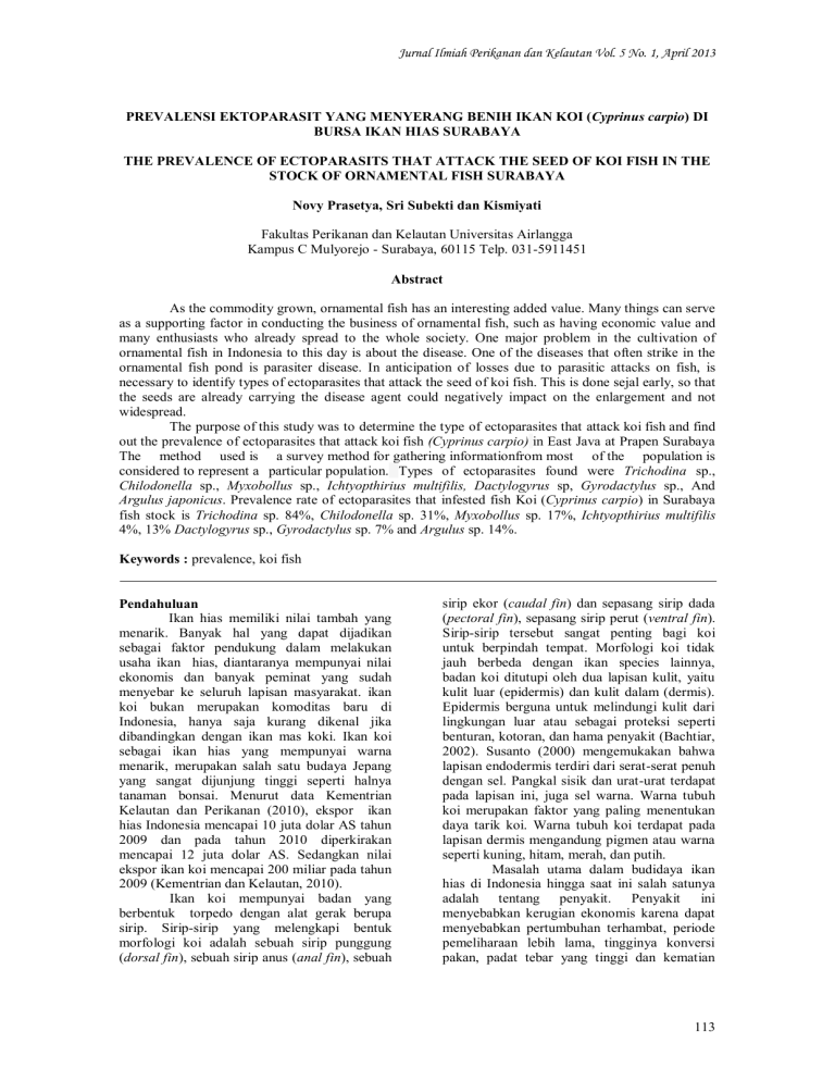 Jurnal Ilmiah Perikanan dan Kelautan Vol. 5 No. 1, April 2013 PREVALENSI EKTOPARASIT YANG MENYERANG BENIH IKAN KOI (Cyprinus carpio) DI BURSA IKAN HIAS SURABAYA THE PREVALENCE OF ECTOPARASITS THAT ATTACK THE SEED OF KOI FISH IN THE STOCK OF ORNAMENTAL FISH SURABAYA Novy Prasetya, Sri Subekti dan Kismiyati Fakultas Perikanan dan Kelautan Universitas Airlangga Kampus C Mulyorejo - Surabaya, 60115 Telp. 031-5911451 Abstract As the commodity grown, ornamental fish has an interesting added value. Many things can serve as a supporting factor in conducting the business of ornamental fish, such as having economic value and many enthusiasts who already spread to the whole society. One major problem in the cultivation of ornamental fish in Indonesia to this day is about the disease. One of the diseases that often strike in the ornamental fish pond is parasiter disease. In anticipation of losses due to parasitic attacks on fish, is necessary to identify types of ectoparasites that attack the seed of koi fish. This is done sejal early, so that the seeds are already carrying the disease agent could negatively impact on the enlargement and not widespread. The purpose of this study was to determine the type of ectoparasites that attack koi fish and find out the prevalence of ectoparasites that attack koi fish (Cyprinus carpio) in East Java at Prapen Surabaya The method used is a survey method for gathering informationfrom most of the population is considered to represent a particular population. Types of ectoparasites found were Trichodina sp., Chilodonella sp., Myxobollus sp., Ichtyopthirius multifilis, Dactylogyrus sp, Gyrodactylus sp., And Argulus japonicus. Prevalence rate of ectoparasites that infested fish Koi (Cyprinus carpio) in Surabaya fish stock is Trichodina sp. 84%, Chilodonella sp. 31%, Myxobollus sp. 17%, Ichtyopthirius multifilis 4%, 13% Dactylogyrus sp., Gyrodactylus sp. 7% and Argulus sp. 14%. Keywords : prevalence, koi fish Pendahuluan Ikan hias memiliki nilai tambah yang menarik. Banyak hal yang dapat dijadikan sebagai faktor pendukung dalam melakukan usaha ikan hias, diantaranya mempunyai nilai ekonomis dan banyak peminat yang sudah menyebar ke seluruh lapisan masyarakat. ikan koi bukan merupakan komoditas baru di Indonesia, hanya saja kurang dikenal jika dibandingkan dengan ikan mas koki. Ikan koi sebagai ikan hias yang mempunyai warna menarik, merupakan salah satu budaya Jepang yang sangat dijunjung tinggi seperti halnya tanaman bonsai. Menurut data Kementrian Kelautan dan Perikanan (2010), ekspor ikan hias Indonesia mencapai 10 juta dolar AS tahun 2009 dan pada tahun 2010 diperkirakan mencapai 12 juta dolar AS. Sedangkan nilai ekspor ikan koi mencapai 200 miliar pada tahun 2009 (Kementrian dan Kelautan, 2010). Ikan koi mempunyai badan yang berbentuk torpedo dengan alat gerak berupa sirip. Sirip-sirip yang melengkapi bentuk morfologi koi adalah sebuah sirip punggung (dorsal fin), sebuah sirip anus (anal fin), sebuah sirip ekor (caudal fin) dan sepasang sirip dada (pectoral fin), sepasang sirip perut (ventral fin). Sirip-sirip tersebut sangat penting bagi koi untuk berpindah tempat. Morfologi koi tidak jauh berbeda dengan ikan species lainnya, badan koi ditutupi oleh dua lapisan kulit, yaitu kulit luar (epidermis) dan kulit dalam (dermis). Epidermis berguna untuk melindungi kulit dari lingkungan luar atau sebagai proteksi seperti benturan, kotoran, dan hama penyakit (Bachtiar, 2002). Susanto (2000) mengemukakan bahwa lapisan endodermis terdiri dari serat-serat penuh dengan sel. Pangkal sisik dan urat-urat terdapat pada lapisan ini, juga sel warna. Warna tubuh koi merupakan faktor yang paling menentukan daya tarik koi. Warna tubuh koi terdapat pada lapisan dermis mengandung pigmen atau warna seperti kuning, hitam, merah, dan putih. Masalah utama dalam budidaya ikan hias di Indonesia hingga saat ini salah satunya adalah tentang penyakit. Penyakit ini menyebabkan kerugian ekonomis karena dapat menyebabkan pertumbuhan terhambat, periode pemeliharaan lebih lama, tingginya konversi pakan, padat tebar yang tinggi dan kematian 113 Prevalensi Ektoparasit Yang Menyerang...... ikan, sehingga dapat mengakibatkan menurunnya atau hilangnya produksi (Handajani dan Samsundari, 2005). Salah satu penyakit yang sering menyerang ikan hias di kolam adalah penyakit parasiter, yaitu penyakit yang disebabkan organisme parasit Protozoa, Helminth dan Arthropoda. Parasit merupakan hewan renik yang hidup pada organisme lain yang berbeda spesiesnya, selain mendapatkan perlindungan juga memperoleh makanan untuk kelangsungan hidupnya. Penularan parasit lebih mudah dan lebih cepat terjadi dalam usaha budidaya ikan Koi (Cyprinus carpio). Parasit yang sering menyerang pada ikan air tawar adalah Trichodina sp., Ichthyophthirius multifilis, Oodonium sp., Chilodonella sp., Cestoda dan Trematoda (Yuasa et al., 2003). Untuk mengetahui jenis ektoparasit yang menyerang benih ikan koi (Cyprinus carpio) di bursa ikan hias Surabaya dan untuk mengetahui tingkat prevalensi ektoparasit yang menyerang benih ikan koi (Cyprinus carpio) di bursa ikan hias Surabaya. digunakan dalam melaksanakan penelitian ini adalah benih ikan koi ukuran 5-10 cm (Cyprinus carpio) yang diperoleh dari penjual ikan di bursa ikan hias Jawa Timur jalan Raya Prapen Surabaya. Bahan yang digunakan untuk pemeriksaan parasit adalah ikan sampel, tisu dan aquades. Peralatan penelitian yang akan digunakan dalam pemeriksaan parasit adalah gunting, pinset, pisau bedah dan nampan. Alat yang digunakan untuk identifikasi parasit adalah obyek gelas, cover gelas, mikroskop binokuler. Metode penelitian yang digunakan dalam penelitian ini adalah metode survei. Benih ikan koi dibeli dari 5 penjual, jumlah total ikan sampel sebanyak 100 ekor dengan masingmasing pengambilan sampel tiap penjual sebanyak 20 ekor disesuaikan dengan jumlah yang ada yaitu minimal 5-10 ekor (Balai Karantina Ikan kelas II Tanjung Emas, 2009). Pemeriksaan ektoparasit meliputi bagian permukaan tubu