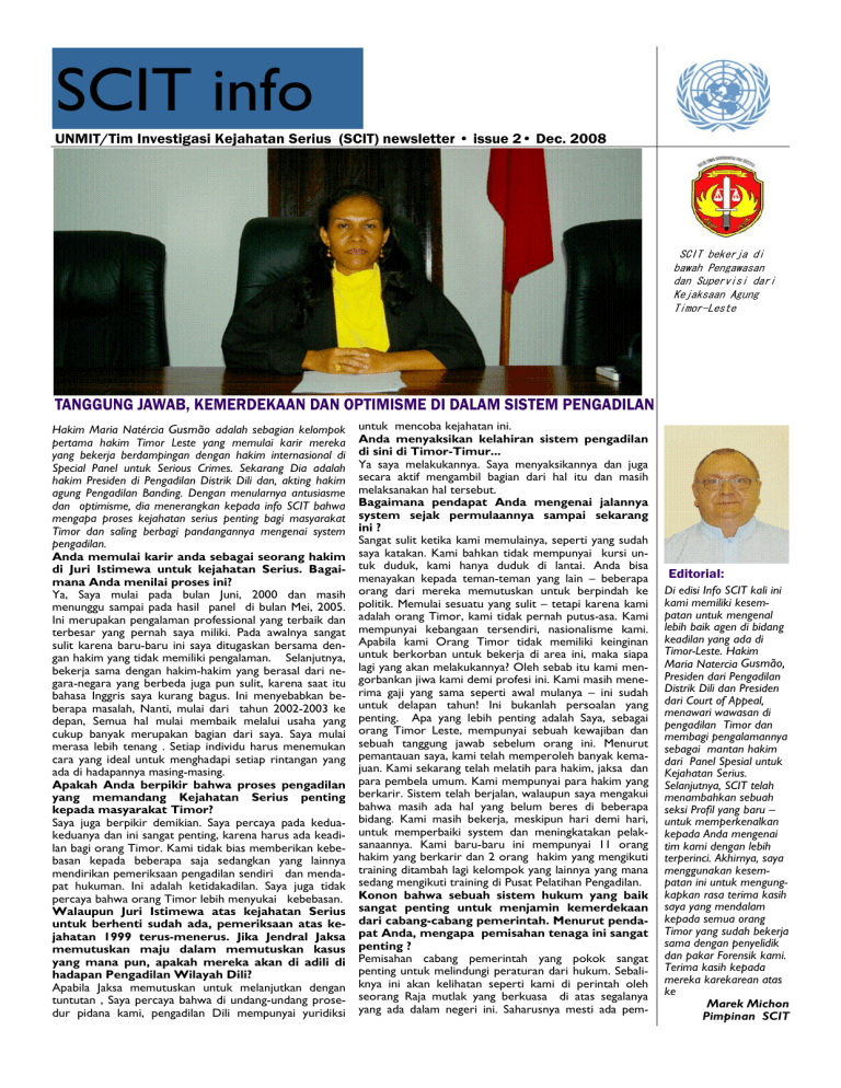 SCIT info UNMIT/Tim Investigasi Kejahatan Serius (SCIT) newsletter • issue 2• Dec. 2008 SCIT bekerja di bawah Pengawasan dan Supervisi dari Kejaksaan Agung Timor-Leste TANGGUNG JAWAB, KEMERDEKAAN DAN OPTIMISME DI DALAM SISTEM PENGADILAN Hakim Maria Natércia Gusmão adalah sebagian kelompok pertama hakim Timor Leste yang memulai karir mereka yang bekerja berdampingan dengan hakim internasional di Special Panel untuk Serious Crimes. Sekarang Dia adalah hakim Presiden di Pengadilan Distrik Dili dan, akting hakim agung Pengadilan Banding. Dengan menularnya antusiasme dan optimisme, dia menerangkan kepada info SCIT bahwa mengapa proses kejahatan serius penting bagi masyarakat Timor dan saling berbagi pandangannya mengenai system pengadilan. Anda memulai karir anda sebagai seorang hakim di Juri Istimewa untuk kejahatan Serius. Bagaimana Anda menilai proses ini? Ya, Saya mulai pada bulan Juni, 2000 dan masih menunggu sampai pada hasil panel di bulan Mei, 2005. Ini merupakan pengalaman professional yang terbaik dan terbesar yang pernah saya miliki. Pada awalnya sangat sulit karena baru-baru ini saya ditugaskan bersama dengan hakim yang tidak memiliki pengalaman. Selanjutnya, bekerja sama dengan hakim-hakim yang berasal dari negara-negara yang berbeda juga pun sulit, karena saat itu bahasa Inggris saya kurang bagus. Ini menyebabkan beberapa masalah, Nanti, mulai dari tahun 2002-2003 ke depan, Semua hal mulai membaik melalui usaha yang cukup banyak merupakan bagian dari saya. Saya mulai merasa lebih tenang . Setiap individu harus menemukan cara yang ideal untuk menghadapi setiap rintangan yang ada di hadapannya masing-masing. Apakah Anda berpikir bahwa proses pengadilan yang memandang Kejahatan Serius penting kepada masyarakat Timor? Saya juga berpikir demikian. Saya percaya pada keduakeduanya dan ini sangat penting, karena harus ada keadilan bagi orang Timor. Kami tidak bias memberikan kebebasan kepada beberapa saja sedangkan yang lainnya mendirikan pemeriksaan pengadilan sendiri dan mendapat hukuman. Ini adalah ketidakadilan. Saya juga tidak percaya bahwa orang Timor lebih menyukai kebebasan. Walaupun Juri Istimewa atas kejahatan Serius untuk berhenti sudah ada, pemeriksaan atas kejahatan 1999 terus-menerus. Jika Jendral Jaksa memutuskan maju dalam memutuskan kasus yang mana pun, apakah mereka akan di adili di hadapan Pengadilan Wilayah Dili? Apabila Jaksa memutuskan untuk melanjutkan dengan tuntutan , Saya percaya bahwa di undang-undang prosedur pidana kami, pengadilan Dili mempunyai yuridiksi untuk mencoba kejahatan ini. Anda menyaksikan kelahiran sistem pengadilan di sini di Timor-Timur... Ya saya melakukannya. Saya menyaksikannya dan juga secara aktif mengambil bagian dari hal itu dan masih melaksanakan hal tersebut. Bagaimana pendapat Anda mengenai jalannya system sejak permulaannya sampai sekarang ini ? Sangat sulit ketika kami memulainya, seperti yang sudah saya katakan. Kami bahkan tidak mempunyai kursi untuk duduk, kami hanya duduk di lantai. Anda bisa menayakan kepada teman-teman yang lain – beberapa orang dari mereka memutuskan untuk berpindah ke politik. Memulai sesuatu yang sulit – tetapi karena kami adalah orang Timor, kami tidak pernah putus-asa. Kami mempunyai kebangaan tersendiri, nasionalisme kami. Apabila kami Orang Timor tidak memiliki keinginan untuk berkorban untuk bekerja di area ini, maka siapa lagi yang akan melakukannya? Oleh sebab itu kami mengorbankan jiwa kami demi profesi ini. Kami masih menerima gaji yang sama seperti awal mulanya – ini sudah untuk delapan tahun! Ini bukanlah persoalan yang penting. Apa yang lebih penting adalah Saya, sebagai orang Timor Leste, mempunyai sebuah kewajiban dan sebuah tanggung jawab sebelum orang ini. Menurut pemantauan saya, kami telah memperoleh banyak kemajuan. Kami sekarang telah melatih para hakim, jaksa dan para pembela umum. Kami mempunyai para hakim yang berkarir. Sistem telah berjalan, walaupun saya mengakui bahwa masih ada hal yang belum beres di beberapa bidang. Kami masih bekerja, meskipun hari demi hari, untuk memperbaiki system dan meningkatakan pelaksanaannya. Kami baru-baru ini mempunyai 11 orang hakim yang berkarir dan 2 orang hakim yang mengikuti training ditambah lagi kelompok yang lainnya yang mana sedang mengikuti training di Pusat Pelatihan Pengadilan. Konon bahwa sebuah sistem hukum yang baik sangat penting untuk menjamin kemerdekaan dari cabang-cabang pemerintah. Menurut pendapat Anda, mengapa pemisahan tenaga ini sangat penting ? Pemisahan cabang pemerintah yang pokok sangat penting untuk melindungi peraturan dari hukum. Sebaliknya ini akan kelihatan seperti kami di perintah oleh seorang Raja mutlak yang berkuasa di atas segalanya yang ada dalam negeri ini. Saharusnya mesti ada pem- Editorial: Di edisi Info SCIT kali ini kami memiliki kesempatan untuk mengenal lebih baik agen di bidang keadilan yang ada di Timor-Leste. Hakim Maria Natercia Gusmão, Presiden dari Pengadilan Distrik Dili dan Presiden dari Court of Appeal, menawari wawasan di pengadilan Timor dan membagi pengalamannya sebagai mantan hakim dari Panel Spesial untuk Kejahatan Serius. Selanjutnya, SCIT telah menambahkan sebuah seksi Profil yang baru – untuk memperkenalkan kepada Anda mengenai tim kami dengan lebih terperinci. Akhirnya, saya menggunakan kesempatan ini untuk mengungkapkan rasa terima kasih saya yang mendalam kepada semua orang Timor yang sudah bekerja sama dengan penyelidik dan pakar Forensik kami. Terima kasih kepada mereka karekarean atas ke Marek Michon Pimpinan SCIT Page 2 UNMIT/Tim Investigasi Kejahatan Serius (SCIT) newsletter • issue 2• Dec. 2008 SCIT-UNMIT UN House Rua Caicoli DILI Phone: 330-410 Fax: 330-4110 UNMIT Regional Support Centres BAUCAU: Vila Nova MALIANA: Holsa Soso SUAI: Next to the Heliport For more information please contact: Júlia Galvão Alhinho External Relations Officer Mob: +670 73 11 519 E-mail: alhinho@un.org Investigasi 1999 untuk Membantu Membawa Keadilan di Timor-Leste WWW.UNMIT.ORG/ R