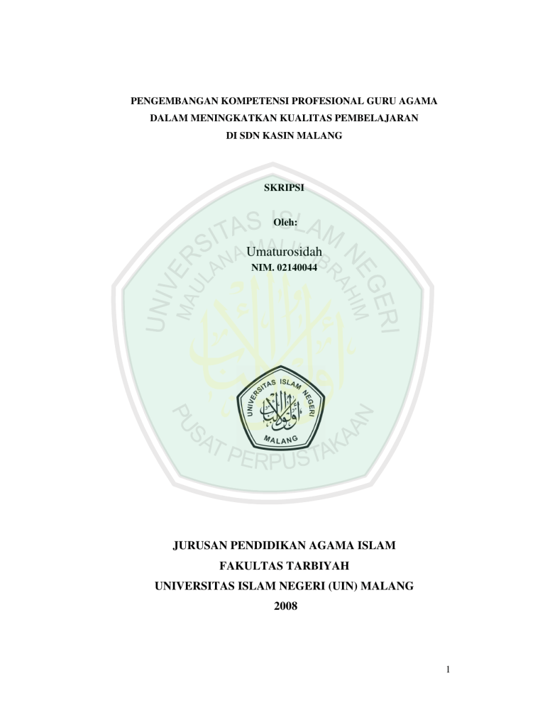 PENGEMBANGAN KOMPETENSI PROFESIONAL GURU AGAMA DALAM MENINGKATKAN KUALITAS PEMBELAJARAN DI SDN KASIN MALANG SKRIPSI Oleh: Umaturosidah NIM. 02140044 JURUSAN PENDIDIKAN AGAMA ISLAM FAKULTAS TARBIYAH UNIVERSITAS ISLAM NEGERI (UIN) MALANG 2008 1 PENGEMBANGAN KOMPETENSI PROFESIONAL GURU AGAMA DALAM MENINGKATKAN KUALITAS PEMBELAJARAN DI SDN KASIN MALANG Diajukan kepada fakultas tarbiyah universitas negeri malang Untuk memenuhi salah satu persyaratan guna memperoleh gelar Strata satu sarjana pendidikan islam (S.Pd) oleh: Umaturosidah NIM. 02140044 JURUSAN PENDIDIKAN AGAMA ISLAM FAKULTAS TARBIYAH UNIVERSITAS ISLAM NEGERI (UIN) MALANG 2008 2 HALAMAN PERSETUJUAN SKRIPSI PENGEMBANGAN KOMPETENSI PROFESIONAL GURU AGAMA DALAM MENINGKATKAN KUALITAS PEMBELAJARAN DI SDN KASIN MALANG Oleh: Umaturosidah 02140044 Telah disetujui pada tanggal 21 Januari 2007 Oleh dosen pembimbing Dr. H.M Samsul Hady, M.A NIP. 150267254 Mengetahui Ketua Jurusan Pendidikan Agama Islam Drs. Moh. Padil,M.Pdi NIP.150267235 3 PENGEMBANGAN KOMPETENSI PROFESIONAL GURU AGAMA DALAM MENINGKATKAN KUALITAS PEMBELAJARAN DI SDN KASIN MALANG SKRIPSI Di persembahkan dan disusun oleh Umaturosidah (0214044) Telah dipertahankan di depan dewan penguji pada tanggal 28 Januari 2008 Dengan nilai B Dan telah dinyatakan diterima sebagai salah satu persyaratan untuk memperoleh gelar starata satu Sarjana Agama Pendidikan Islam (S.Pd.I) Pada tanggal:25 April 2008 Panitia Ujian Ketua Sidang Sekretaris siding Dr. H.M. Samsul Hady, M.A NIP:150267254 Penguji Utama Triyo Supriyatno, M.Ag NIP:150311702 Pembimbing Prof. Dr. H.M. Djunaidi Ghony NIP:150042031 Dr. H.M. Samsul Hady, M.A NIP:150267254 Mengesahkan Dekan Fakultas Tarbiyah Universitas Islam Negeri Malang Prof. Dr. H.M. Djunaidi Ghony NIP:150042031 4 PERSEMBAHAN Kupersembahakan karya ilmiah ini khusus kepada 1. Ayah dan ibu yang telah mengasuh dengan mendidiku dengan penuh keihlasan dan cinta kasih. 2. Kakak-kakakku mb mulik, mas qosim yang telah memberikan motivasi dan semangat sehingga penulis bisa menyelesaikan penyusunan sekripsi ini dengan baik dan lancar. 3. Mas Surur, mb Anik yang telah memberikan motivasi dan do’a sehingga penulis bisa menyelesaikan karya ilmiah ini dengan baik. 4. Mas Huda, de’ Afif yang membantu demi kelancaran penulisan karya ilmiyah. 5. temen-temenku di 611KK mb Ciwik, Nuri, Anyak, Ulpe, Umbal terimakasih untuk semua. 5 MOTTO “Dan hendaklah diantara kamu segolongan umat yang menyeru kepada kebajikan, meneyeru kepada yang ma’ruf dan mencegah dari yang mungkar merekalah orang yang beruntung” (Q.S Ali’Imron 104) 6 SURAT PERNYATAAN Dengan ini saya menyatakan, bahwa dalam sekripsi ini tidak terdapat karya yang pernah diajukan untuk memperoleh gelar kesarjanaan pada suatu program tinggi, dan sepanjang pengetahuan saya, juga tidak terdapat karya atau pendapat yang pernah ditilis atau diterbitkan oleh orang lain, kecuali yang secara tertulis diacu dalam naskah ini dan disebutkan dalam daftar pustaka. Malang, 17 Januari 2008 Umaturosidah 7 KATA PENGANTAR Segala puji dan syukur senantiasa penulis panjatkan kehadirat Allah SWT. Yang telah melimpahkan segala rahmat, taufik hidayahNya, sehingga penulis dapat menyelesaikan sekripsi ini yang berjudul “ Pengembangan Kompetensi Guru Agama dalam meningkatkan kualitas pembelajaran di SDN Kasin Malang”. Sholawat serta salam semoga senan tiasa tetap tercurahkan kepada junjungan kita Nabi Muhammad beserta keluarga dan sahabatnya, yang telah membawa kita dari zaman kegelapan dan kebodohan menuju ilmu pengetahuan dan keselamatan. Selanjutnya dengan terselesainya penulisan sekripsi ini, saya mengucapkan banyak terima kasih terutama saya sampaikan kepada yang terhormat: 1. Ayah (Markum Suekarno) dan Ibu (Aminatun) yang tiada henti-hentinya memberikan kasih sayangnya yang tanpa batas, baik dalam aspek moril maupun materiil. 2. Prof. Dr. H. Imam Suprayogo, selaku Rektor Universitas Islam Negeri Malang beserta stafnya yang telah memberikan kesempatan dan pelayanan kepada penulis untuk menyelesaikan studi di kampus UIN Malang. 3. Prof. Dr. H.M. Djunaidi Ghony, selaku Dekan Fakultas Tarbiyah. 4. Bapak Drs. Moh Padil, M.Pdi, selaku ketua jurusan Pendidikan Agama Islam. 5. Bapak Dr. H.M. Samsul Hady, M. Ag, selaku dosen pembimbing yang telah tulus ihlas dan penuh kesabaran memberikan bimbingan, arahan dan nasehat kepada penulis sehingga terselesaikan sekripsi ini. 8 6. Bapak Drs. Didik Bekti Purwianto, selaku kepala sekolah SDN Kasin Malang, beserta Ibu Lilik Maslikhah selaku guru agama, dan karyawan yang telah bersedia memberikan izin kepada penulis untuk mengadakan penelitian serta banyak memberikan informasi yang penulis butuhkan. 7. Bapak dan Ibu Dosen yang budiman, yang telah mengukir jiwa penulis dengan ilmu selama menyelesaikan studi di UIN Malang. 8. Sahabat-sahabatku D2’ 02, yang dengan rasa persaudaraan dan kesetiaan selalu bersatu dan berjuang bersama dalam meraih kesuksesan. 9. Semua pihak yang ikut membantu dan memberikan sumbangan pikiran dalam rangka menyelesaikan sekripsi ini yang tidak dapat penulis sebutkan satupersatu. Akhirnya dengan ketulusan hati, penulis menyadari bahwa dalam penulisan sekripsi ini, masih banyak kekurangan dan kejanggalan karena itulah kritik dan saran yang bersifat membangun senantiasa penulis harapkan demi kebaikan dan kesempurnaan sekripsi ini. Hanya kepada Allah SWT kami mengharapkan ridloNya, semoga amal baik mereka diterima dan sekripsi ini bermanfaat bagi penulis khususnya dan para pembaca sekripsi ini pada umumnya. Amin yaa Robbal Alamin. Malang, 17 Januari 2008 Penulis 9 DAFTAR TABEL TABEL I : Keadaan Guru Dan Pegawai Tahun Ajaran 2007-2008................. 68 TABEL II: Pembagian Tugas Guru dan Pegawai Tahun Ajaran 2007-2008 .............................................................. 69 TABEL III : Keadaan Siswa Tahun Ajaran 2007-2008................................... 71 TABEL IV : Program Sekolah Tahun Pelajaran 2007-2008 ........................... 72 TABEL V : Program Pengembangan S