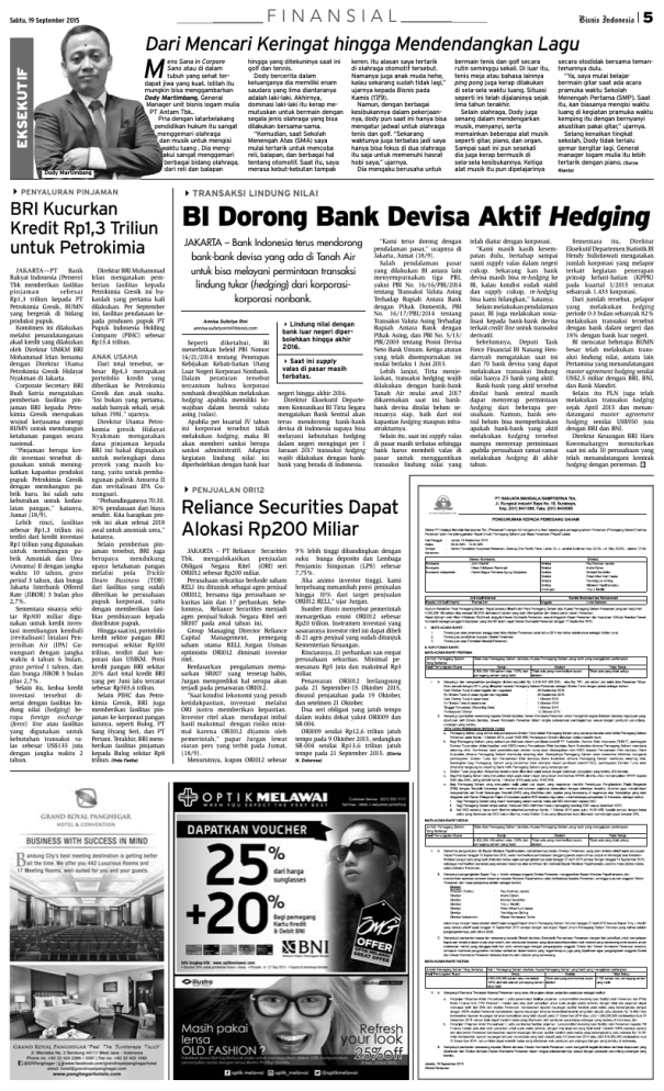 5 FINANSIAL Sabtu, 19 September 2015 Dari Mencari Keringat hingga Mendendangkan Lagu EKSEKUTIF M Dody Martimbang ens Sana in Corpore Sano atau di dalam tubuh yang sehat terdapat jiwa yang kuat. Istilah itu mungkin bisa menggambarkan Dody Martimbang, General Manager unit bisnis logam mulia PT Antam Tbk.. Pria dengan latarbelakang pendidikan hukum itu sangat menggemari olahraga dan musik untuk mengisi waktu luang . Dia mengakui sangat menggemari berbagai bidang olahraga, dari reli dan balapan PENYALURAN PINJAMAN BRI Kucurkan Kredit Rp1,3 Triliun untuk Petrokimia JAKARTA—PT Bank Rakyat Indonesia (Persero) Tbk memberikan fasilitas pinjaman sebesar Rp1,3 triliun kepada PT Petrokimia Gresik, BUMN yang bergerak di bidang produksi pupuk. Komitmen ini dilakukan melalui penandatanganan akad kredit yang dilakukan oleh Direktur UMKM BRI Mohammad Irfan bersama dengan Direktur Utama Petrokimia Gresik Hidayat Nyakman di Jakarta. Corporate Secretary BRI Budi Satria mengatakan pemberian fasilitas pinjaman BRI kepada Petrokimia Gresik merupakan wujud kerjasama sinergi BUMN untuk membangun ketahanan pangan secara nasional. “Pinjaman berupa kredit investasi tersebut digunakan untuk meningkatkan kapasitas produksi pupuk Petrokimia Gresik dengan membangun pabrik baru. Ini salah satu kebutuhan untuk kedaulatan pangan,” katanya, Jumat (18/9). Lebih rinci, fasilitas sebesar Rp1,3 triliun ini terdiri dari kredit investasi Rp1 triliun yang digunakan untuk membangun pabrik Amoniak dan Urea (Amurea) II dengan jangka waktu 10 tahun, grass period 3 tahun, dan bunga Jakarta Interbank Offered Rate (JIBOR) 3 bulan plus 2,7%. Sementara sisanya sekitar Rp300 miliar digunakan untuk kredit investasi membangun kembali (revitalisasi) Intalasi Penjernihan Air (IPA) Gunungsari dengan jangka waktu 4 tahun 6 bulan, grass period 1 tahun, dan dan bunga JIBOR 3 bulan plus 2,7%. Selain itu, kedua kredit investasi tersebut disertai dengan fasilitas lindung nilai (hedging) berupa foreign exchange (forex) line atau fasilitas yang digunakan untuk kebutuhan transaksi valas sebesar US$135 juta dengan jangka waktu 2 tahun. Direktur BRI Muhammad Irfan mengatakan pemberian fasilitas kepada Petrokimia Gresik ini bukanlah yang pertama kali dilakukan. Per September ini, fasilitas pendanaan kepada produsen pupuk PT Pupuk Indonesia Holding Company (PIHC) sebesar Rp13,4 triliun. ANAK USAHA Dari total tersebut, sebesar Rp4,3 merupakan portofolio kredit yang diberikan ke Petrokimia Gresik dan anak usaha. “Ini bukan yang pertama, sudah banyak sekali, sejak tahun 1981,” ujarnya. Direktur Utama Petroko mia gresik Hidayat Nyak man mengatakan dana pinjaman kepada BRI ini bakal digunakan untuk melengkapi dana proyek yang masih kurang, yaitu untuk pembangunan pabrik Amurea II dan revitalisasi IPA Gunungsari. “Perbandingannya 70:30. 30% pendanaan dari biaya sendiri. Kita harapkan proyek ini akan selesai 2018 awal untuk amoniak urea,” katanya. Selain pemberian pinjaman tersebut, BRI juga berupaya mendukung upaya ketahanan pangan melalui pola Trickle Down Business (TDB) dari fasilitas yang sudah diberikan ke perusahaan pupuk korporasi, yaitu dengan memberikan fasilitas pembiayaan kepada distributor pupuk. Hingga saat ini, portofolio kredit sektor pangan BRI mencapai sekitar Rp100 triliun, terdiri dari korporasi dan UMKM. Porsi kredit pangan BRI sekitar 20% dari total kredit BRI yang per Juni lalu tercatat sebesar Rp503,6 triliun. Selain PIHC dan Petrokimia Gresik, BRI juga memberikan fasilitas pinjaman ke korporasi pangan lainnya, seperti Bulog, PT Sang Hyang Seri, dan PT Pertani. Terakhir, BRI memberikan fasilitas pinjaman kepada Bulog sekitar Rp8 triliun. (Ihda Fadila) hingga yang ditekuninya saat ini golf dan tennis. Dody bercerita dalam keluarganya dia memiliki enam saudara yang lima diantaranya adalah laki-laki. Akhirnya, dominasi laki-laki itu kerap memutuskan untuk bermain dengan segala jenis olahraga yang bisa dilakukan bersama-sama. “Kemudian, saat Sekolah Menengah Atas (SMA) saya mulai tertarik untuk mencoba reli, balapan, dan berbagai hal tentang otomotif. Saat itu, saya merasa kebut-kebutan tampak keren. Itu alasan saya tertarik di olahraga otomotif tersebut. Namanya juga anak muda hehe, kalau sekarang sudah tidak lagi,” ujarnya kepada Bisnis pada Kamis (17/9). Namun, dengan berbagai kesibukannya dalam pekerjaannya, dody pun saat ini hanya bisa mengatur jadwal untuk olahraga tenis dan golf. “Sekarang waktunya juga terbatas jadi saya hanya bisa fokus di dua olahraga itu saja untuk memenuhi hasrat hobi saya,” ujarnya. Dia mengaku berusaha untuk bermain tenis dan golf secara rutin seminggu sekali. Di luar itu, tenis meja atau bahasa lainnya ping pong juga kerap dilakukan di sela-sela waktu luang. Situasi seperti ini telah dijalaninya sejak lima tahun terakhir. Selain olahraga, Dody juga senang dalam mendengarkan musik, menyanyi, serta memainkan beberapa alat musik seperti gitar, piano, dan organ. Sampai saat ini pun sesekali dia juga kerap bermusik di sela-sela kesibukannya. Ketiga alat musik itu pun dipelajarinya secara otodidak bersama temantemannya dulu. “Ya, saya mulai belajar bermain gitar saat ada acara pramuka waktu Sekolah Menengah Pertama (SMP). Saat itu, kan biasanya mengisi waktu luang di kegiatan pramuka waktu kemping itu dengan bernyanyi akustikan pakai gitar,” ujarnya. Selang kenaikan tingkat sekolah, Dody tidak terlalu gemar bergitar lagi. General manager logam mulia itu lebih tertarik dengan piano. (Surya Rianto) TRANSAKSI LINDUNG NILAI BI Dorong Bank Devisa Aktif Hedging JAKARTA – Bank Indonesia terus mendorong bank-bank devisa yang ada di Tanah Air untuk bisa melayani permintaan transaksi lindung tukar (hedging) dari korporasikorporasi nonbank. Annisa Sulistyo Rini annisa.sulistyorini@bisnis.com Seperti diketahui, BI menerbitkan beleid PBI Nomor 16/21/2014 tentang Penerapan Kebijakan Kehati-hatian Utang Luar Negeri Korporasi Nonbank. Dalam peraturan tersebut tercantum bahwa korporasi nonbank diwajibkan mela