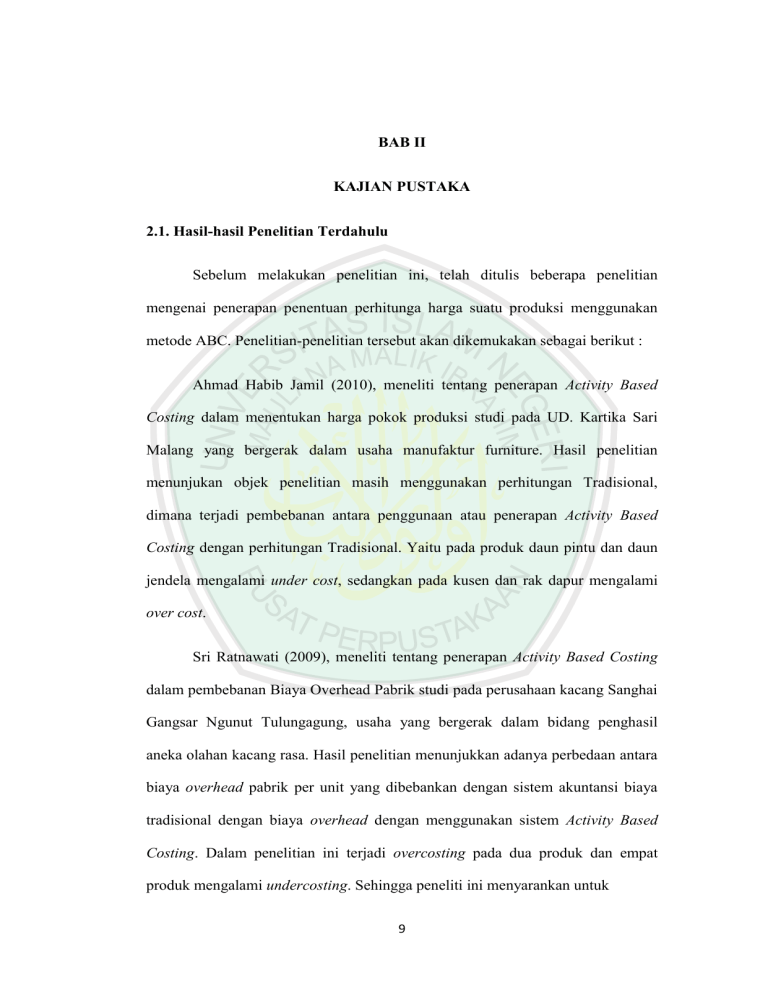 BAB II KAJIAN PUSTAKA 2.1. Hasil-hasil Penelitian Terdahulu Sebelum melakukan penelitian ini, telah ditulis beberapa penelitian mengenai penerapan penentuan perhitunga harga suatu produksi menggunakan metode ABC. Penelitian-penelitian tersebut akan dikemukakan sebagai berikut : Ahmad Habib Jamil (2010), meneliti tentang penerapan Activity Based Costing dalam menentukan harga pokok produksi studi pada UD. Kartika Sari Malang yang bergerak dalam usaha manufaktur furniture. Hasil penelitian menunjukan objek penelitian masih menggunakan perhitungan Tradisional, dimana terjadi pembebanan antara penggunaan atau penerapan Activity Based Costing dengan perhitungan Tradisional. Yaitu pada produk daun pintu dan daun jendela mengalami under cost, sedangkan pada kusen dan rak dapur mengalami over cost. Sri Ratnawati (2009), meneliti tentang penerapan Activity Based Costing dalam pembebanan Biaya Overhead Pabrik studi pada perusahaan kacang Sanghai Gangsar Ngunut Tulungagung, usaha yang bergerak dalam bidang penghasil aneka olahan kacang rasa. Hasil penelitian menunjukkan adanya perbedaan antara biaya overhead pabrik per unit yang dibebankan dengan sistem akuntansi biaya tradisional dengan biaya overhead dengan menggunakan sistem Activity Based Costing. Dalam penelitian ini terjadi overcosting pada dua produk dan empat produk mengalami undercosting. Sehingga peneliti ini menyarankan untuk 9 10 menggunakan sistem Aktivity Based Costing karena lebih akurat dalam pembebanan biaya overhead pabrik. Pratiwi Estiningtyas (2007), meneliti tentang penerapan ABC sebagai dasar penetapan harga pokok produksi studi pada CV. Sultan Agung Craft. Hasil penelitian bahwa perhitungan dengan biaya ABC dengan sistem ABT. Dengan sistem ABC produk dengan volume produk tinggi mengalami overcosting atau pembebanan biaya yang terlalu tinggi yaitu pada produk folding chair dan folding arm chair dan coralia folding arm chair, Untuk produk bervolume produksi rendah terjadi undercosting yaitu pada produk oval table dan produk rectanguler table. Tabel 2.1 Penelitian terdahulu No 1 Nama, Tahun, Judul Penelitian Ahmad Habib Jamil, 2010, Penerapan Activity Based Costing dalam Menetukan Harga Pokok Produk UD. Kartika Sari Malang. Variabel dan indikator atau Metode/An Fokus alisis Data Penelitian Biaya Bahan Analisis Langsung, Biaya Kualaitatif Tenaga Kerja Deskriptif Langsung, Biaya overhead, Harga pokok produksi Hasil Penelitian Hasil penelitian menunjukkan perhitungan dengan sistem Activity Based Costing dengan volume produk rendah mengalami undercost atau pembebanan biaya terlalu rendah yaitu pada produk daun jendela dan daun pintu, untuk produk bervolume tinggi mengalami overcost atau pembebanan biaya terlalu tinggi yaitu pada produk kusen dan produk rak dapur. 11 2 Sri Ratnawati, 2009, Penerapan Activity Based Coating dalam Pembebanan Biaya Overhead Pabrik Studi Pada Perusahaan Kacang Sanghai Gangsar Ngunut Tulungagung Biaya Bahan Analisis Baku Langsung, Kualitatif Biaya Tenaga Deskriptif Kerja Langsung, Alokasi Biaya Overhead Pabrik 3 Pratiwi Estiningtyas, 2007, Penerapan Activity Based Costing Sebagai Dasar Penetapan Harga Pokok Produksi Studi Pada CV. Sultan Agung Craft Biaya Bahan Metode Langsung, Biaya Kualitatif Tenaga Kerja Deskriptif Langsung, Biaya overhead, Harga pokok produksi 4 Nur Maryam, 2005, Analisis Penerapan Activity Based Costing Pada PTPN XI PG. Djatiroto Biaya Produksi Metode Gula dan Tetes Kuantitatif tahun 2002 dan 2003 Dengan menerapkan Activity Based Costing dalam pembebanan overhead biaya produksi terlalu tinggi mengalami overcosting pada dua produk yaitu HC dan 84 dan pada empat produk pembebanan biaya terlalu rendah, sehingga mengalami undercosting. Maka peneliti ini menyarankan untuk menggunakan sistem Aktivity Based Costing karena lebih akurat dalam pembebanan biaya overhead pabrik. Hasil penelitian bahwa perhitungan dengan sistem Activity Based Costing produk dengan volume produk tinggi mengalami overcosting atau pembebanan biaya yang terlalu tinggi yaitu pada produk folding chair dan folding arm chair dan coralia folding arm chair, Untuk produk bervolume produksi rendah terjadi undercosting yaitu pada produk oval table dan produk rectanguler table. Hasil penelitian menyatakan bahwa dengan menggunakan alat analisis dua tahap, tahap pertama dengan empat langkah kemudian dilakukan tahap selnjutnya memperoleh hasil dengan perhitungn HPP dan pembebanan 12 5 Eni Soliha, 2007, Penggunaan Activity Based Costing Dalam Perhitungan Harga Pokok Produksi PG. Kebon Agung Malang Biaya bahan Metode langsung, Biaya Kualitatif tenaga kerja Deskriptif langsung, Biaya overhead, Harga pokok produksi 6 Miftakhul Roifah, 2014, Perancangan Activity Based Costing Dalam Meningkatkan Akurasi Perhitungan Harga Pokok Produksi Pada PT. PG. Krebet Baru Bululawang Malang Biaya bahan Metode baku langsung, Kualitatif Biaya Tenaga Deskriptif Kerja Langsung, Biaya overhead pabrik, Harga pokok produksi, Harga jual. BOP diperoleh selisih kedua perhitungan produk tahun 2002 lebih rendah dari pada perhitungan tahun 2003. Sehingga dapat disimpulkan perusahaan menggunakan penerapan Activity Based Costing. Hasil penelitian bahwa perhitungan dengan Activity Based Costing produk dengan volume produk tinggi mengalami overcosting atau pembebanan biaya yang terlalu tinggi yaitu pada produk Gula, Untuk produk bervolume produksi rendah terjadi undercosting yaitu pada produk Tetes. Hasil penelitian bahwa perhitungan dengan menggunakan activity based costing produk bervolume banyak mengalami overcosting yaitu pada produk gula dengan memperoleh harga jual murah, untuk produk bervolume sedikit terjadi undercosting yaitu pada produk tetes dengan memperoleh harga jual tinggi. Sumber: Data diolah Dalam penelitian ini terdapat perbedaan dan persamaan dengan penelitian terdahulu. Adapun persamaan dan perbedaan penelitian ini dengan penelitian terdahulu disajikan dalam tabel 2.2 sebagai berikut : 13 Tabel 2.2 Persamaan dan Perbedaan Penelitian Terdahulu dan